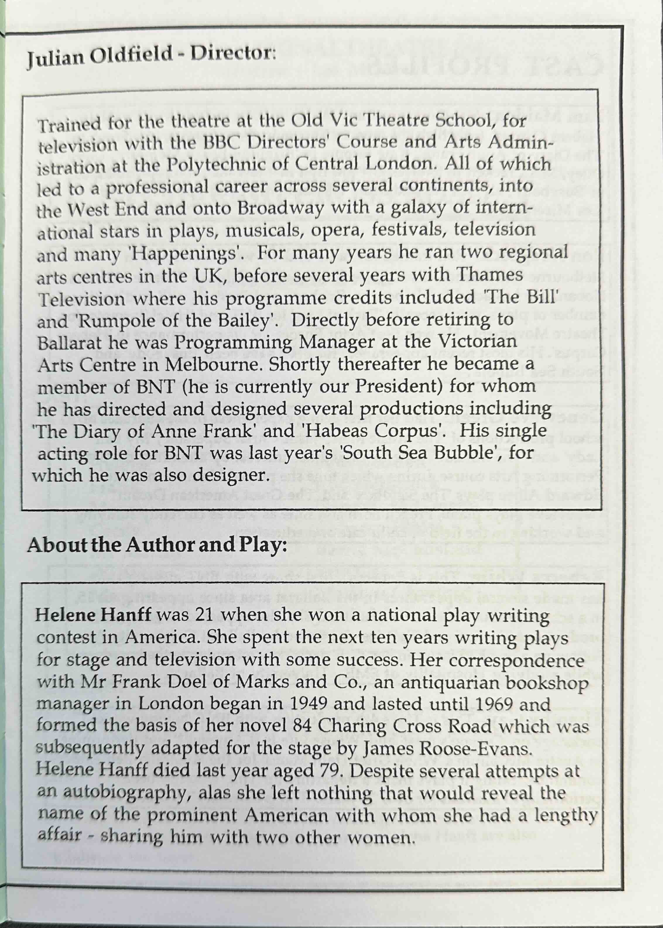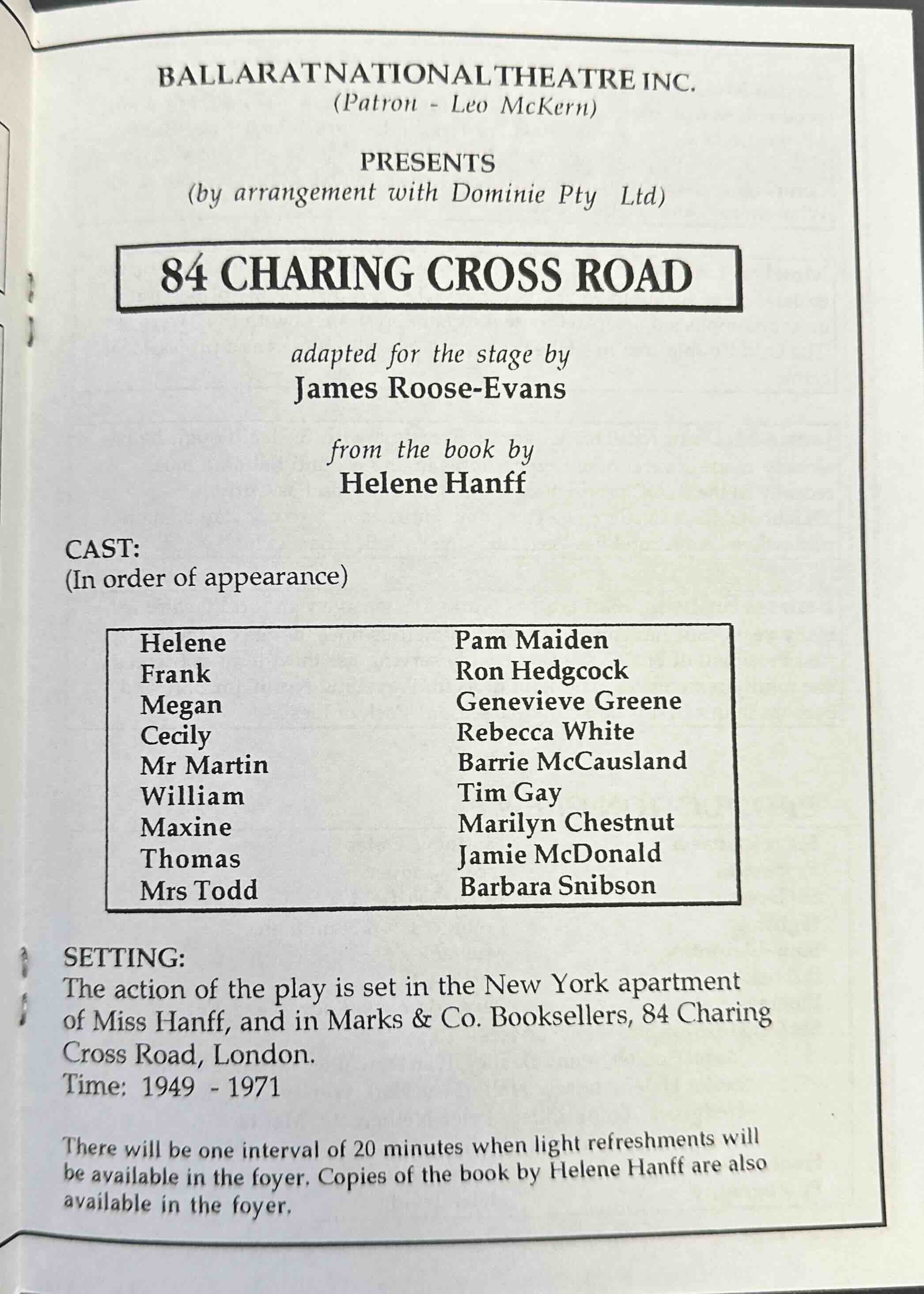 The play takes place over a twenty year period, beginning in 1949 when Helene Hanff (played on Broadway by Ellen Burstyn) first writes Marks & Co. and ends in 1969 with the death of Frank Doel, the delightfully dusty supplier of so many old volumes to Helen who has shown her gratitude through the years by sending "care packages" to the staff of Marks & Co.