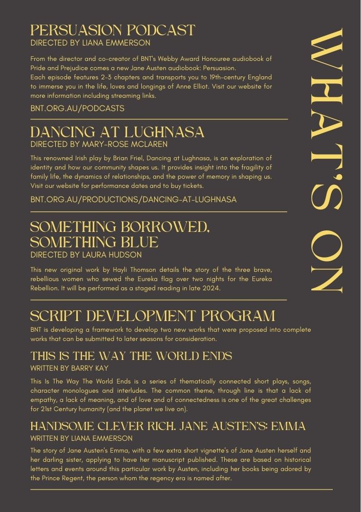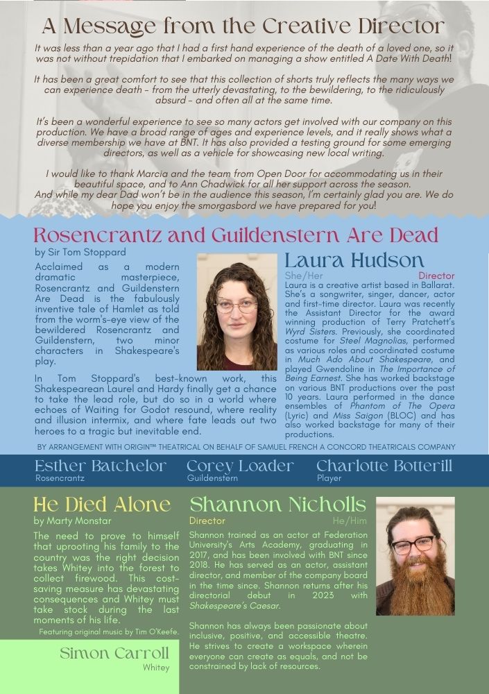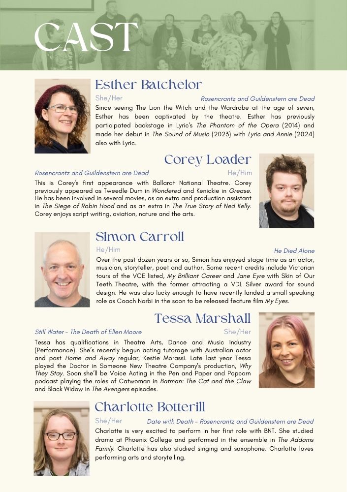 Shannon trained as an actor at Federation University's Arts Academy, graduating in 2017, and has been involved with BNT since 2018. He has served as an actor, assistant director, and member of the company board in the time since. Shannon returns after his directorial debut in 2023 with Shakespeare’s Caesar.