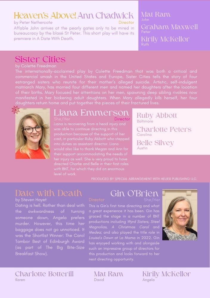This is Gin's first time directing and she is starting small! Gin has graced the stage in a number of BNT productions including Wyrd Sisters, Steel Magnolias, A Christmas Carol and Medea. Gin also played the title role in Louisa's Dawn at La Mama in 2022. Coming from a dance background, Gin has taken on the role of choreographer for Jekyll and Hyde (BLT) and two musicals with Hutt City Musical Theatre (NZ). Gin is looking forward to working with and alongside such an impressive group of directors for this production.
