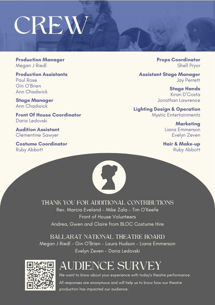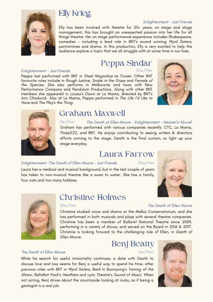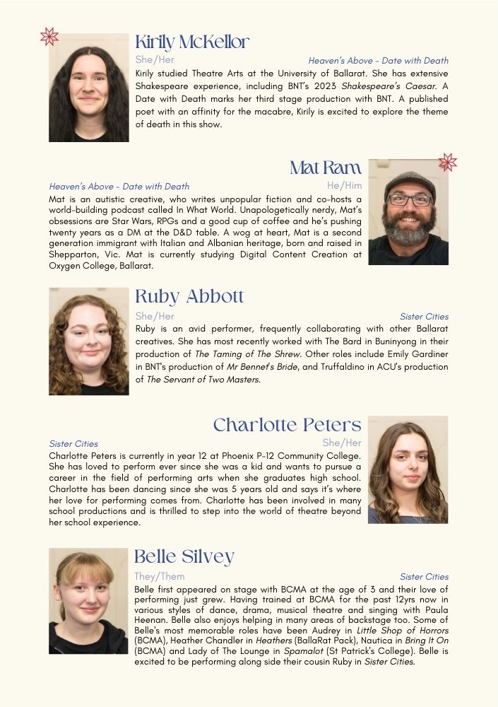 A familiar face in local to Ballarat Theatre spaces, this is Ruby's first time directing. She has recently performed in Wyrd Sisters for BNT, and in Les Misérables with Ballarat Lyric Theatre. She was recognized for her work on Wyrd Sisters with a BNT Community Contribution Award for Production.