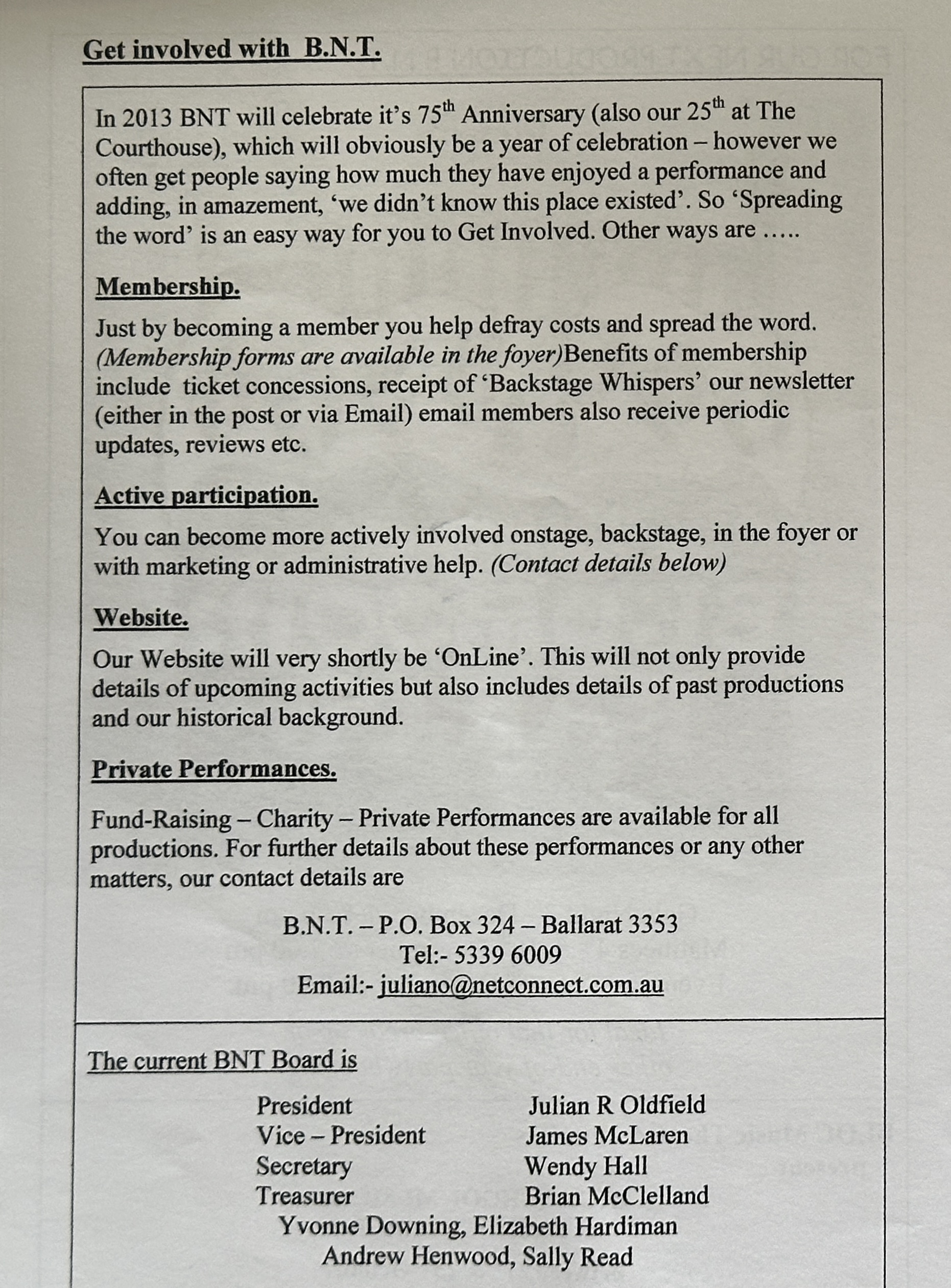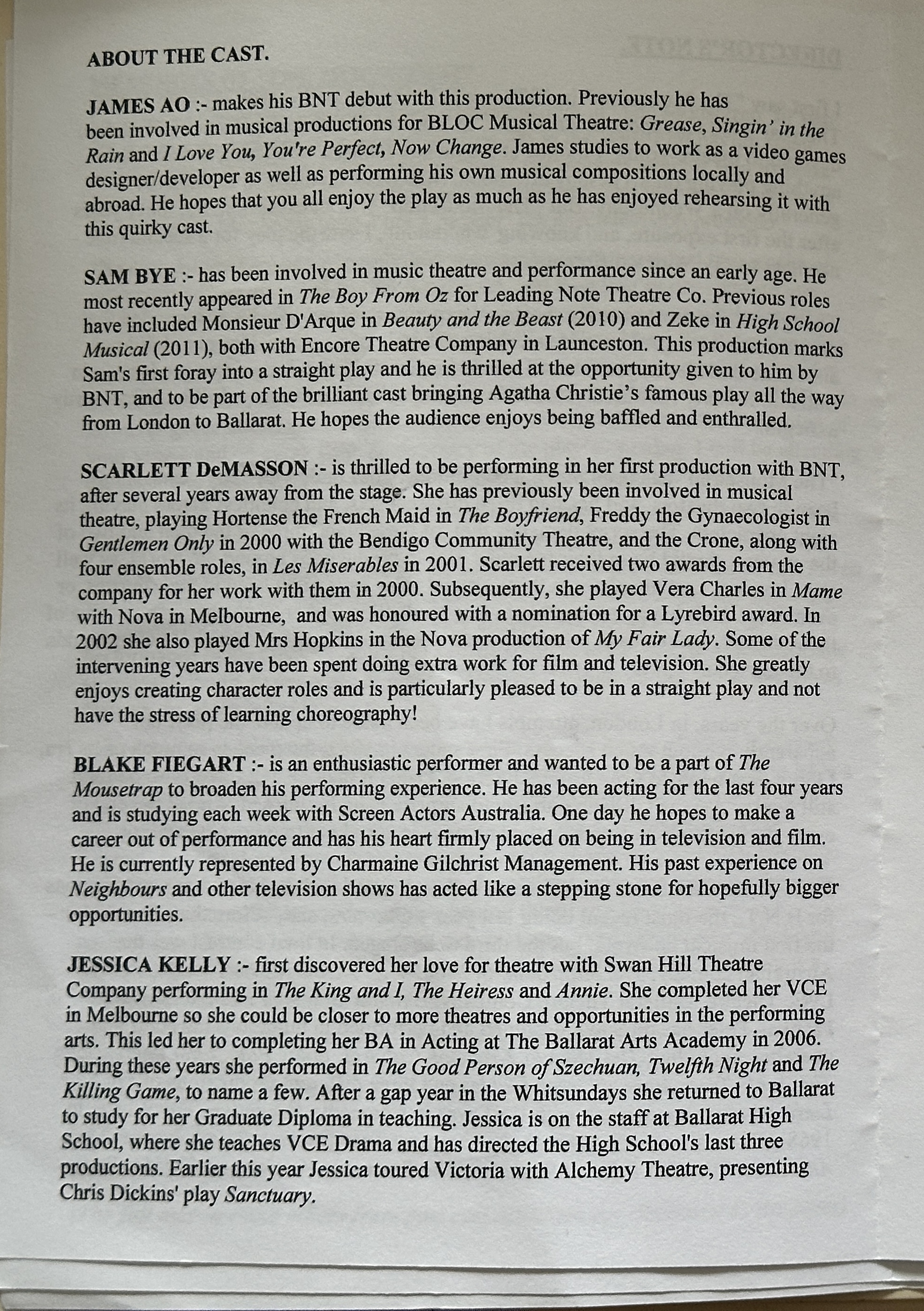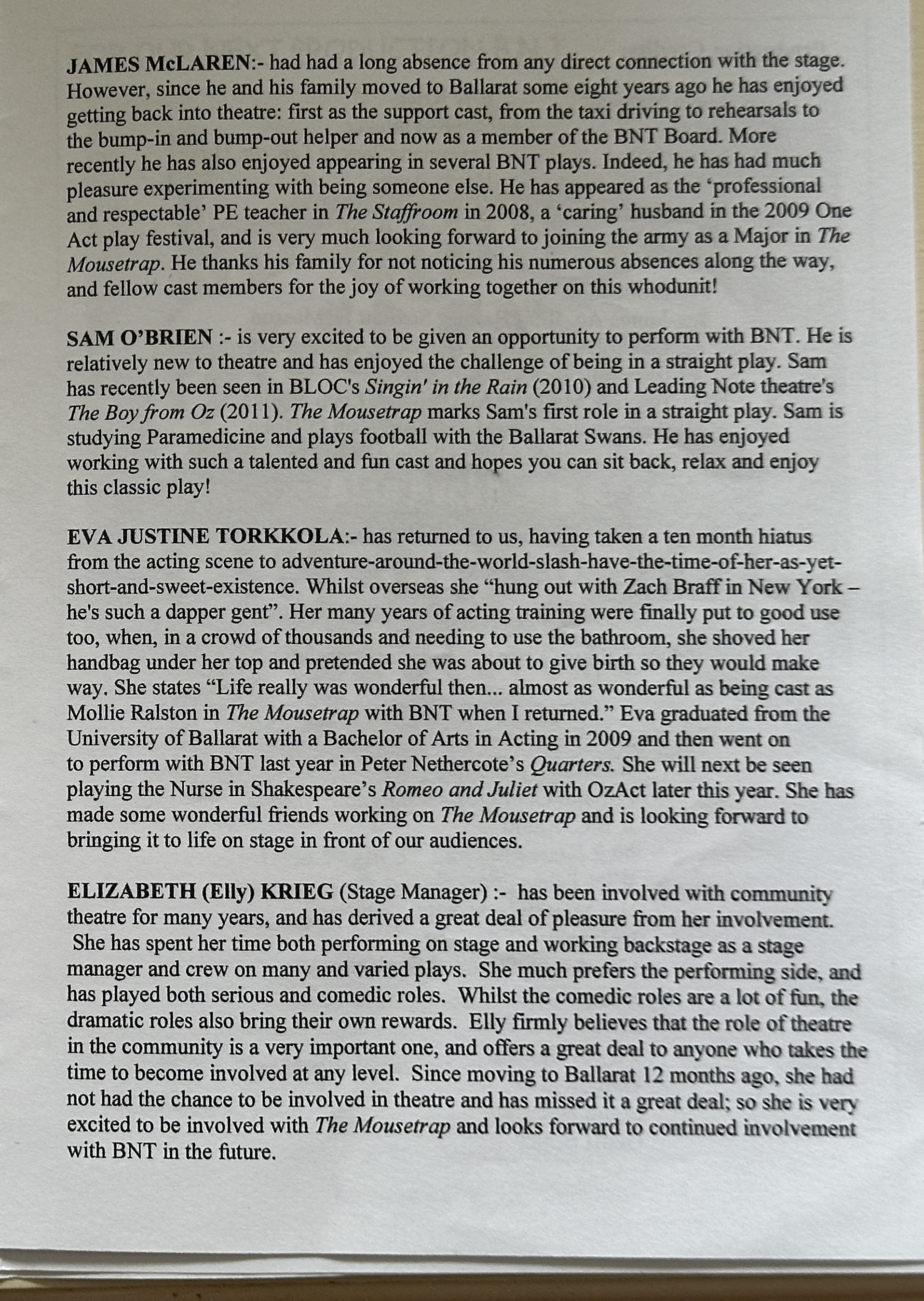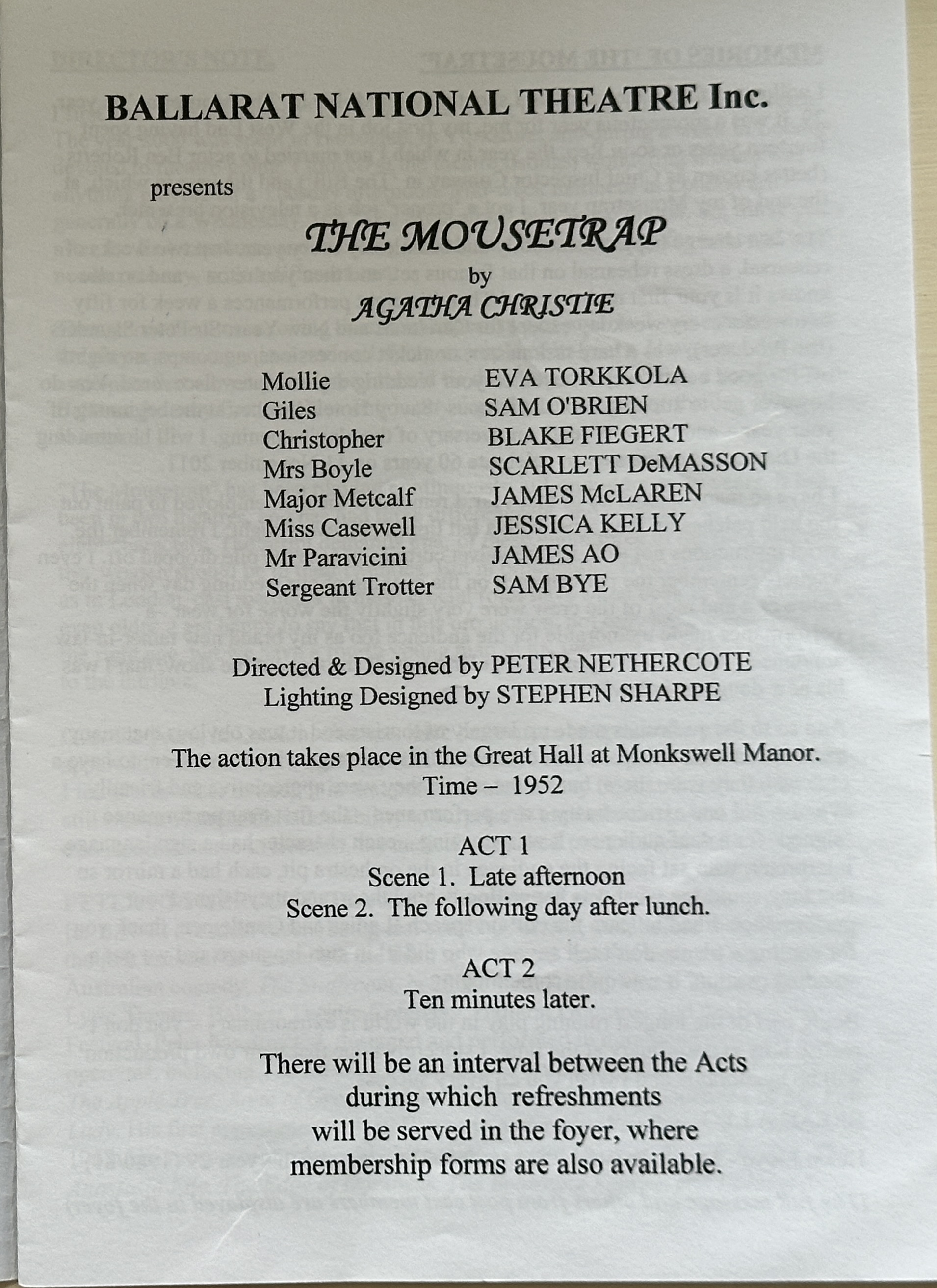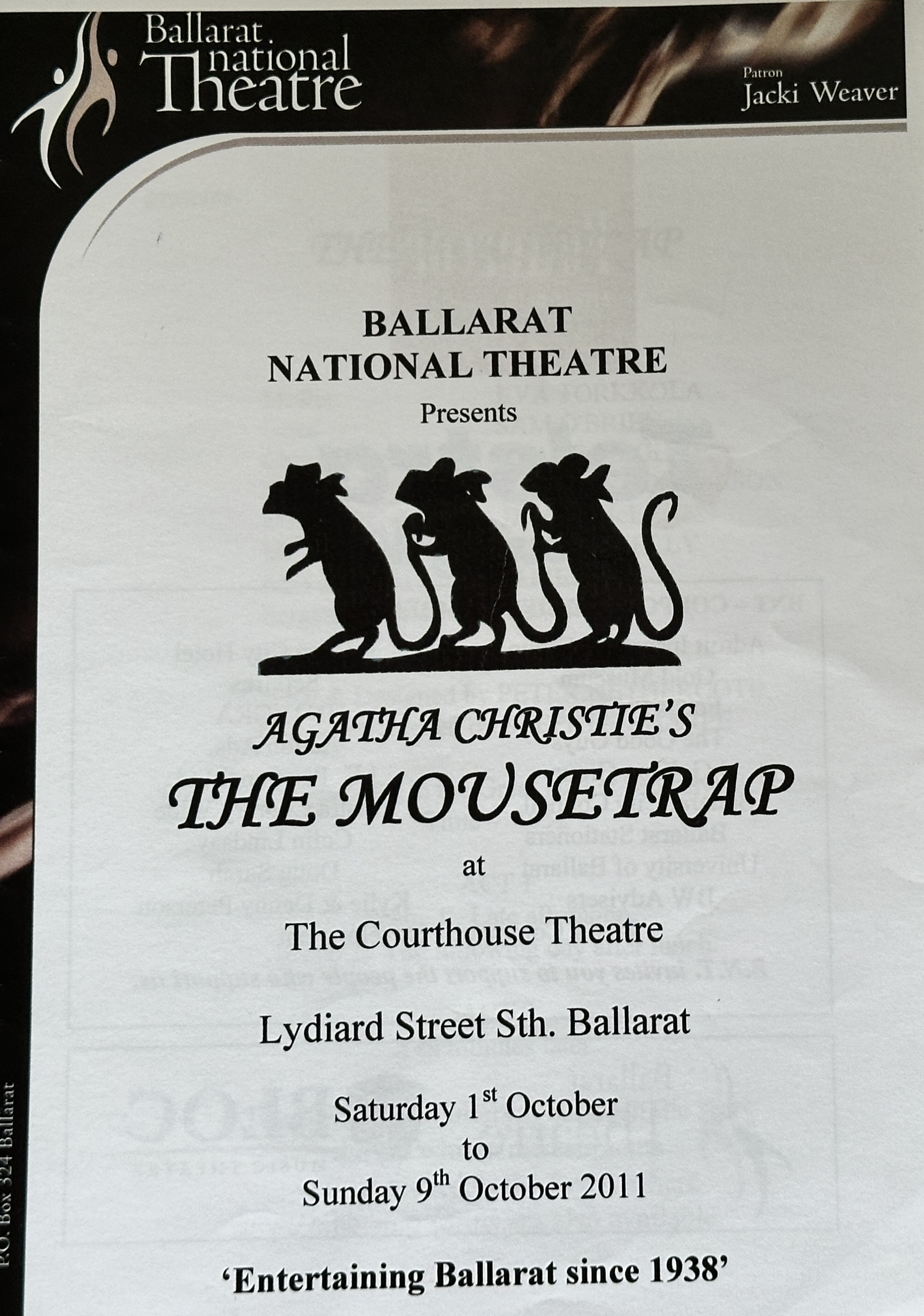 The youthful and enthusiastic cast work very well together to sustain the suspense and make the most of more humorous moments. Under the guidance of experienced director Peter Nethercote, who also designed the effective set, they are giving Ballarat audiences a chance to see this legendary play in home town comfort. If you have never seen The Mouse Trap this is your chance to find out what the fuss is all about, and if you have been lucky enough to see it in London, come along and relive your memories. Just don’t ever tell anyone ‘who-dun-it’!