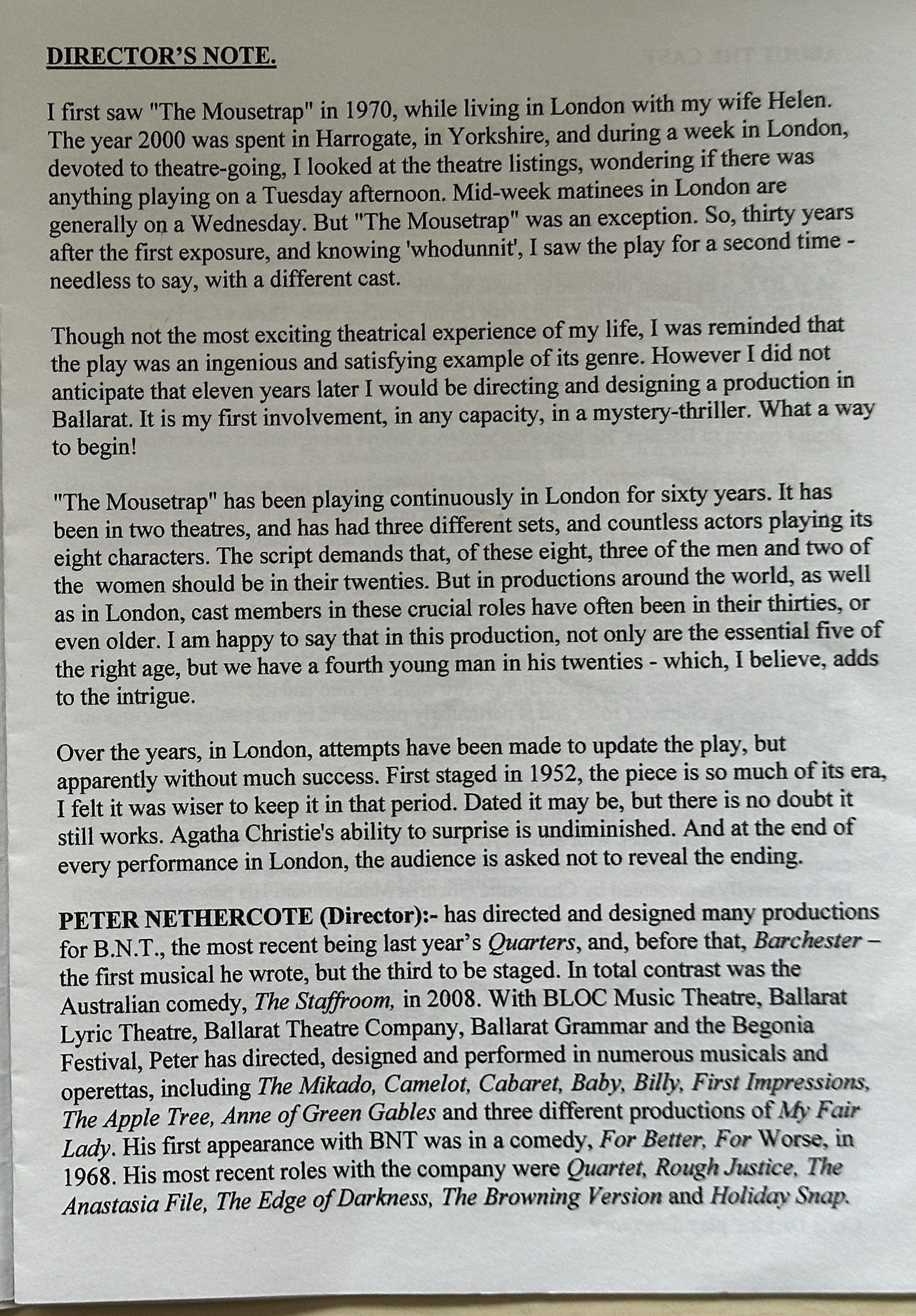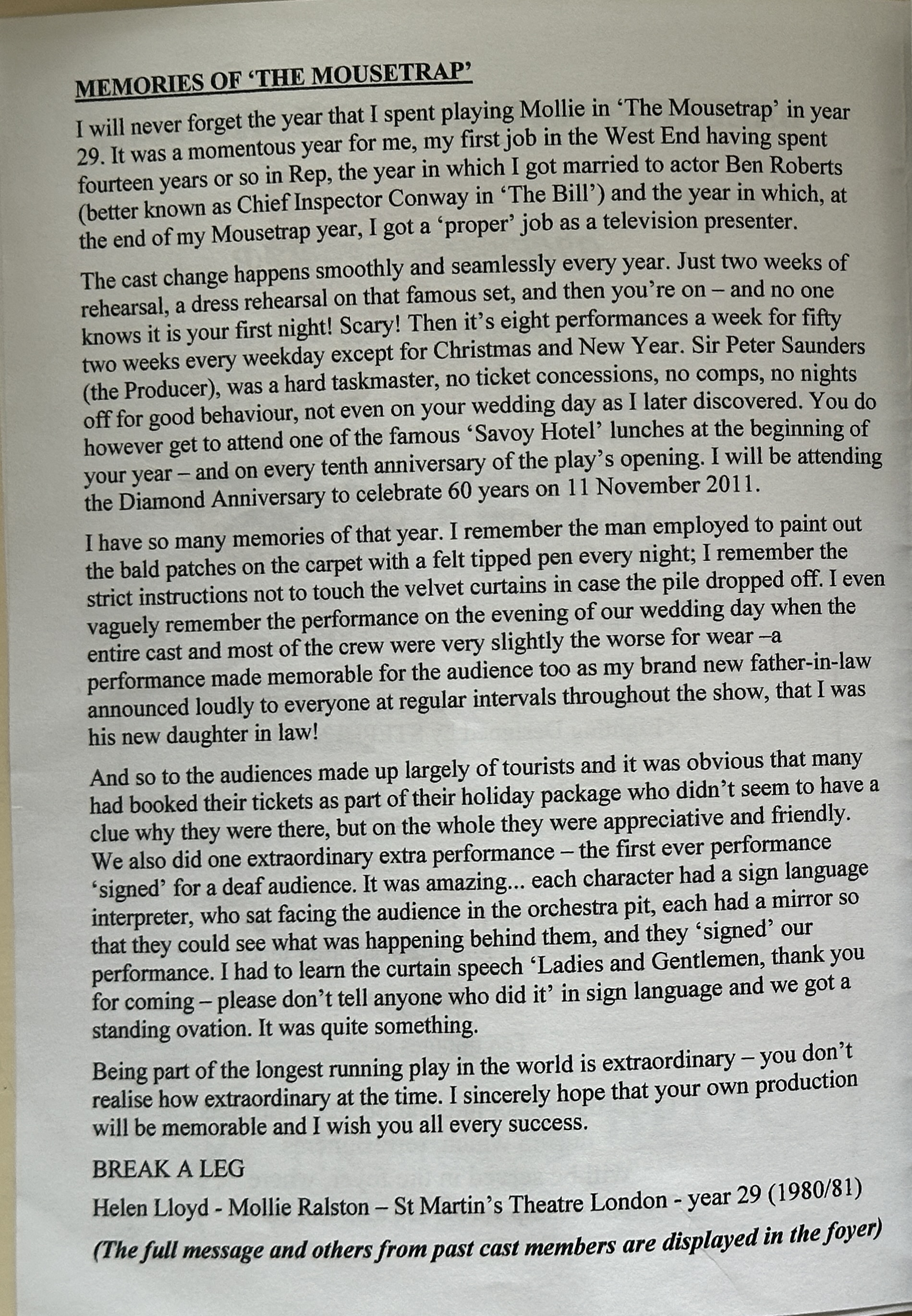 During the run of the play there was an "Agatha Christie' exhibition in the Foyer. The company was deighted to have messages of good luck from both the current London Cast and several actors who have been in the play over the past sixty years.