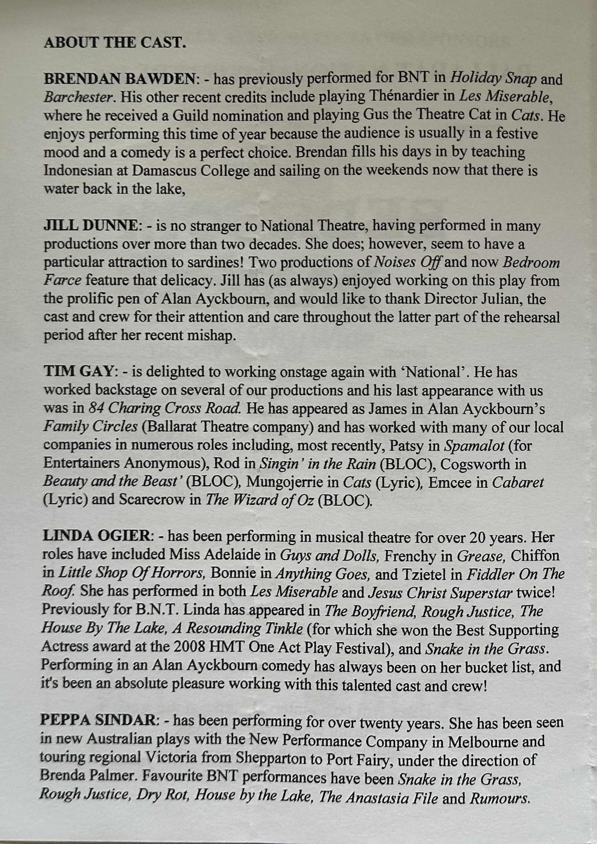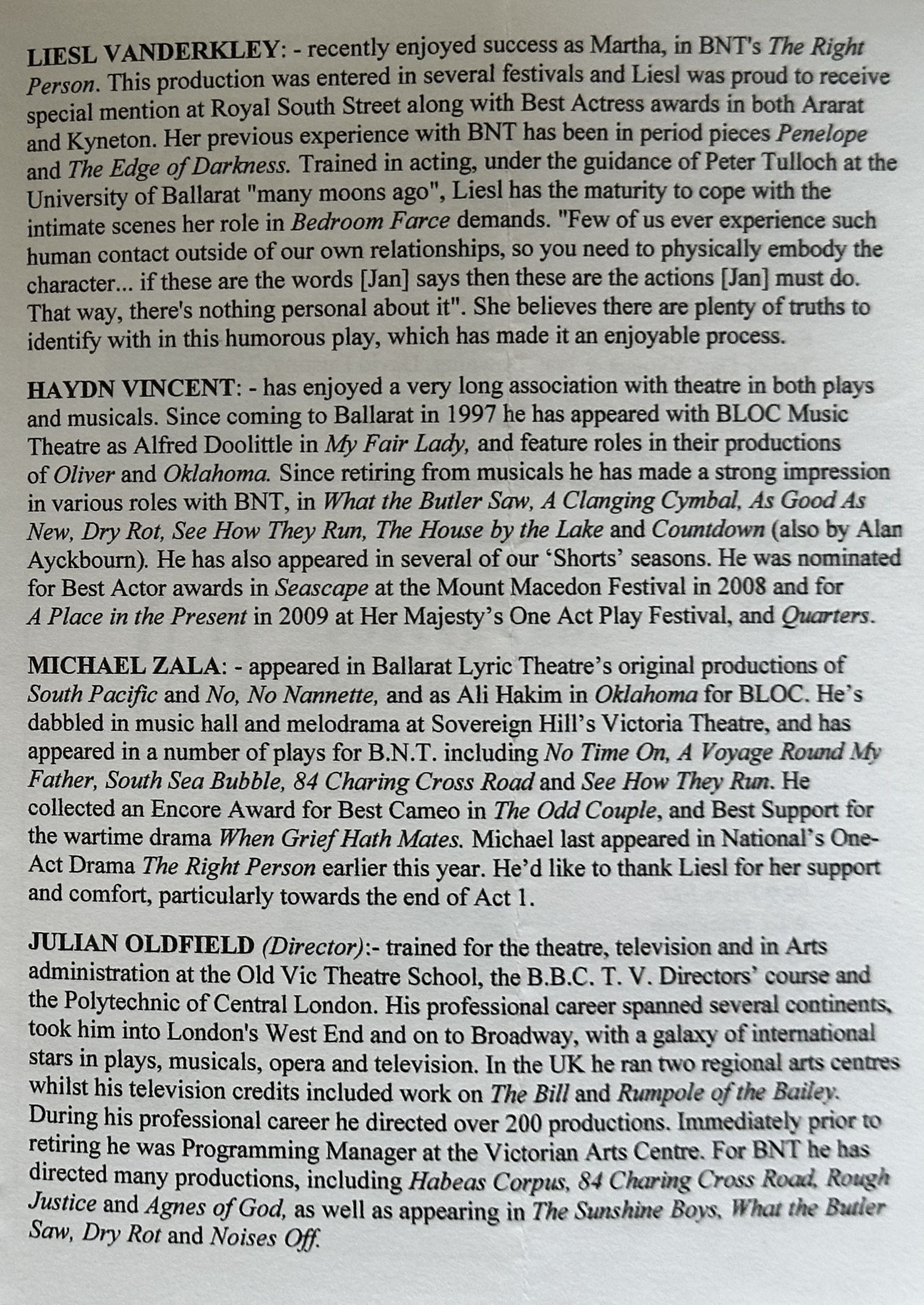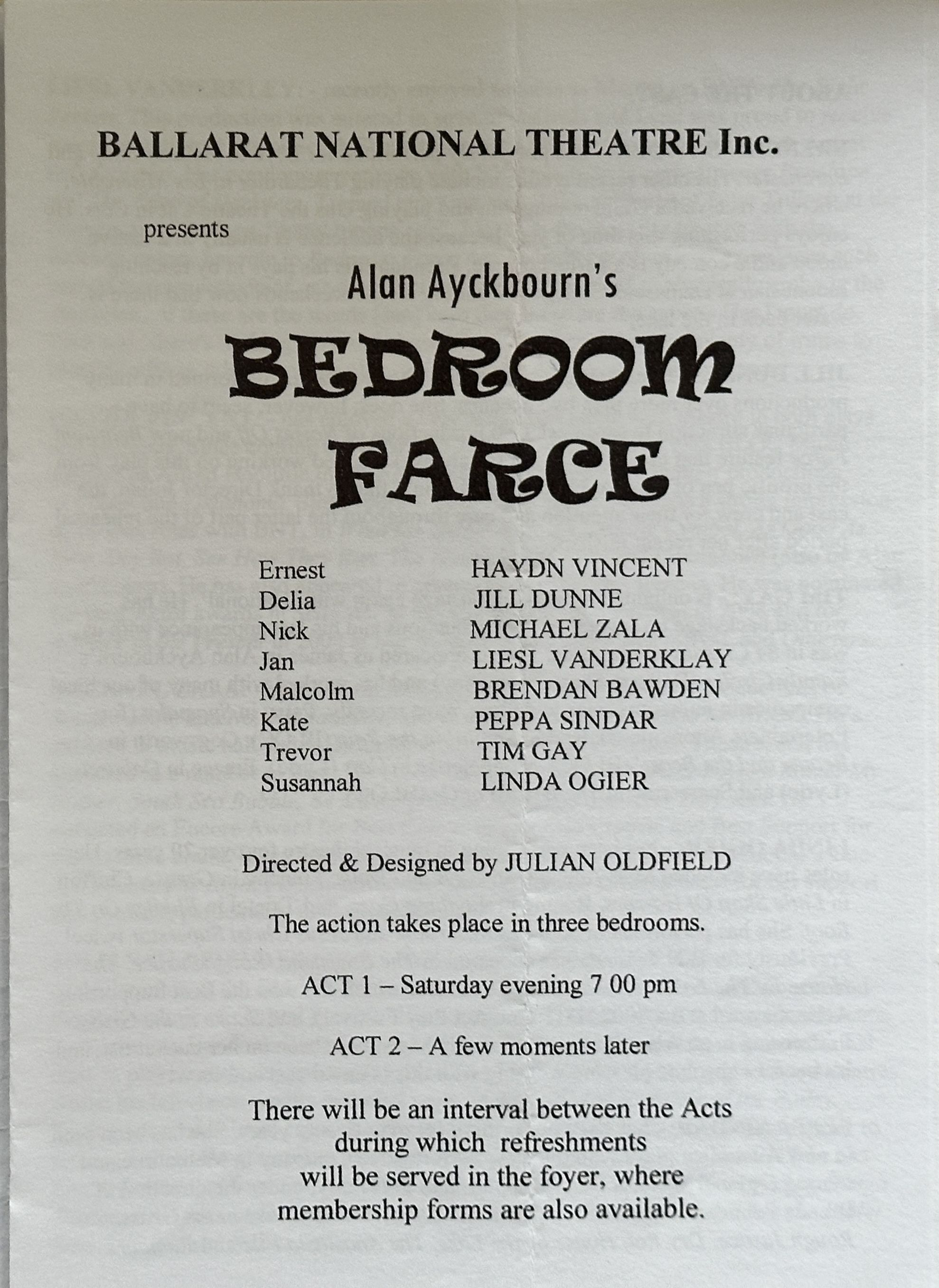 At this busy time of year most of us look for entertainment rather than deep and serious drama. Bedroom Farce provides a welcome and light hearted evening out and again shows the versatility of the Ballarat National Theatre after the great success of their previous production The Mousetrap.