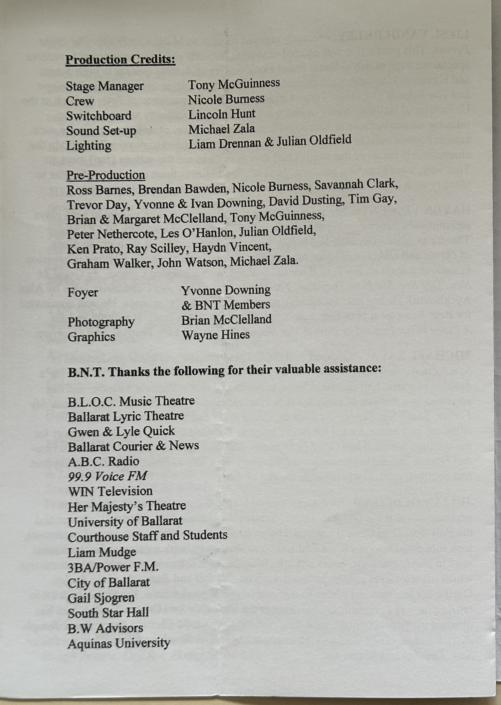 Brendan Bawden and Peppa Sindar are the unfortunate hosts of the doomed party, and anyone who has ever tried it will have a sympathetic chuckle as Brendan’s character struggles to put together a flat-pack piece of furniture. Haydn Vincent and Jill Dunne are Trevor’s older and wiser parents whose frustrations with the younger generation will be familiar to many. Together they all provide plenty of laughs but also insights into marriages both successful and struggling. There is heart as well as humour in this play.
