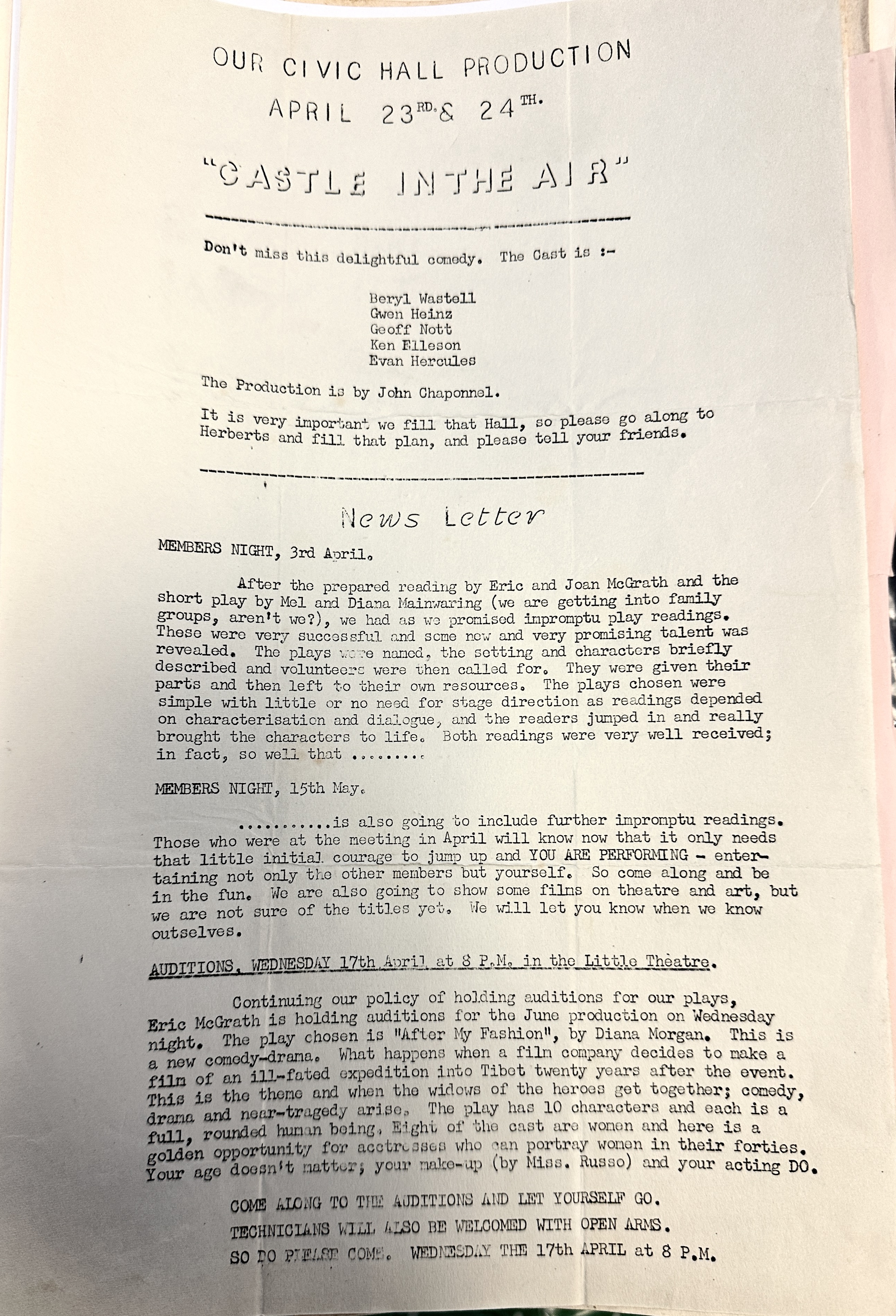 The play was described in the member’s newsletter as a very bright comedy, written by Alan Melville, whose most recent success has been Simon and Laura.