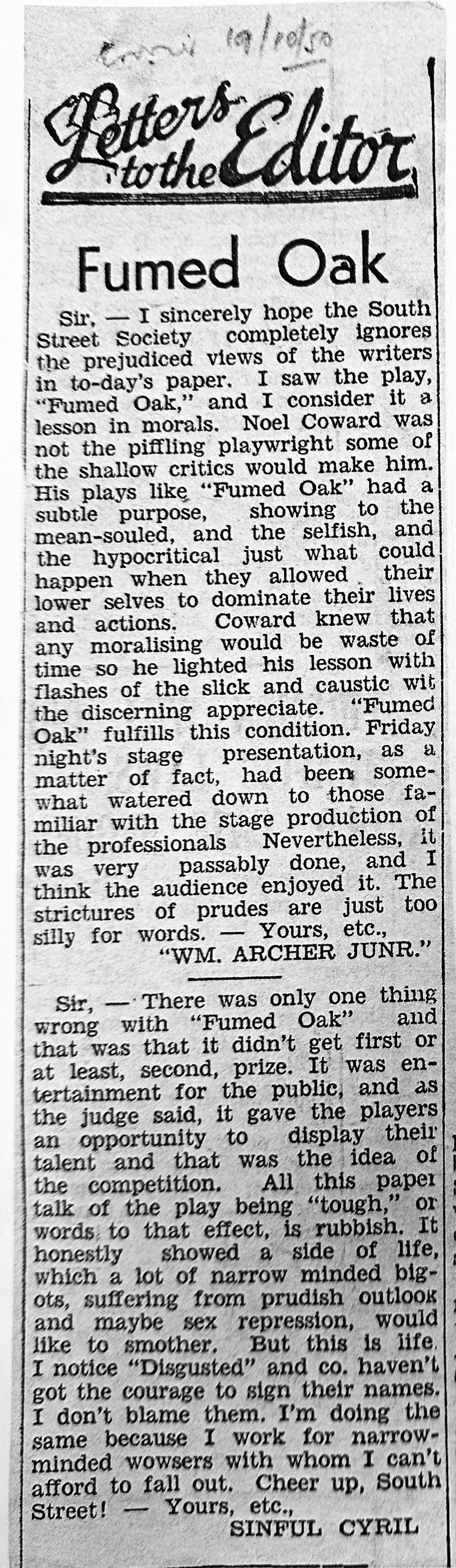 Coward later said, "I have always had a reputation for high-life, earned no doubt in the twenties with such plays as The Vortex. But, as you see, I was a suburban boy, born and bred in the suburbs of London, which I've always loved and always will." Fumed Oak, like his later play This Happy Breed, is one of his rare stage depictions of suburban life.
