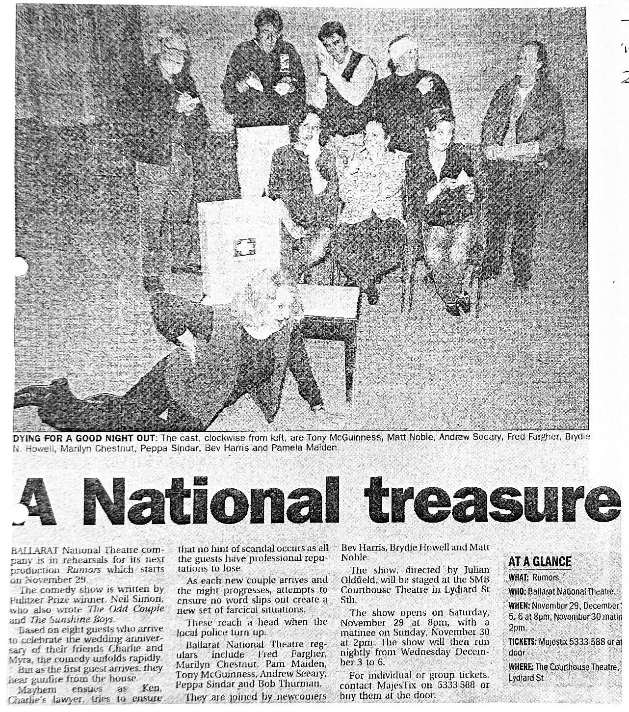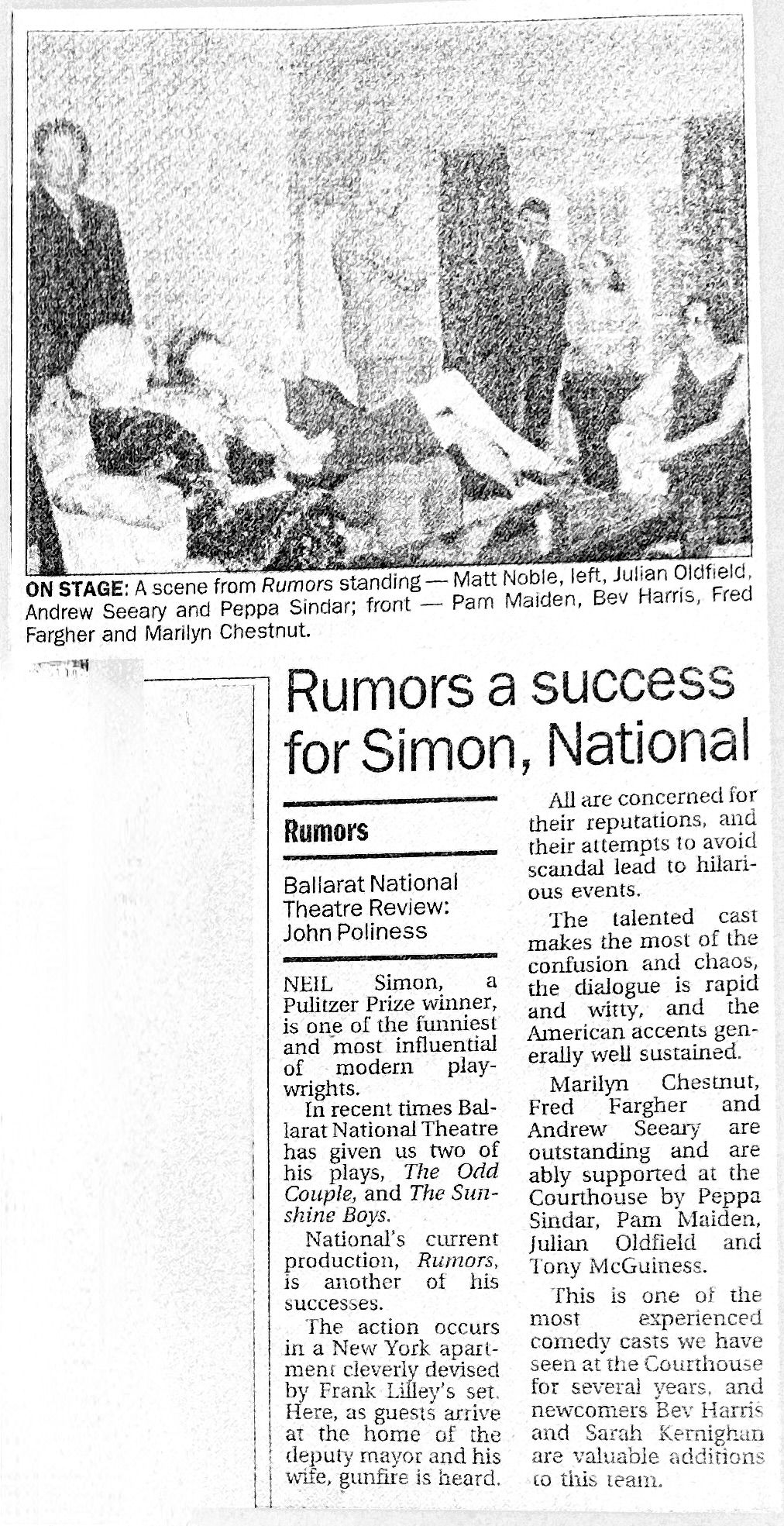 Neil Simon, a Pulitzer Prize winner, is one of the funniest and most influential of modern playwrights. In recent times Ballarat National Theatre has given us two of his plays, The Odd Couple, and The Sunshine Boys. 'National's current production, Rumors, is another of his successes.