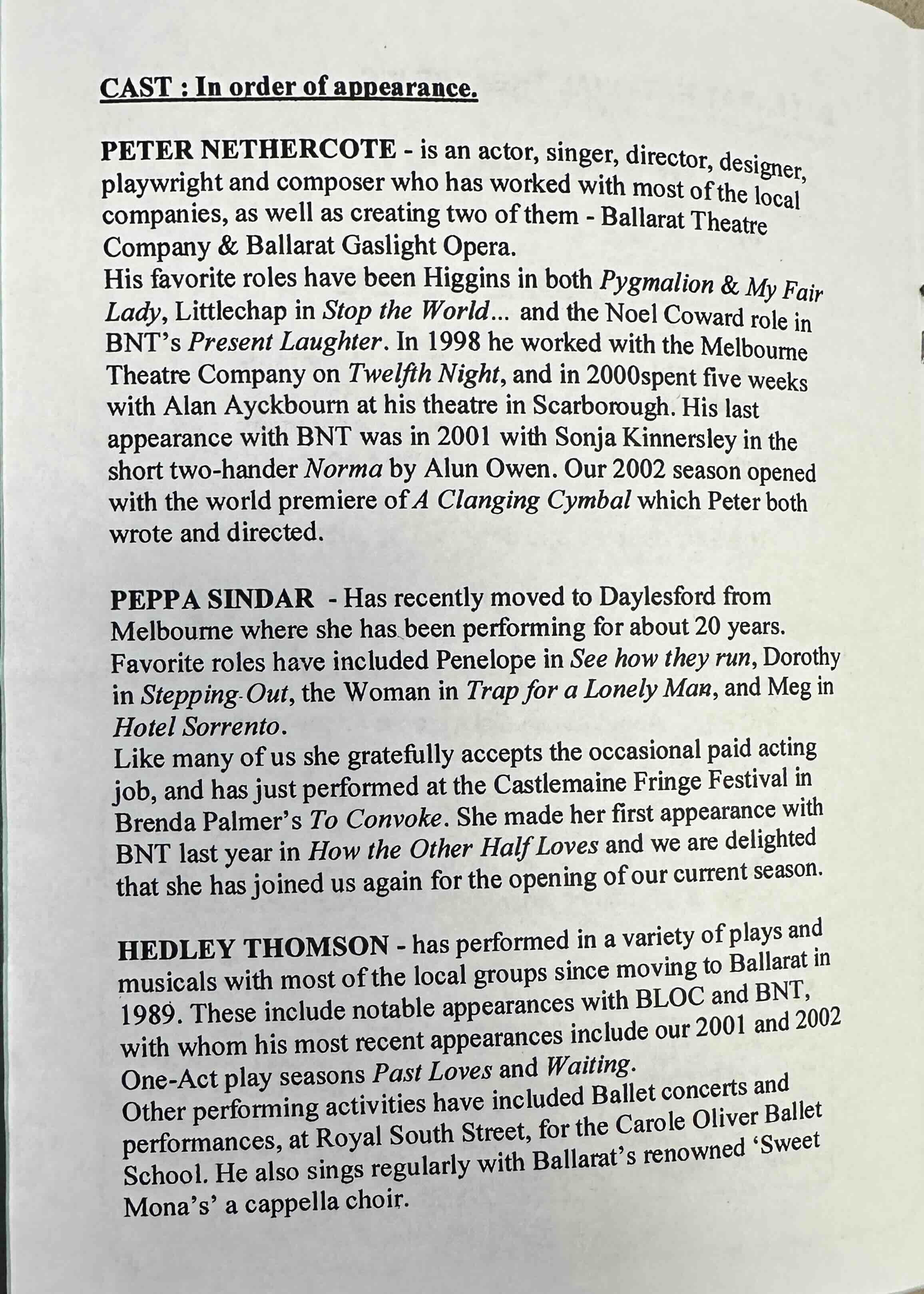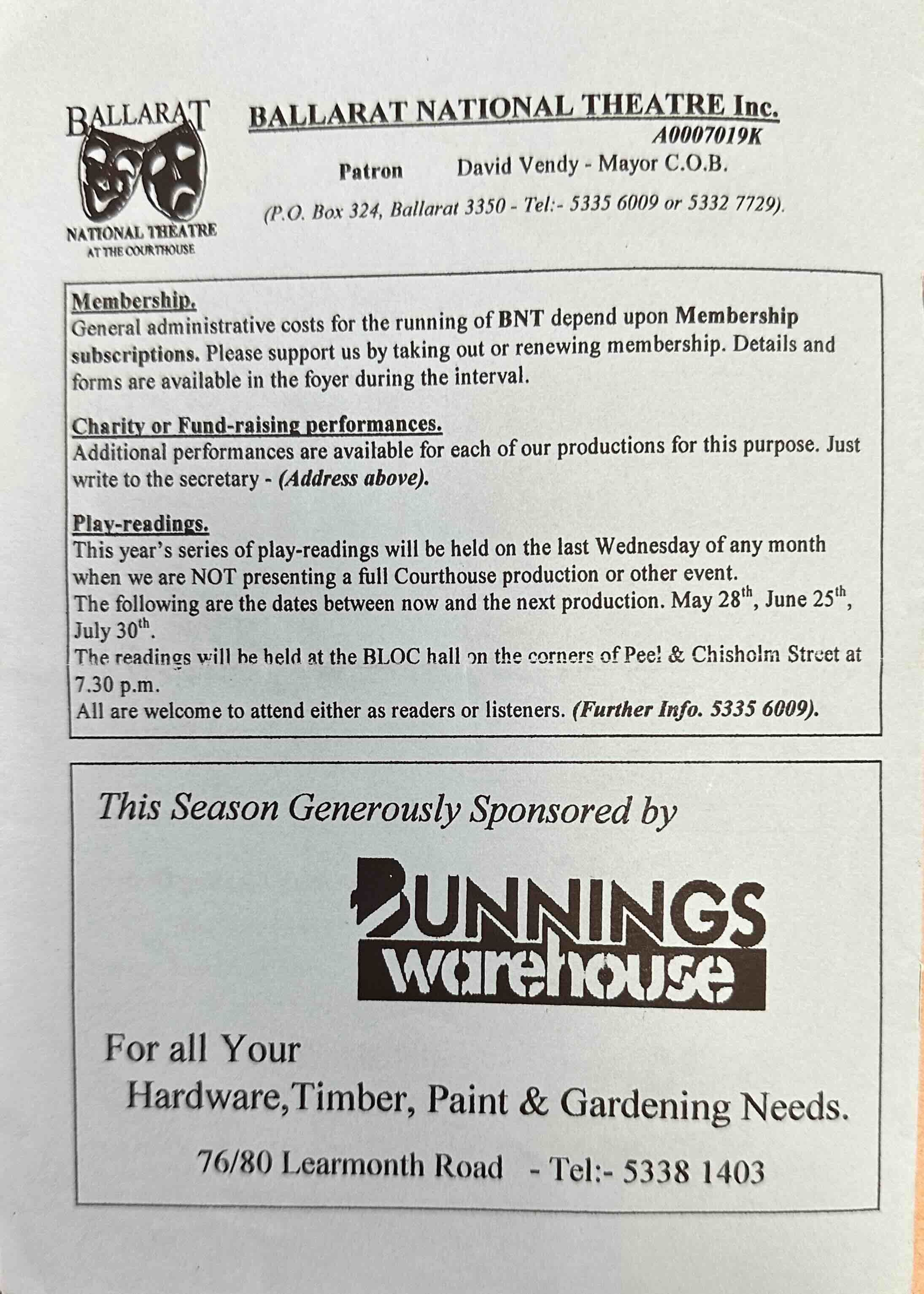 There are excellent performances from the cast of four. Peter Nethercote and Hedley Thomson are, of course, well known to Ballarat audiences. We saw Peppa Sindar last year in How The Other Half Loves and Julie Porter makes her debut with the National Theatre. Director Julian Oldfield is again responsible for a National Theatre success. His production proceeds at a rapid pace and he makes the most of the play's many comic events. The set – the living room, as well as the apartment's life, the neighbouring pub and the public phone box- is cleverly devised and adds to this lively production.