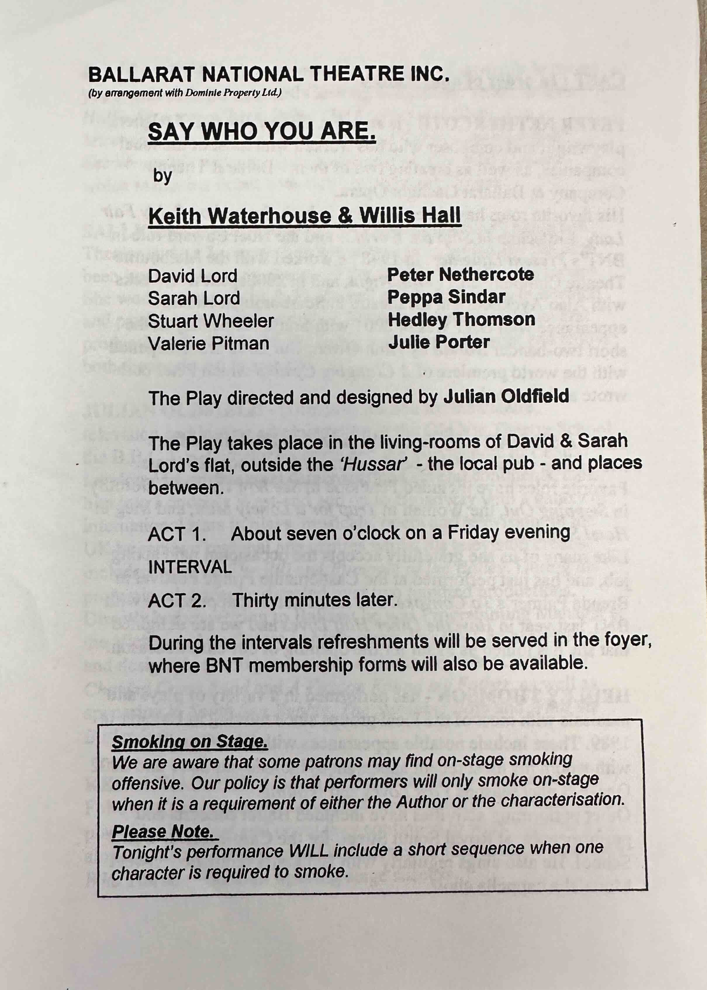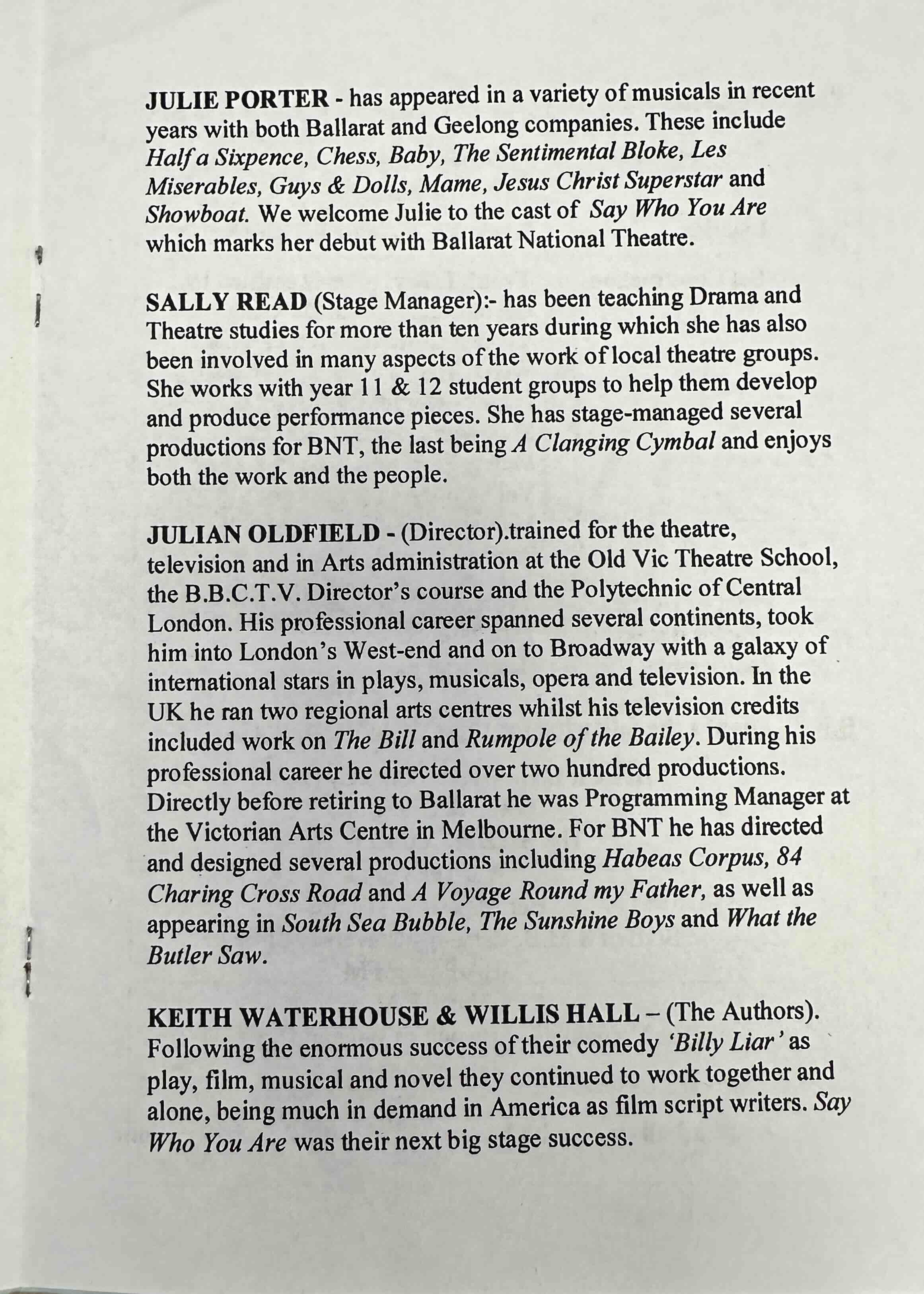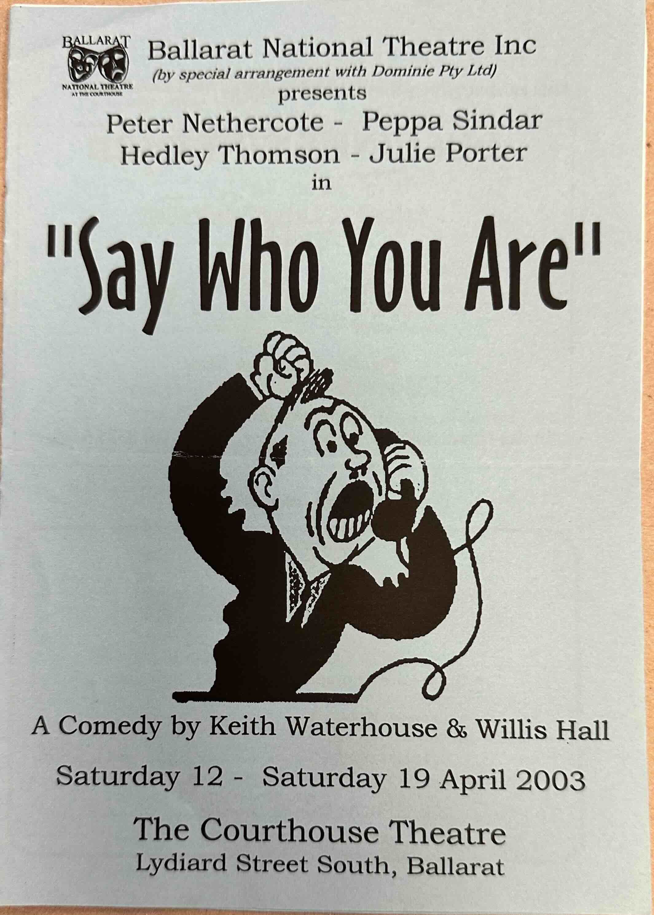 Most of us are familiar with Billy Liar the very .successful comedy of Keith Waterhouse and Willis Hall. Ballarat National Theatre chose the next big success of these playwrights, Say Who You Are, to open its 2003 season. This drawing-room comedy introduces us to David and Sarah, a married couple, Sarah's friend Valerie, and Valerie's married lover, Stuart. The mix-ups that occur when Valerie uses her friend's apartment for her liaisons with Stuart provide the plot for this clever and funny farce.