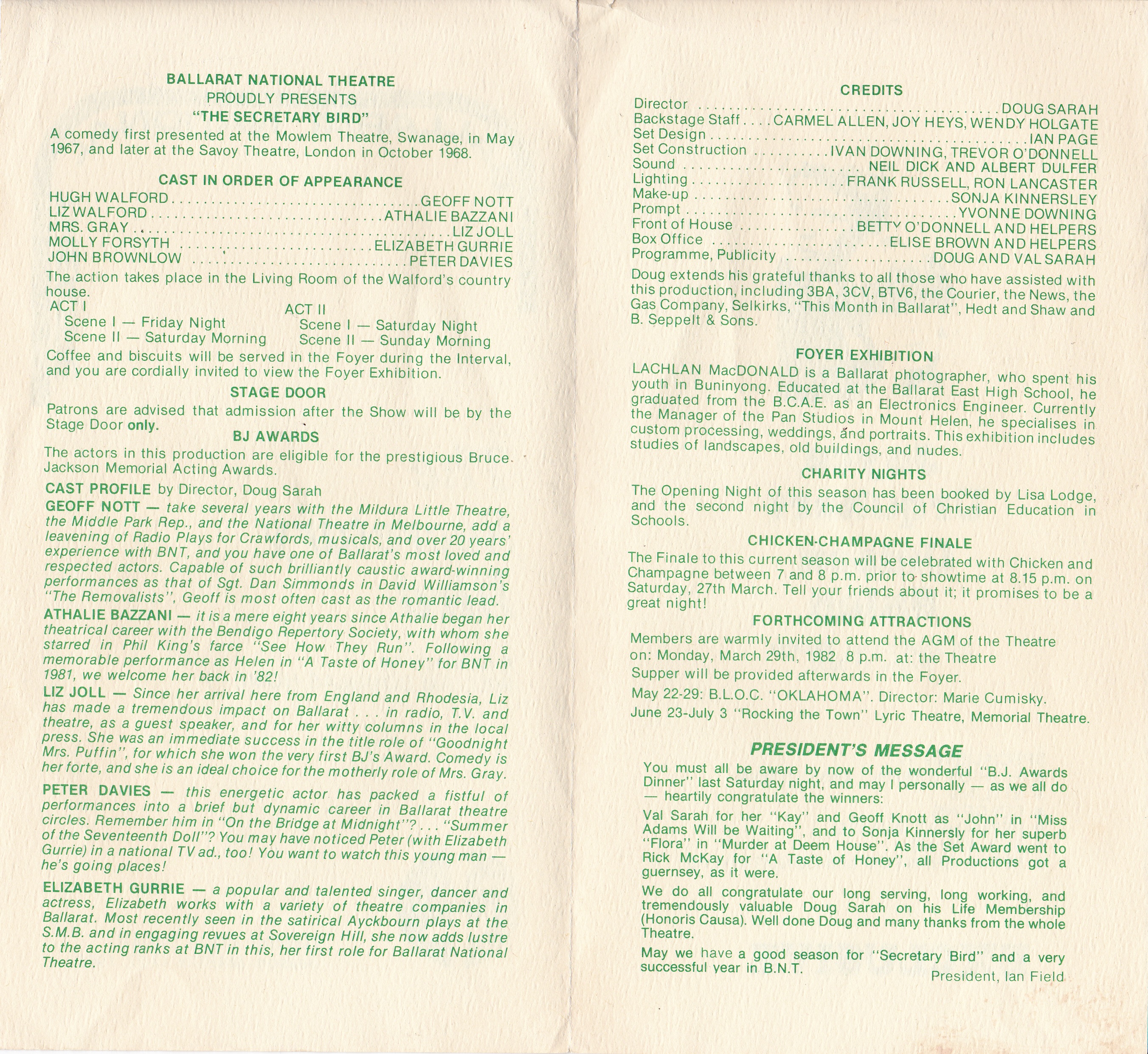 it is a mere eight years since Athalie began her theatrical career with the Bendigo Repertory Society, with whom she starred in Phil King's farce "See How They Run". Following a memorable performance as Helen in "A Taste of Honey" for BNT in 1981, we welcome her back in '82!