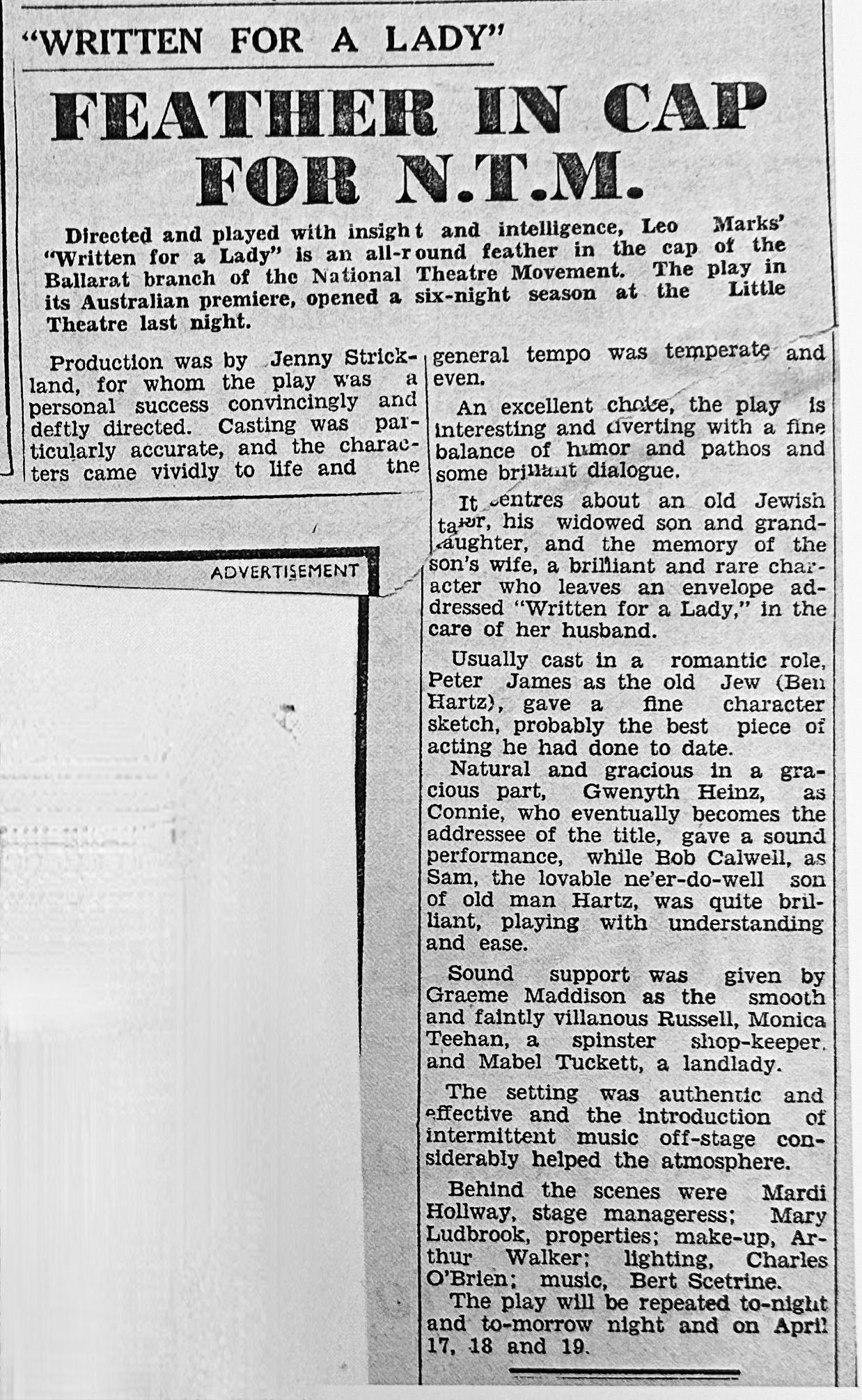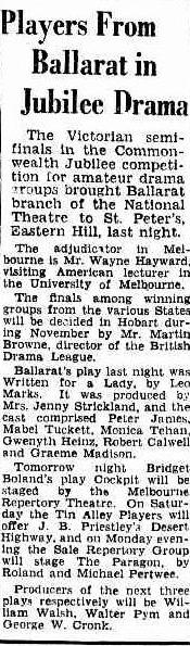 Sound support was given by Graeme Maddison as the smooth and faintly villanous Russell, Monica Teehan, a spinster shop-keeper. and Mabel Tuckett, a landlady.