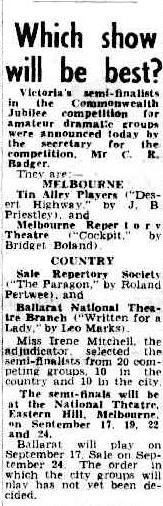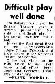 Natural and gracious in a gracious part, Gwenyth Heinz, as Connie, who eventually becomes the addressee of the title, gave a sound performance, while Bob Calwell, as Sam, the lovable ne'er-do-well son of old man Hartz, was quite brilliant, playing with understanding and ease.