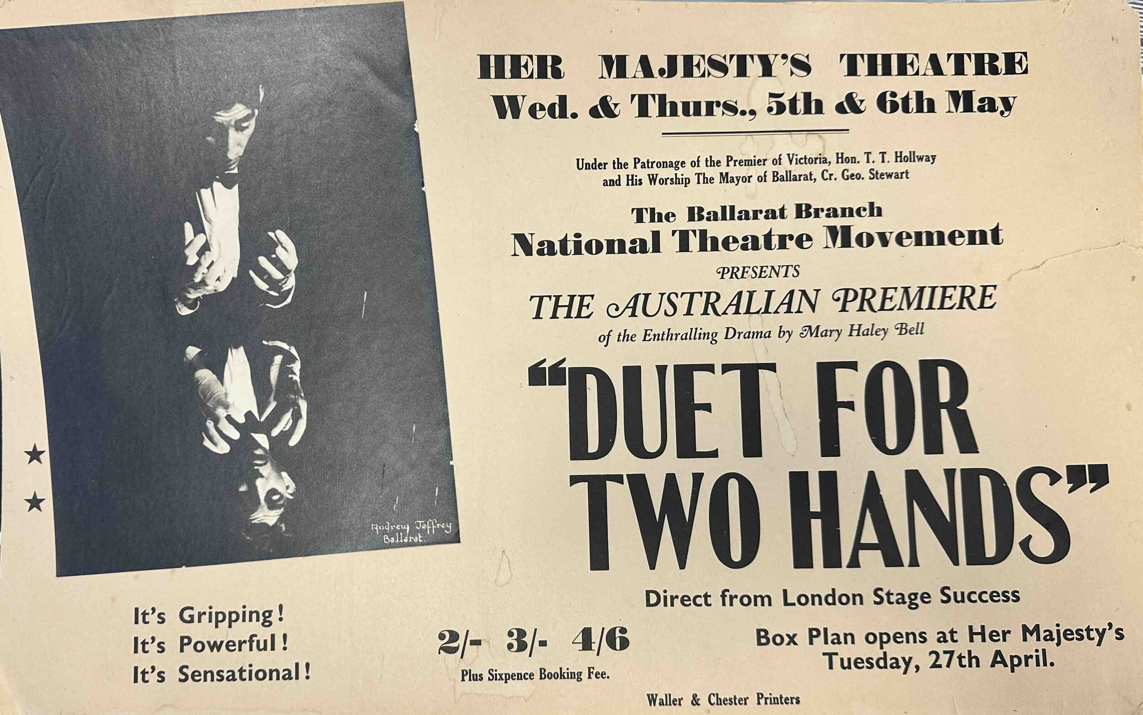 One of four plays by the late English actress, writer and dramatist, Mary Hayley Bell, Duet for Two Hands ran on Broadway in 1947. A classic thriller about a pioneering surgeon and the sinister results of his work.