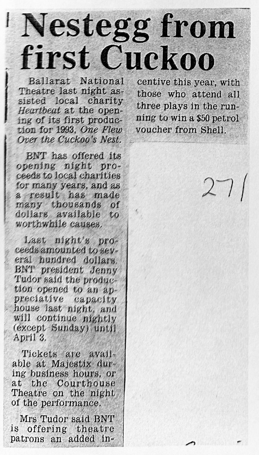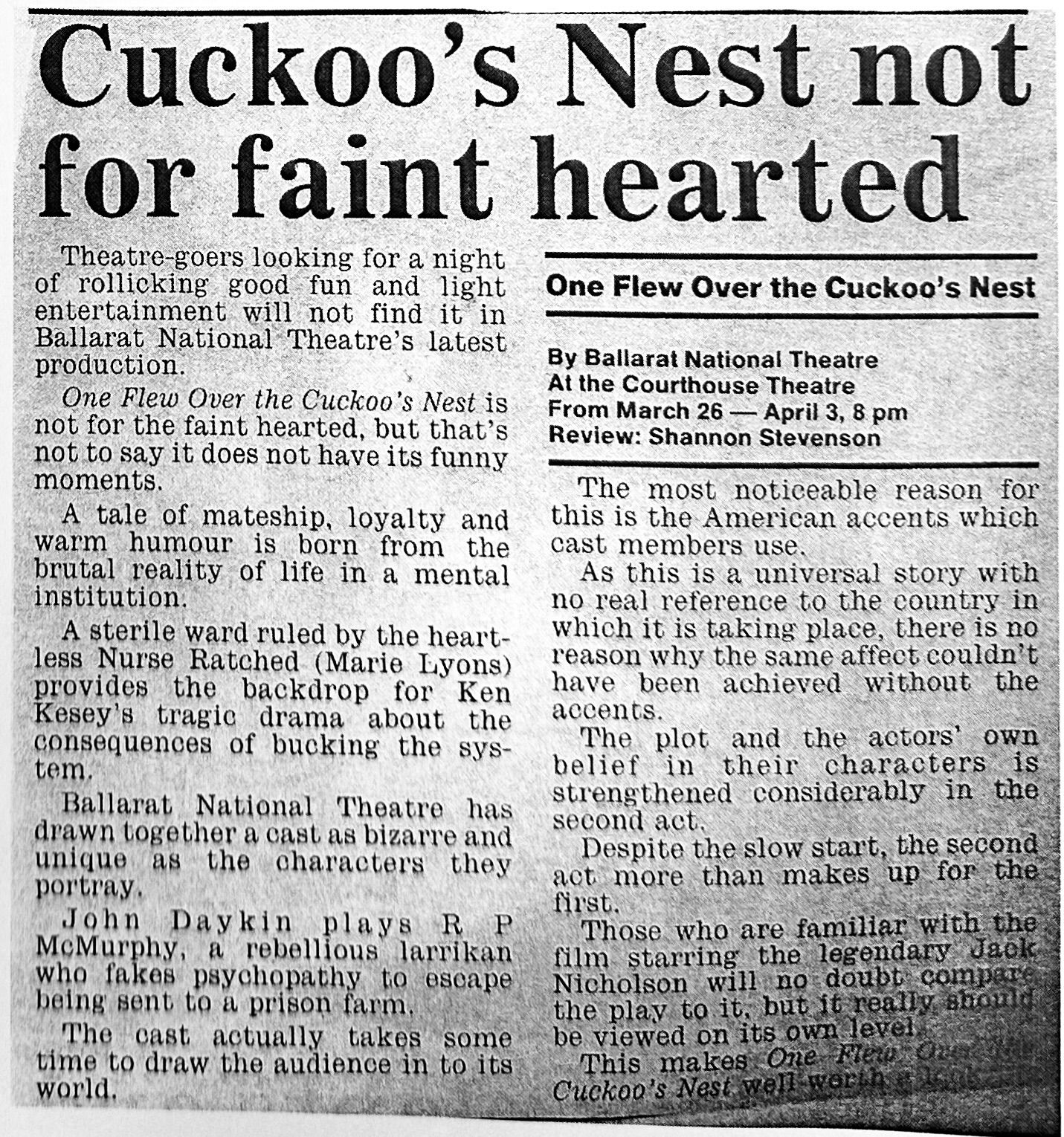 One Flew Over the Cuckoo's Nest (1963) is a play based on Ken Kesey's 1962 novel of the same name. The play had its Broadway debut in 1963 with an adaptation by Dale Wasserman starring Kirk Douglas as Randle McMurphy, a mental patient and Joan Tetzel as Nurse Ratched. The play had a Broadway revival in 2002 earning the Tony Award for Best Revival of a Play as well as a nomination for the Tony Award for Best Actor in a Play starring Gary Sinise.