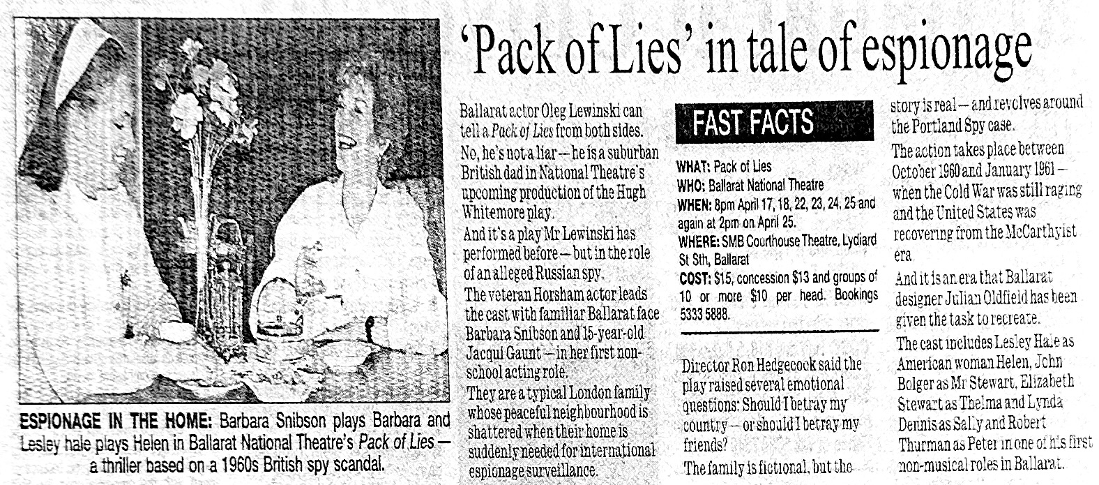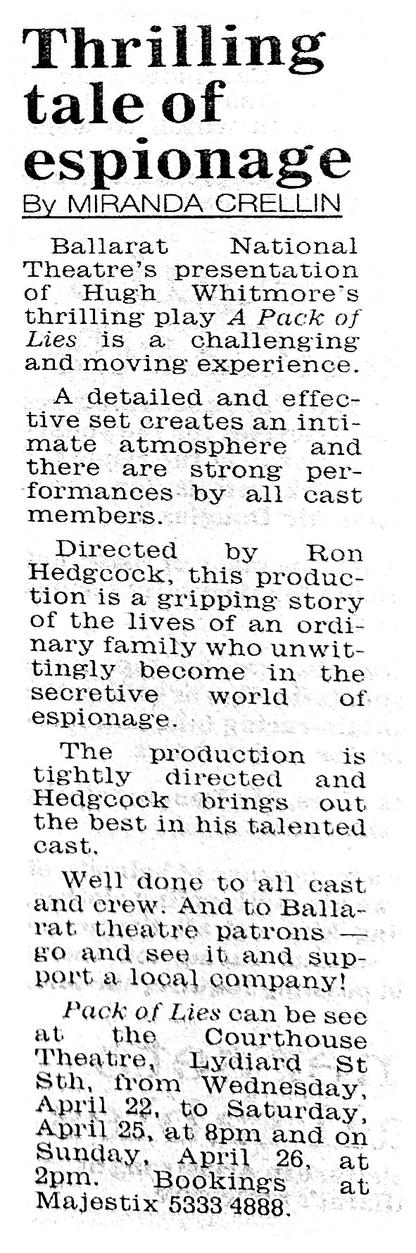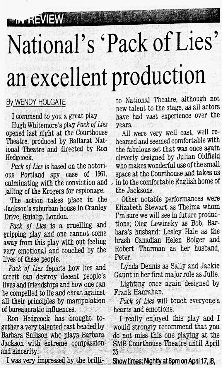 and other servicesFrank Lilley, Ken Prato, Ross Barnes, Wendy Hall, John Watson and family, Jenny Debney, Julian Oldfield, Tony McGuinness, Jim Day, Gary Hall, Peter Zala, Peter Nethercote, Ron Hedgcock, Lesley Hale, U3A Drama Group -