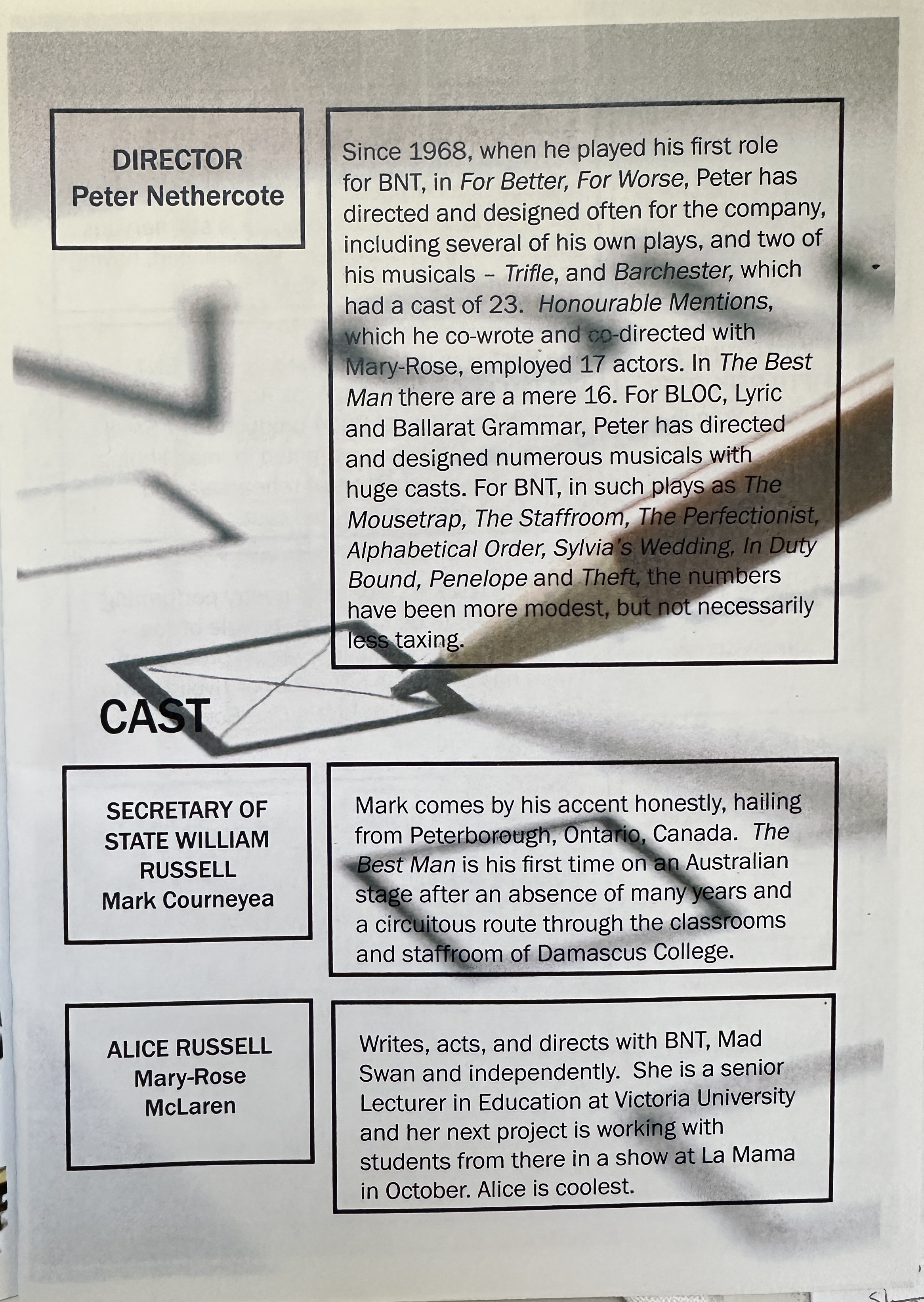 On stage The Best Man is done with surprisingly realistic American accents....always a hard trick to carry off. This very pleasing production shows Peter Nethercote’s trademark careful directing hand and attention to detail: the action is well-paced and interesting, and this reviewer left well satisfied.