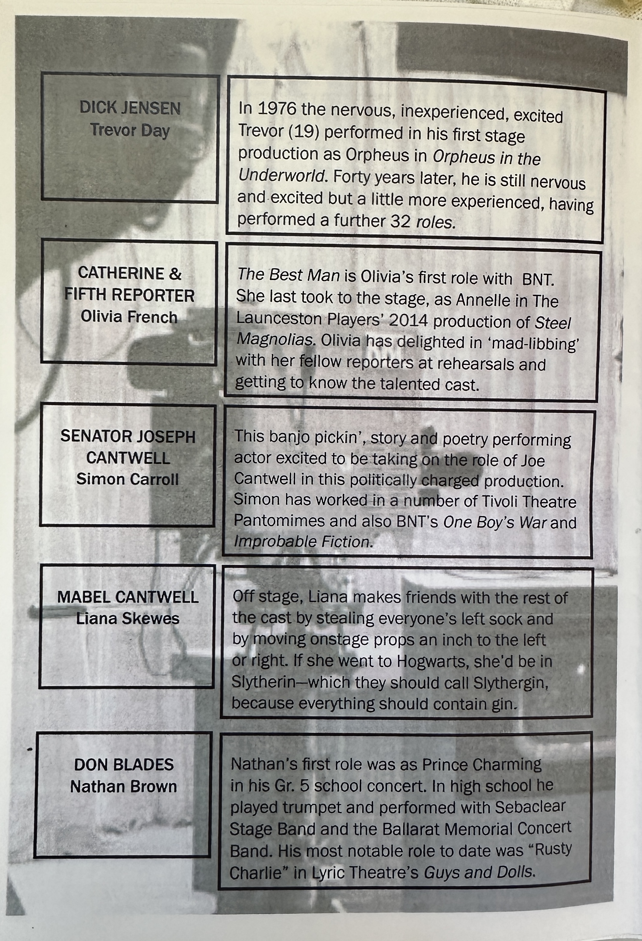 a stentorian type who looks and sounds every inch a Real Senator. Well cast also is the busybody Socialite Mrs Sue-Ellen Gamadge (Christine Holmes) whom no politician can afford to ignore. The two “witnesses” to the candidates’ secret pasts (Dr Artinian; Tony McGuinness, and Major Sheldon Marcus; Michael Zala), together with the candidates’ two ‘Minders’ (Don Blades; Nathan Brown, and Dick Jensen: Trevor Day, help to complete this smart stage production.