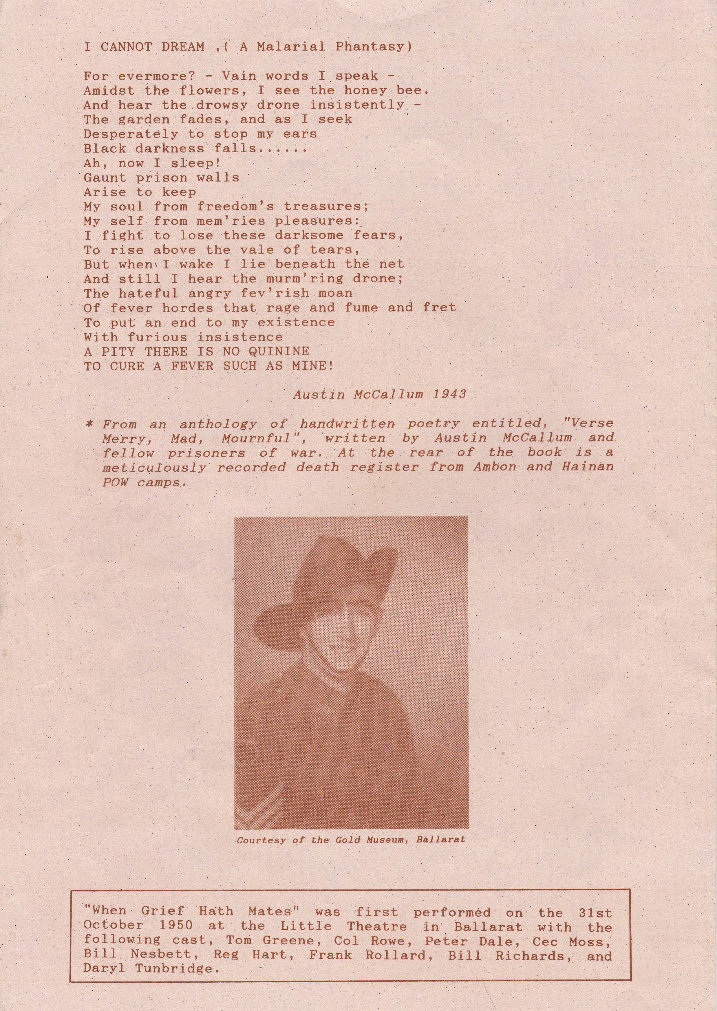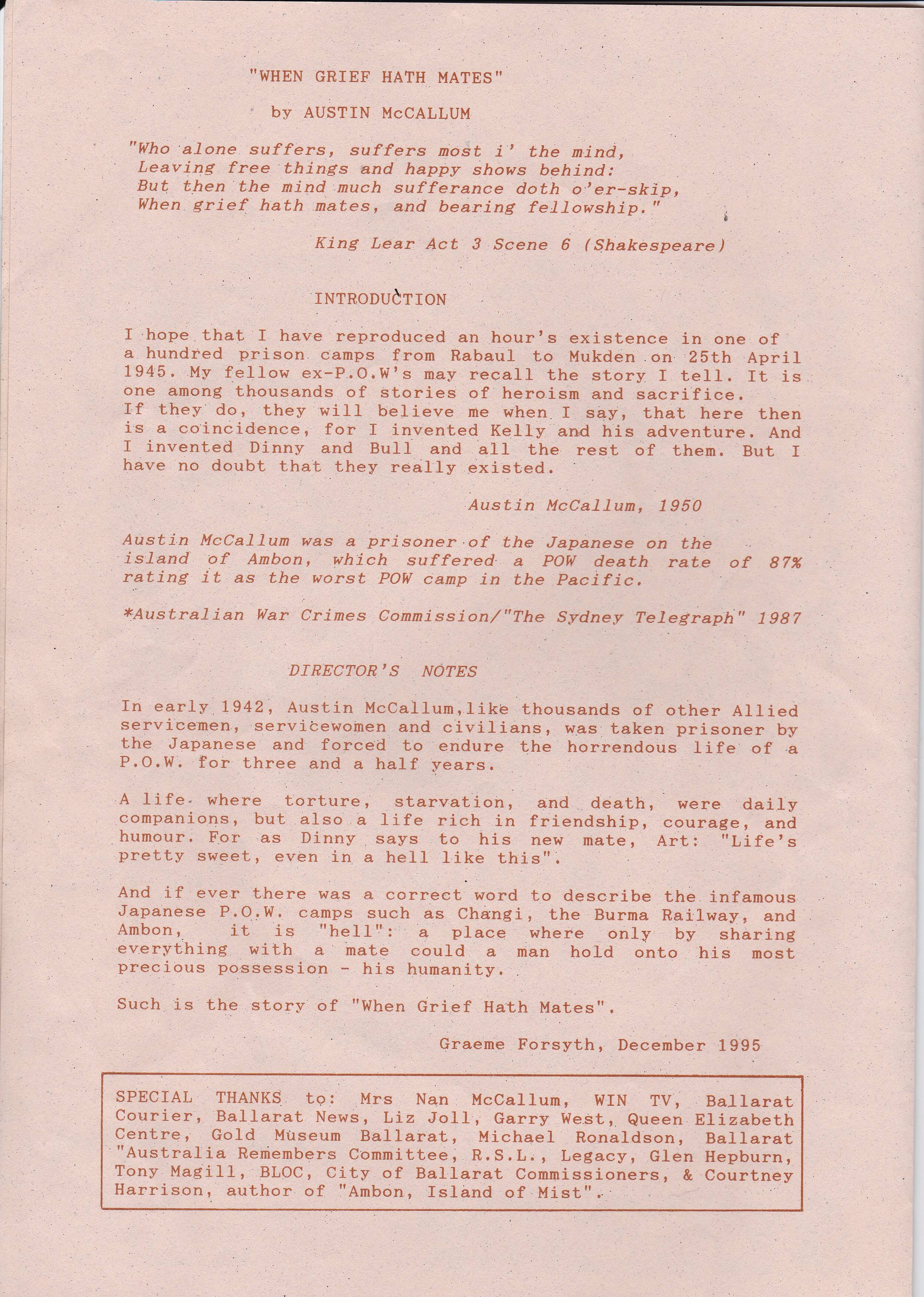 Austin McCallum was a prisoner of the Japanese on the island of Ambon, which suffered a POW death rate of 87% rating it as the worst POW camp in the Pacific.