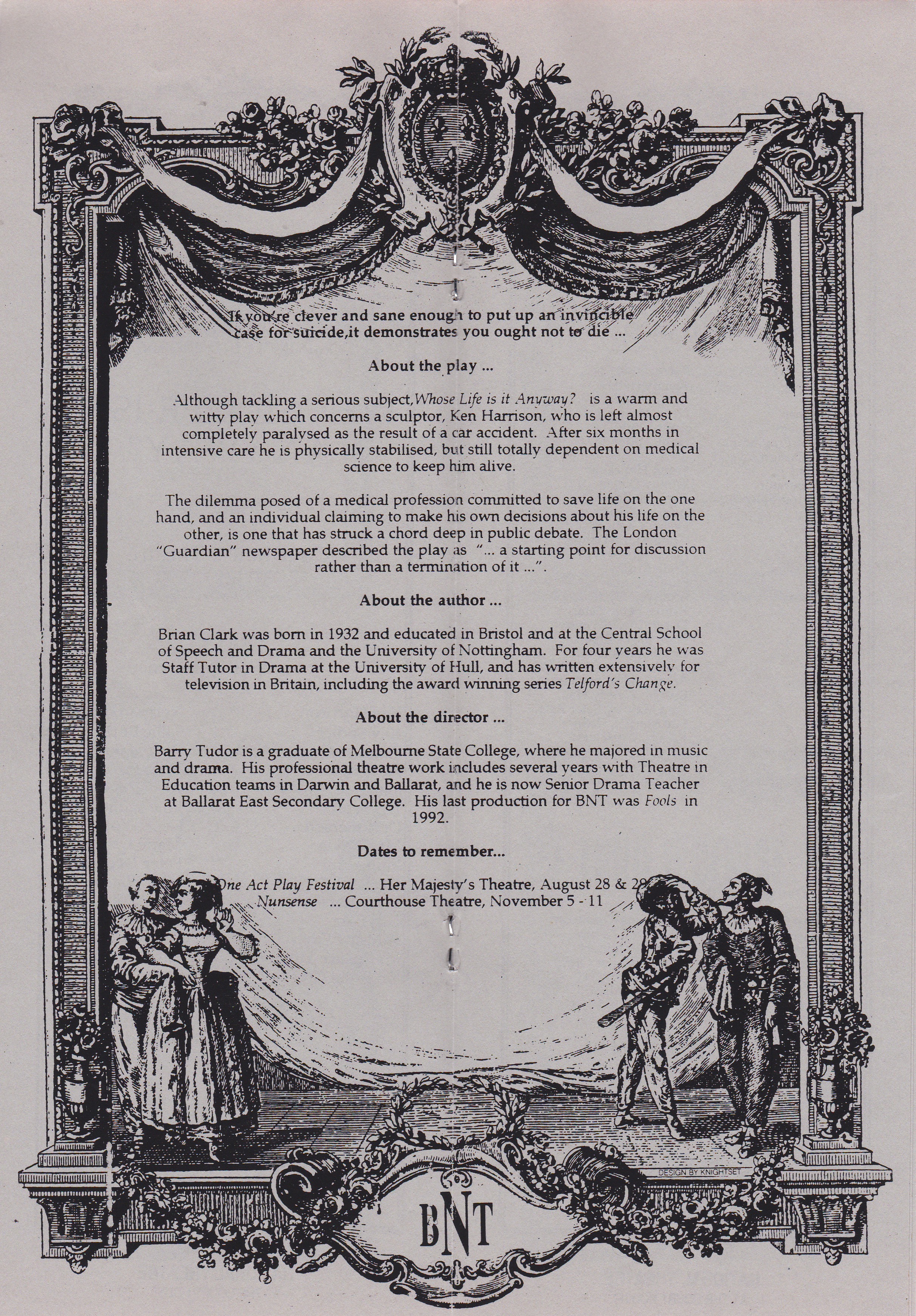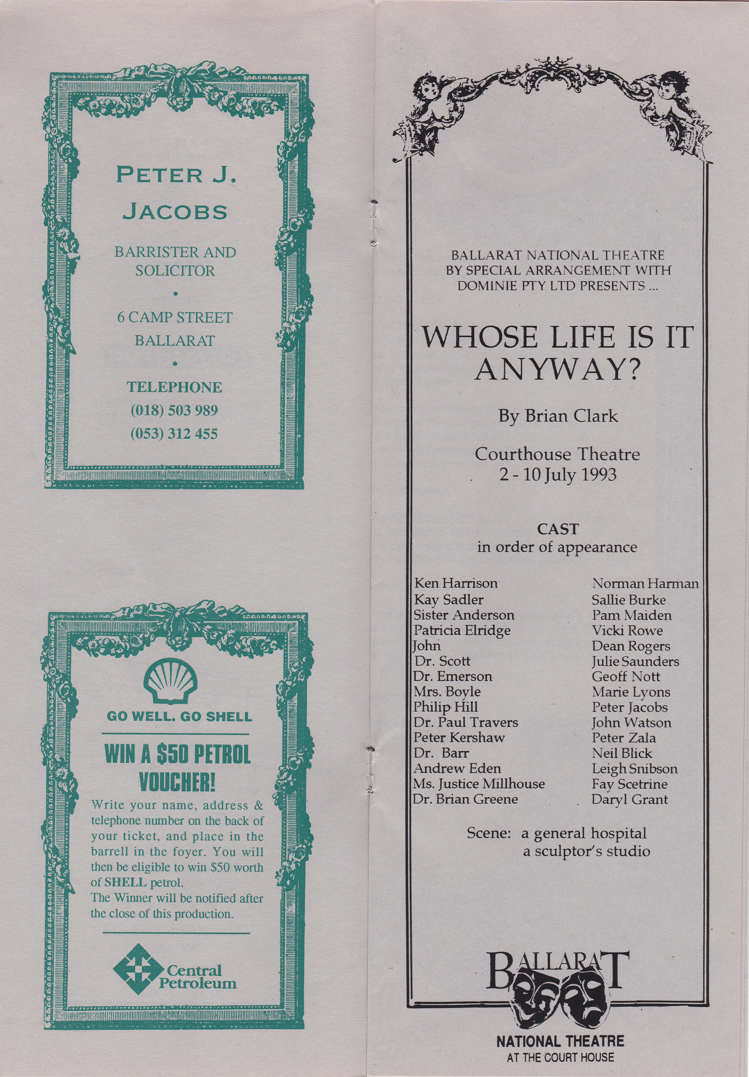 Although tackling a serious subject, Whose Life is it Anyway? is a warm and witty play which concerns a sculptor, Ken Harrison, who is left almost completely paralysed as the result of a car accident. After six months in intensive care he is physically stabilised, but still totally dependent on medical science to keep him alive.
