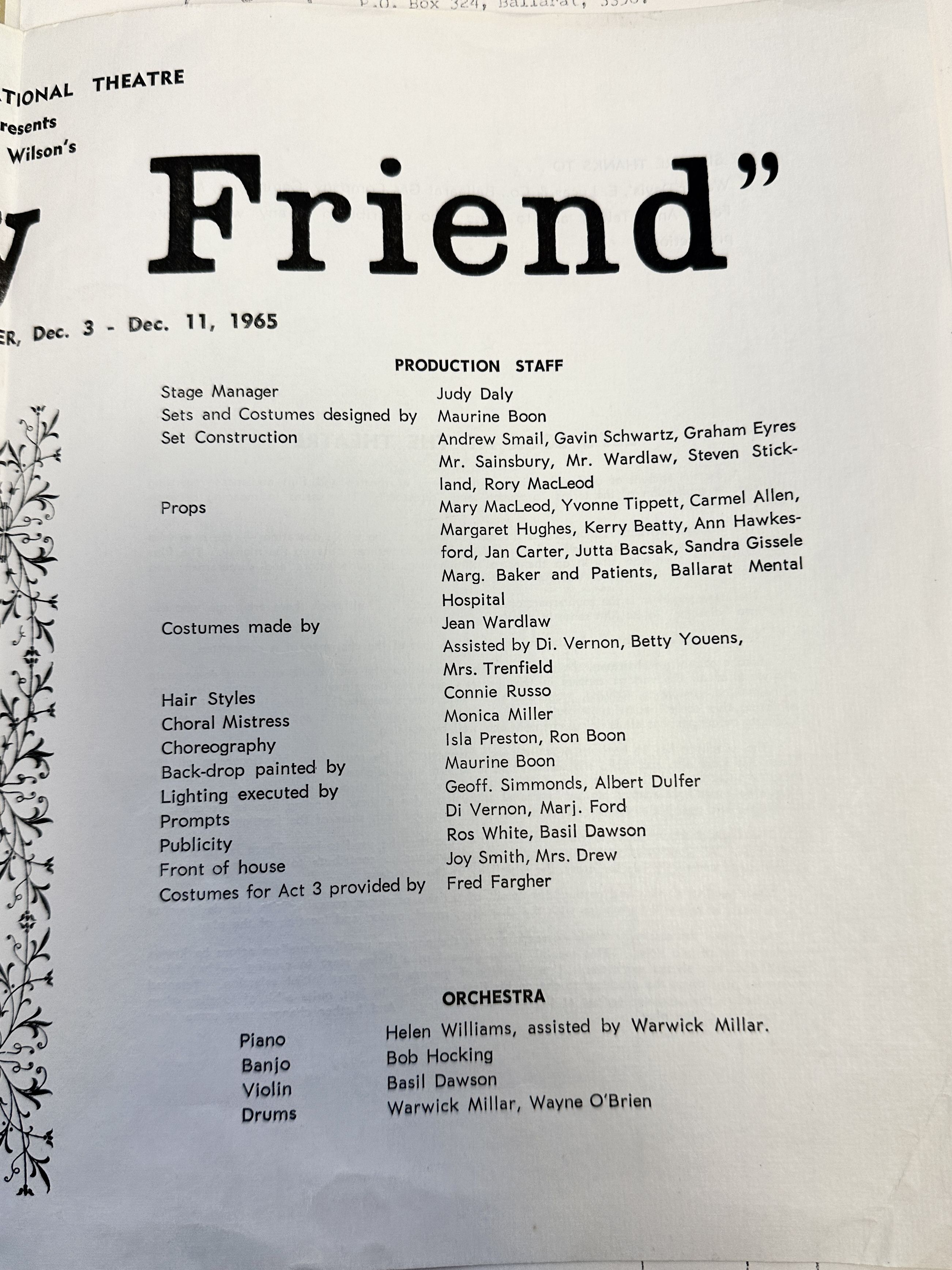 We must mention too how successful Pamela’s production of the Boy Friend was. Full houses, very full in fact – we congratulate our front of house staff on the manner in which they managed to find room for ‘just one more’. It was an excellent end to 1965 and all carried away happy and tuneful thoughts. Thank you Pam and cast for the great job and success you gave the theatre.