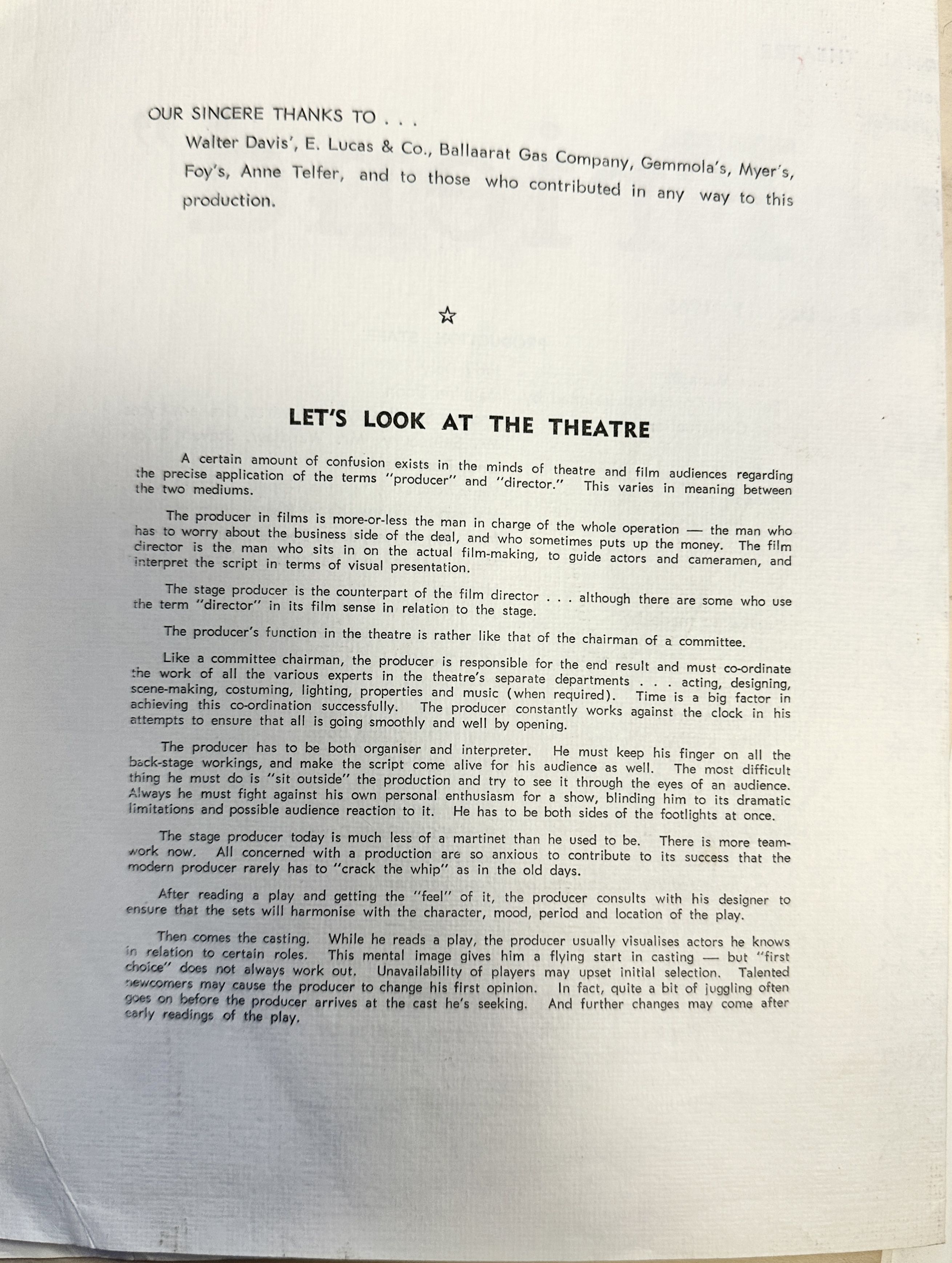 A whole feast of talent. December 3 is opening night with a charity performance for Community Aid Abroad. Because of the high cost of royalties – 12 ½% of the gross takings, prices will have to be increased for this production to 10 shillings; 8 shillings for members and block bookings of six or more; 6 shillings for students and pensioners. Bookings will be at Frank Fords, and this will put an additional 6 pence onto all prices. Bookings will open on the 2 December.
