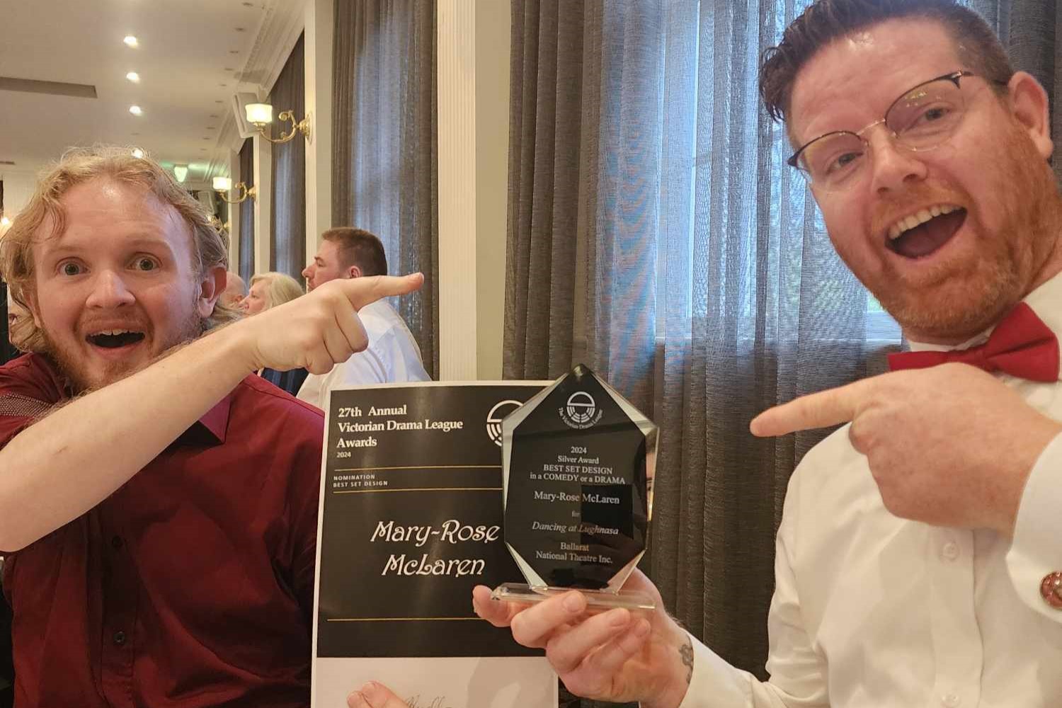 We're proud to share Ballarat National Theatre's success at the 2024 Victorian Drama League Awards on December 1. BNT was able to submit one show for consideration in this year's awards and due to timing, the eligible BNT show this year was Dancing at Lughnasa by Brian Friel. Many cast and crew involved were involved in other performances on the same day as the awards so a group of six members went down to represent BNT and see if we were nominated for any awards.