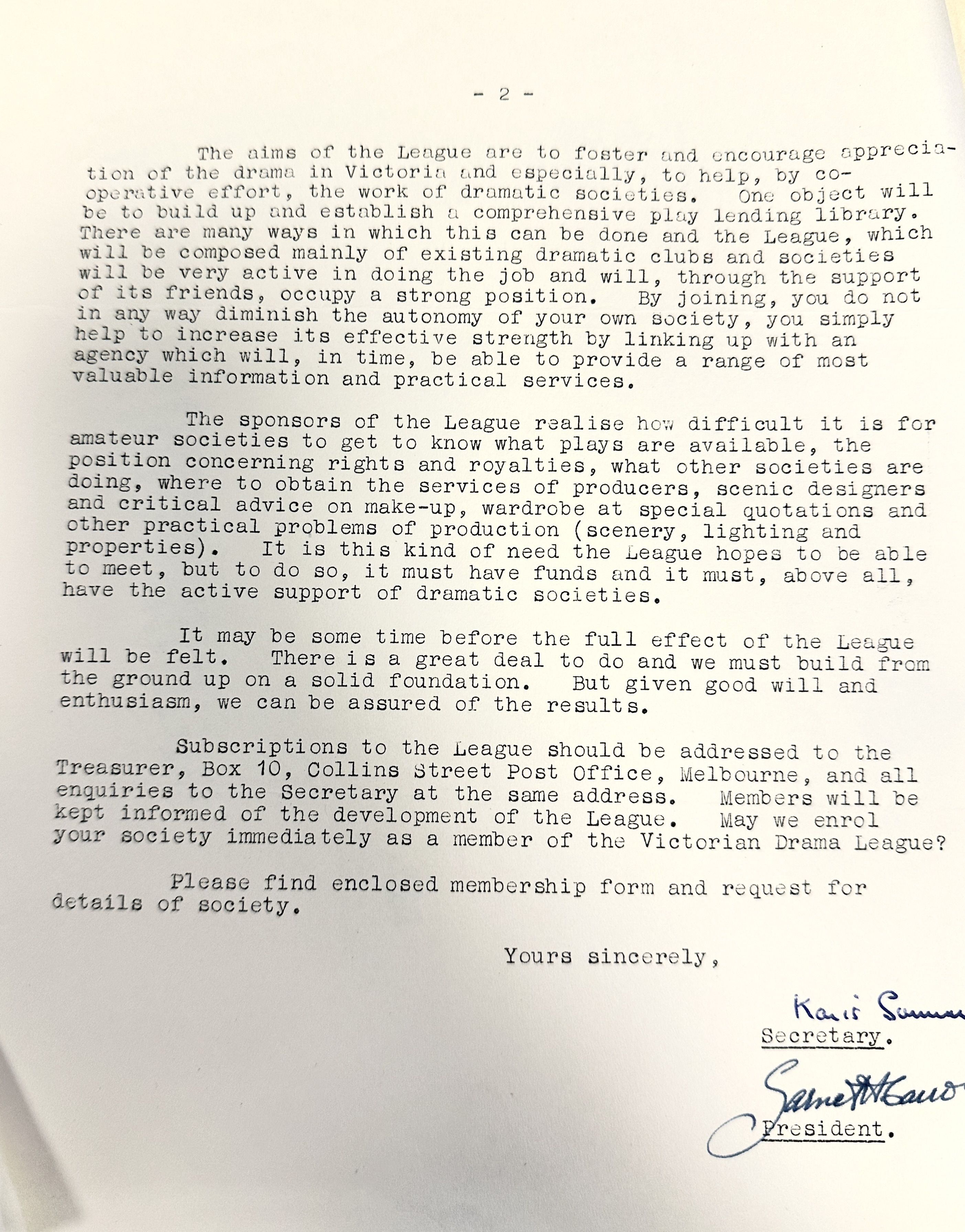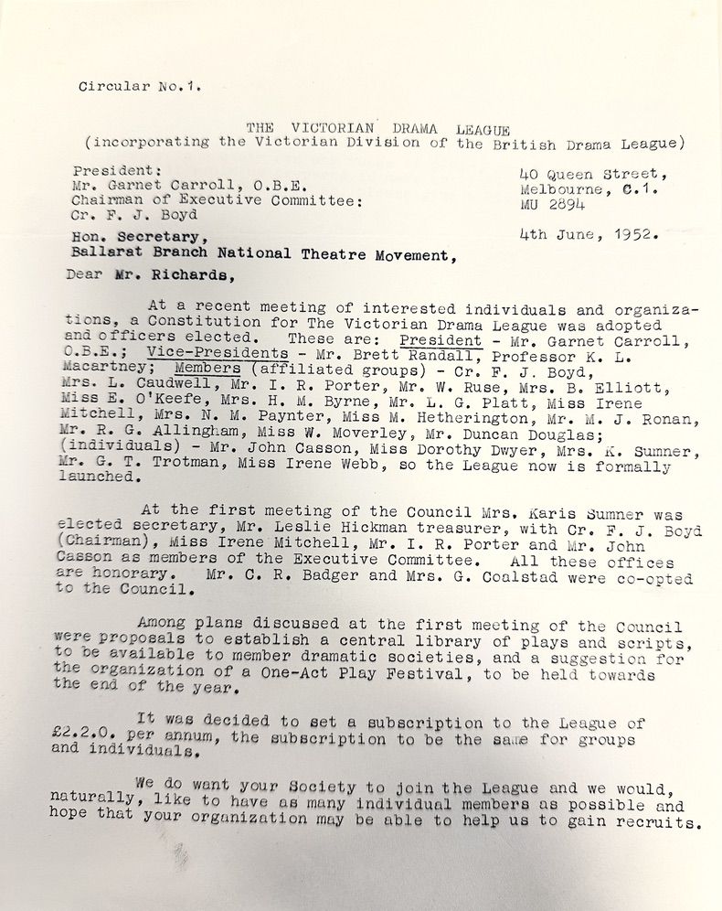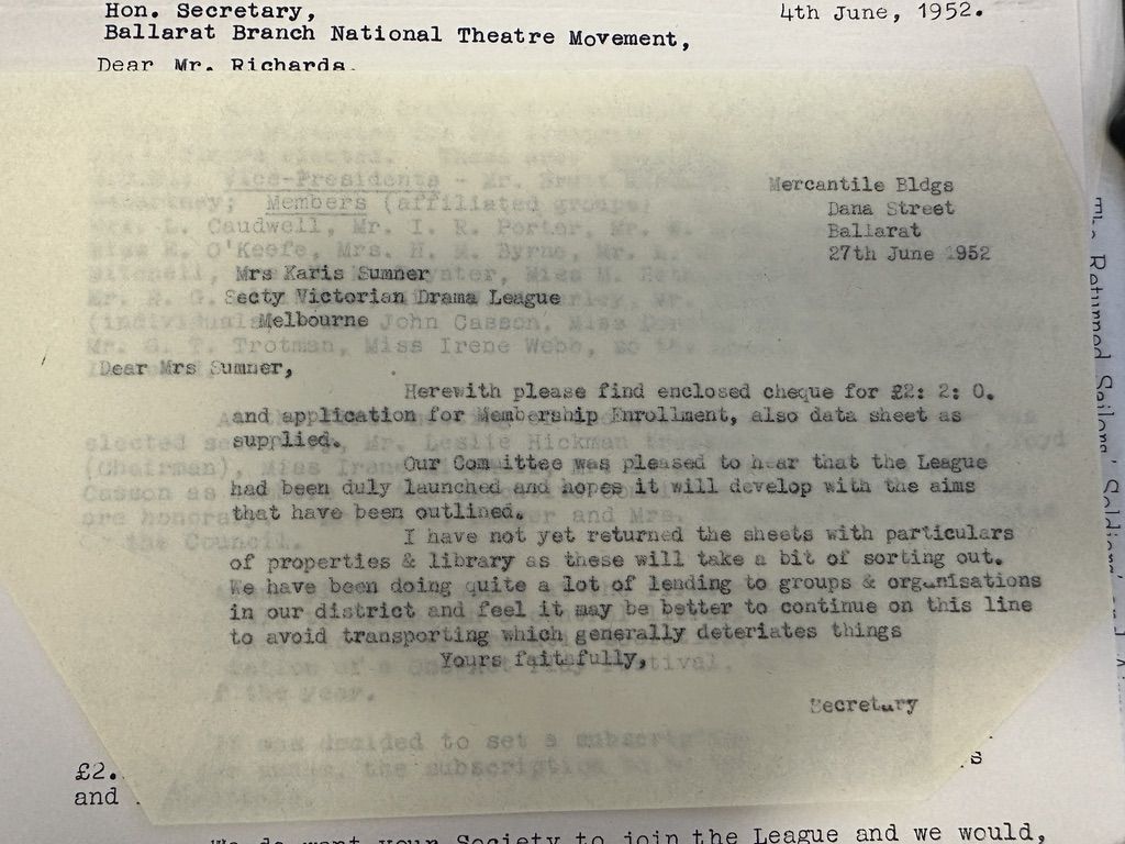 Once trained, Liana has begun the process of exploring the collection, identifying what has or has not yet been digitised, and cataloguing items that have not been yet logged in the collection. This started with old correspondence folders dating back to 1951, including original letters related to the establishment of the Victorian Drama League.