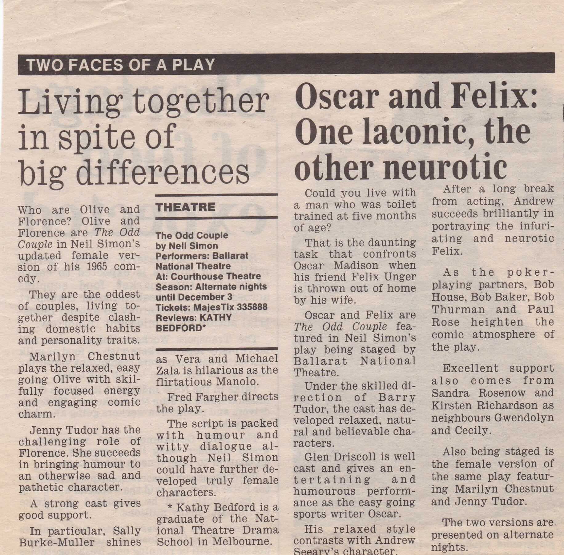 1994  | The Odd Couple - Female  | Newspaper articles added to the production page  | Read more |