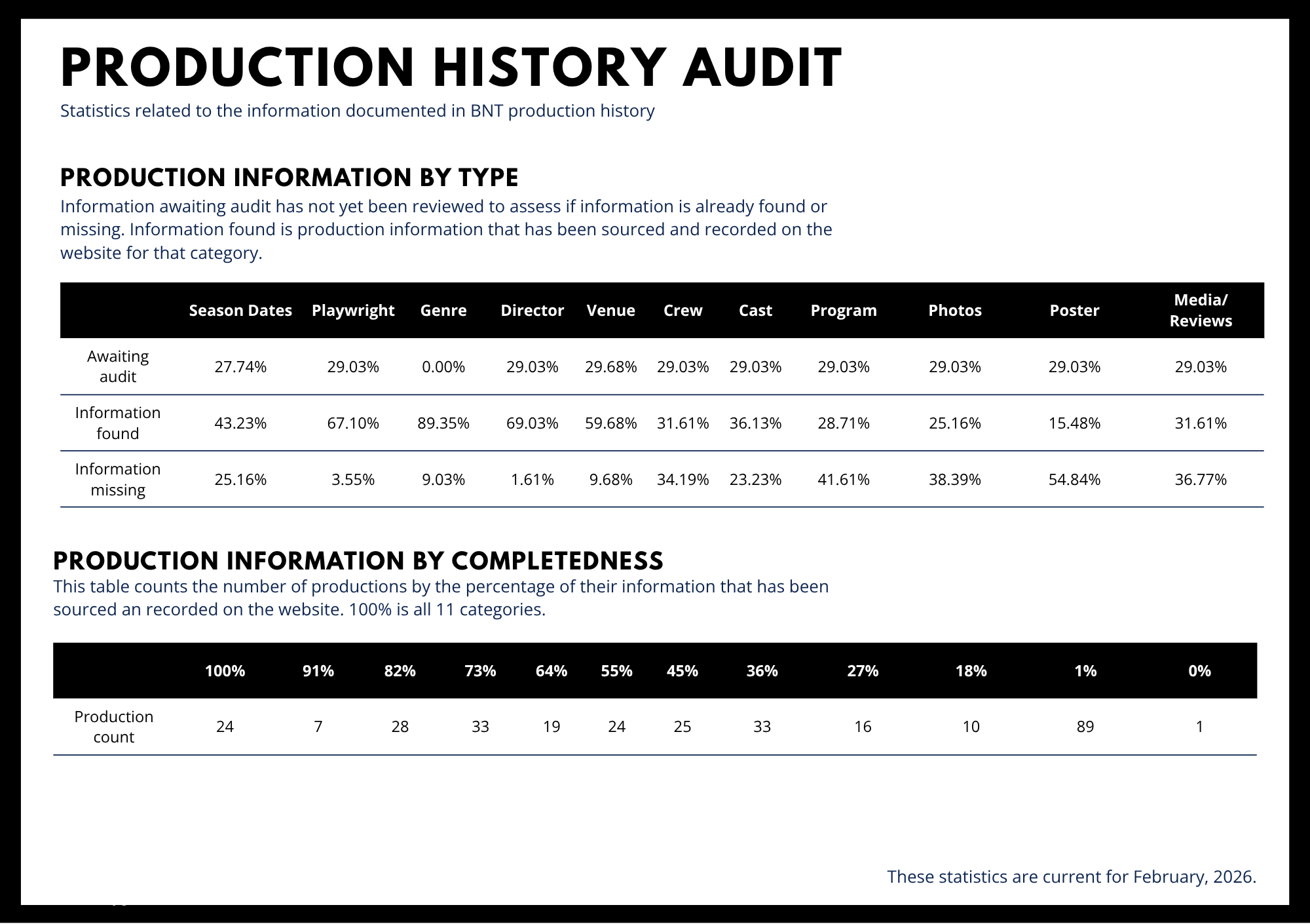 As she progresses, Liana has begun logging the scope of information processed so far. The below table identifies the 11 core pieces of information we hope to have included in every production. Each item is broken down by how many we have information for, how many we are missing information for, and how many we still have to check as part of the information audit. It also includes a total showing the completeness of production listings by how complete they are. It identifies that we have 24 listings that are noted as including 100% of the 11 information areas.