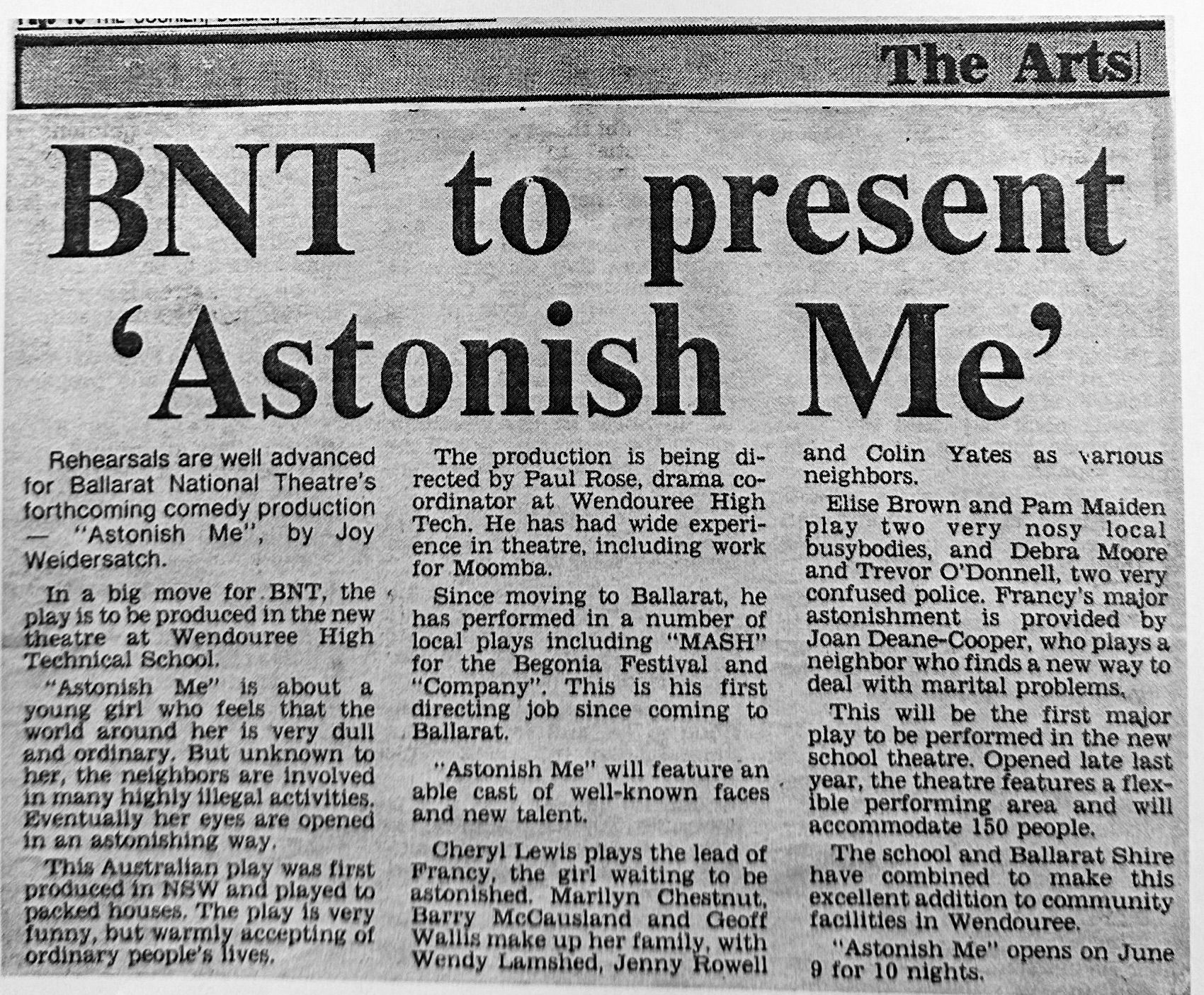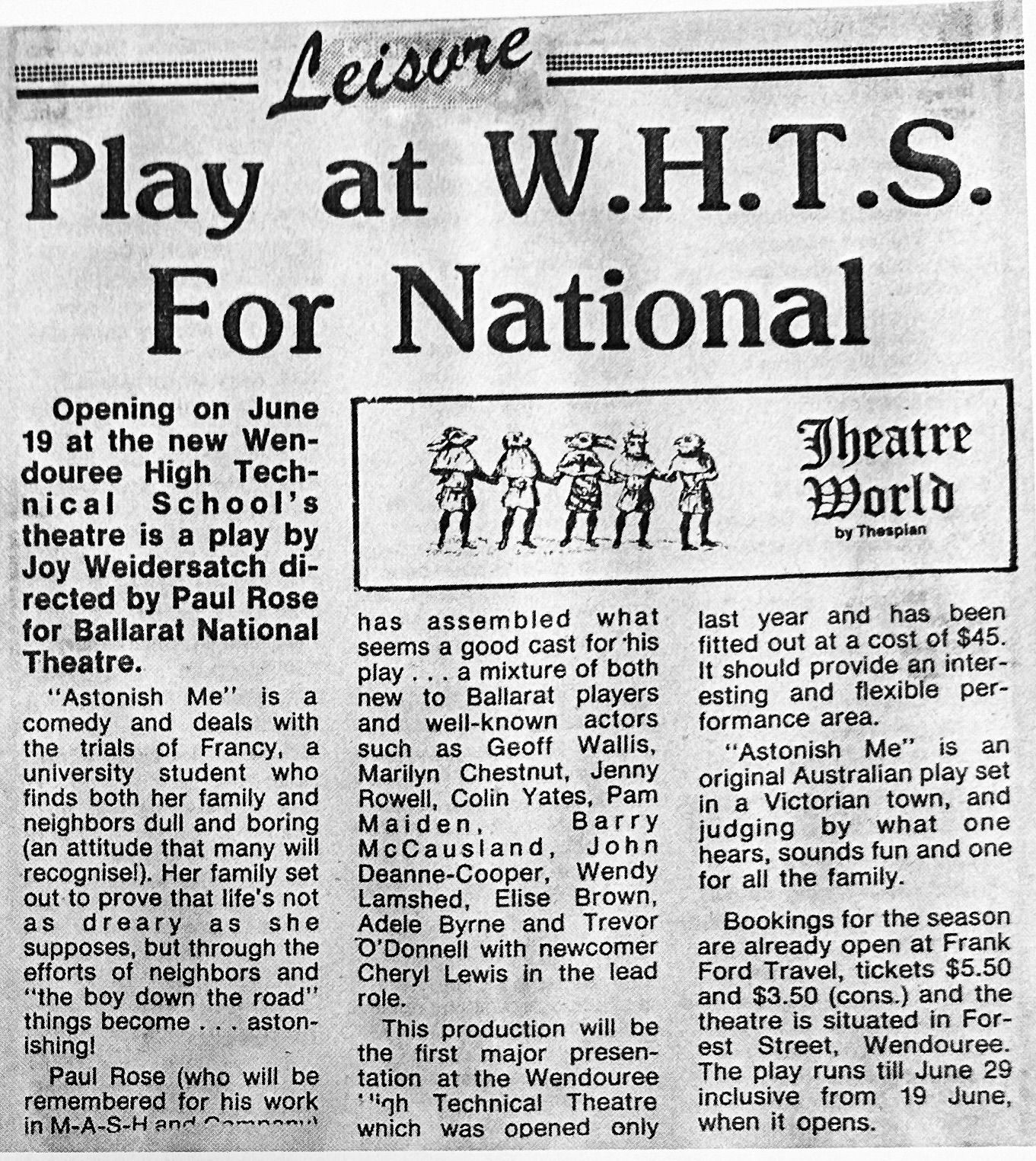 This production marks the opening of the new Theatre complex of the Wendouree High Technical School. Ballarat National Theatre congratulates the School on this fine theatre, together with our good wishes for a long run of theatrical successes.