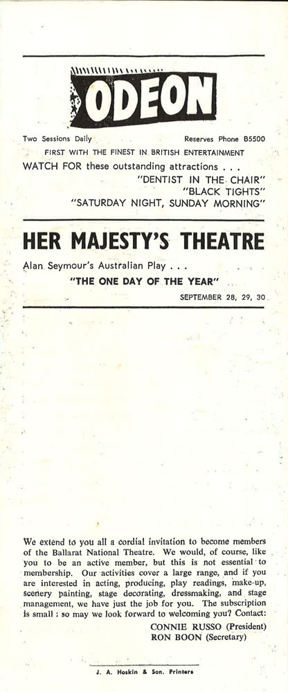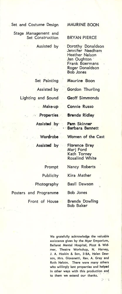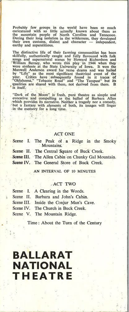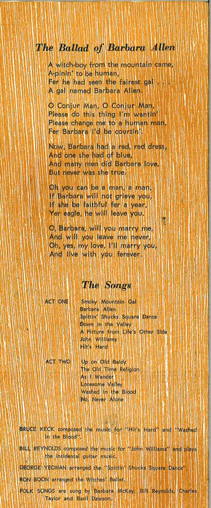 This perennial favorite is based on the haunting folk ballad of "Barbara Allen." Employing a large cast and imaginative settings in the Smoky Mountains, it recounts the story of John, a strange "witch boy" who upon first beholding the beautiful Barbara Allen immediately falls in love. He is given human form to woo and marry her on the condition that she remain true to him. The marriage is consummated and Barbara gives birth to a witch child whom the townspeople destroy in a superstitious frenzy. During a religious revival Barbara is led to betray John thus breaking their spell of love. As she dies, he returns forever to the world of the mountain witches.