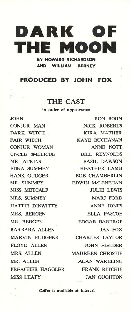 Dark of the Moon is a dramatic stage play by Howard Richardson and William Berney. The play was produced on Broadway in 1945 and was the maiden production of the now acclaimed New York Circle in the Square Theatre in 1951.