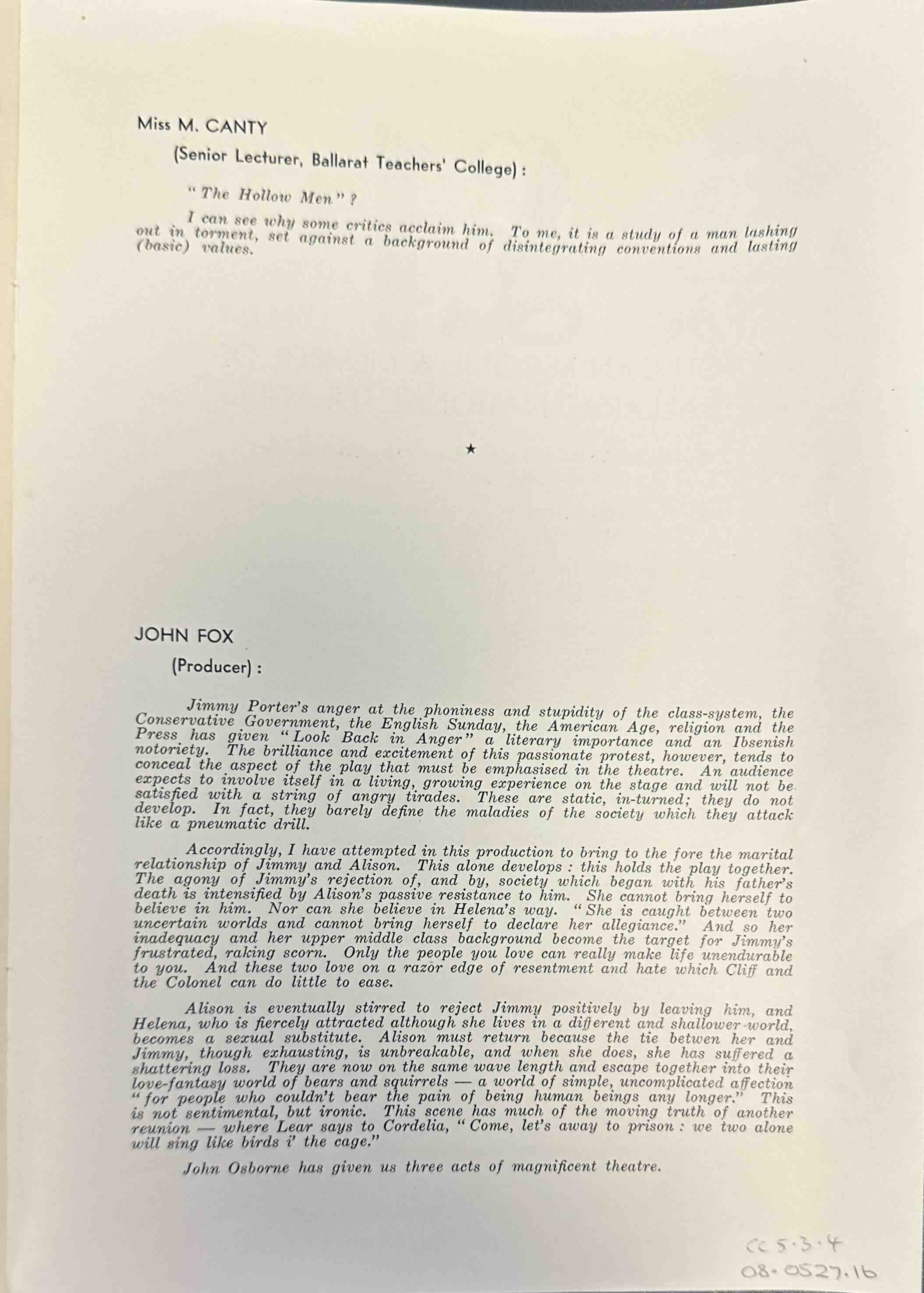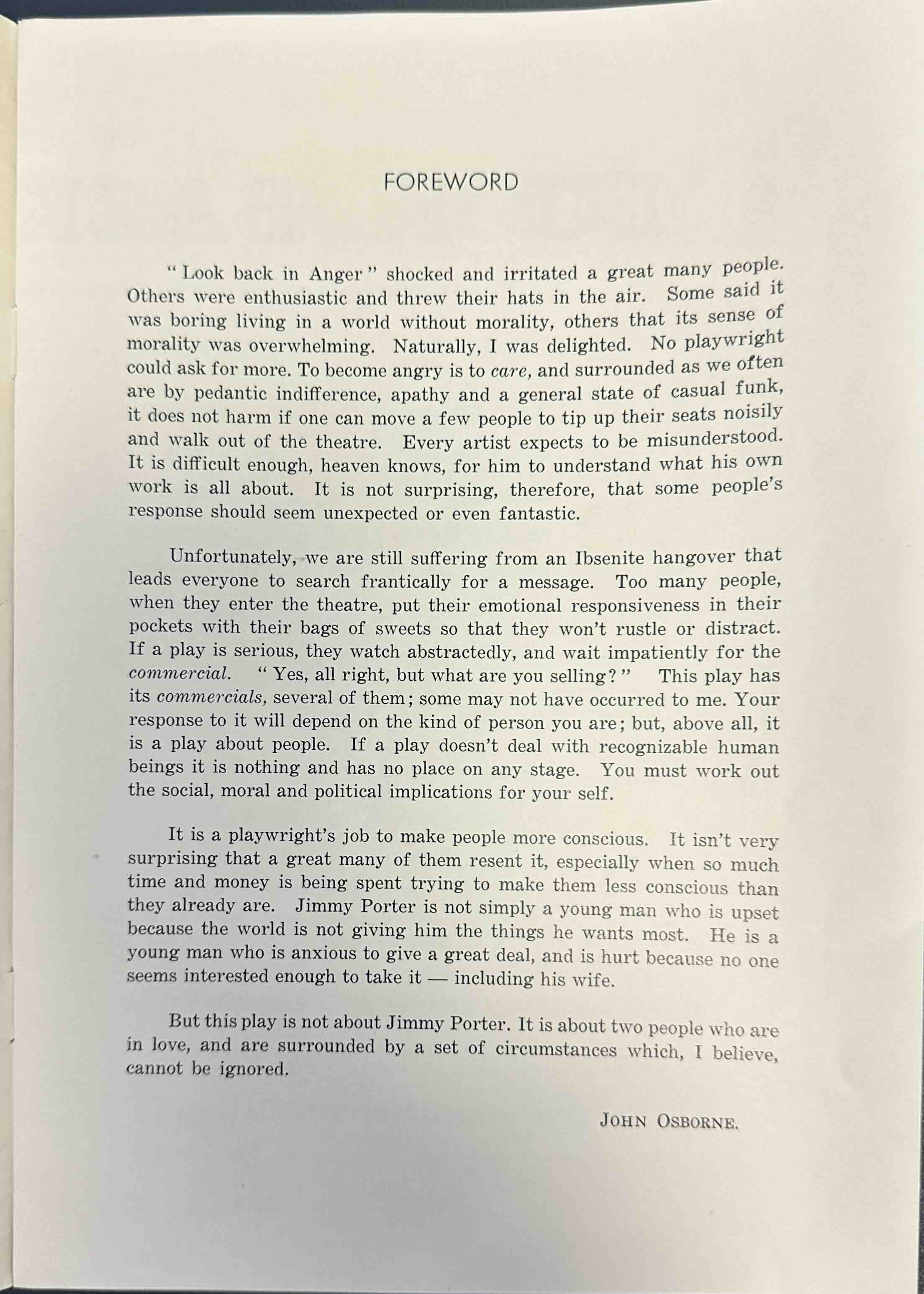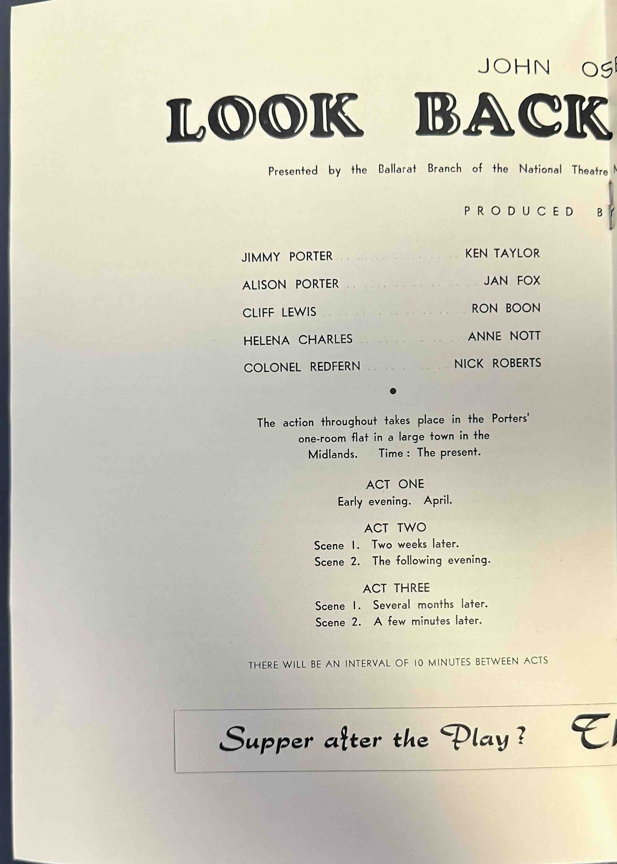 Look Back in Anger (1956) is a realist play written by John Osborne. It focuses on the life and marital struggles of an intelligent and educated but disaffected young man of working-class origin, Jimmy Porter, and his equally competent yet impassive upper-middle-class wife Alison. The supporting characters include Cliff Lewis, an amiable Welsh lodger who attempts to keep the peace; and Helena Charles, Alison's snobbish friend.
