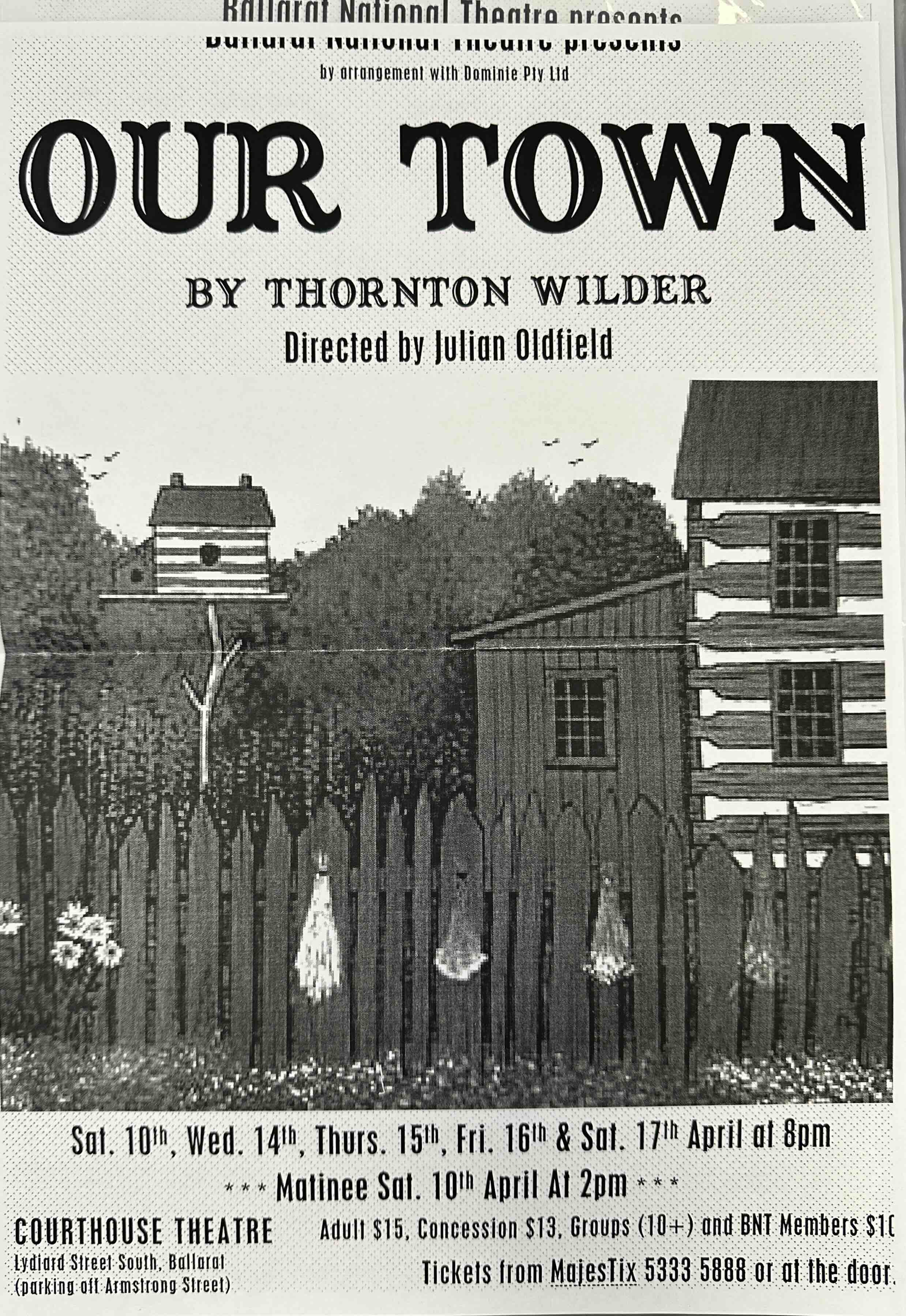 It is not a story of high drama or fast paced action. Rather it is a compassionate and thought provoking exploration of the simple things which make life so worth living. For the audience, as in life, there are chuckles and there are tears. "Our town" is every tow4 peopled with characters played by a talented cast including some of Ballarat's best known performers and some newcomers. Julian Oldfield's direction gives the production a relaxed style and a simple sincerity.