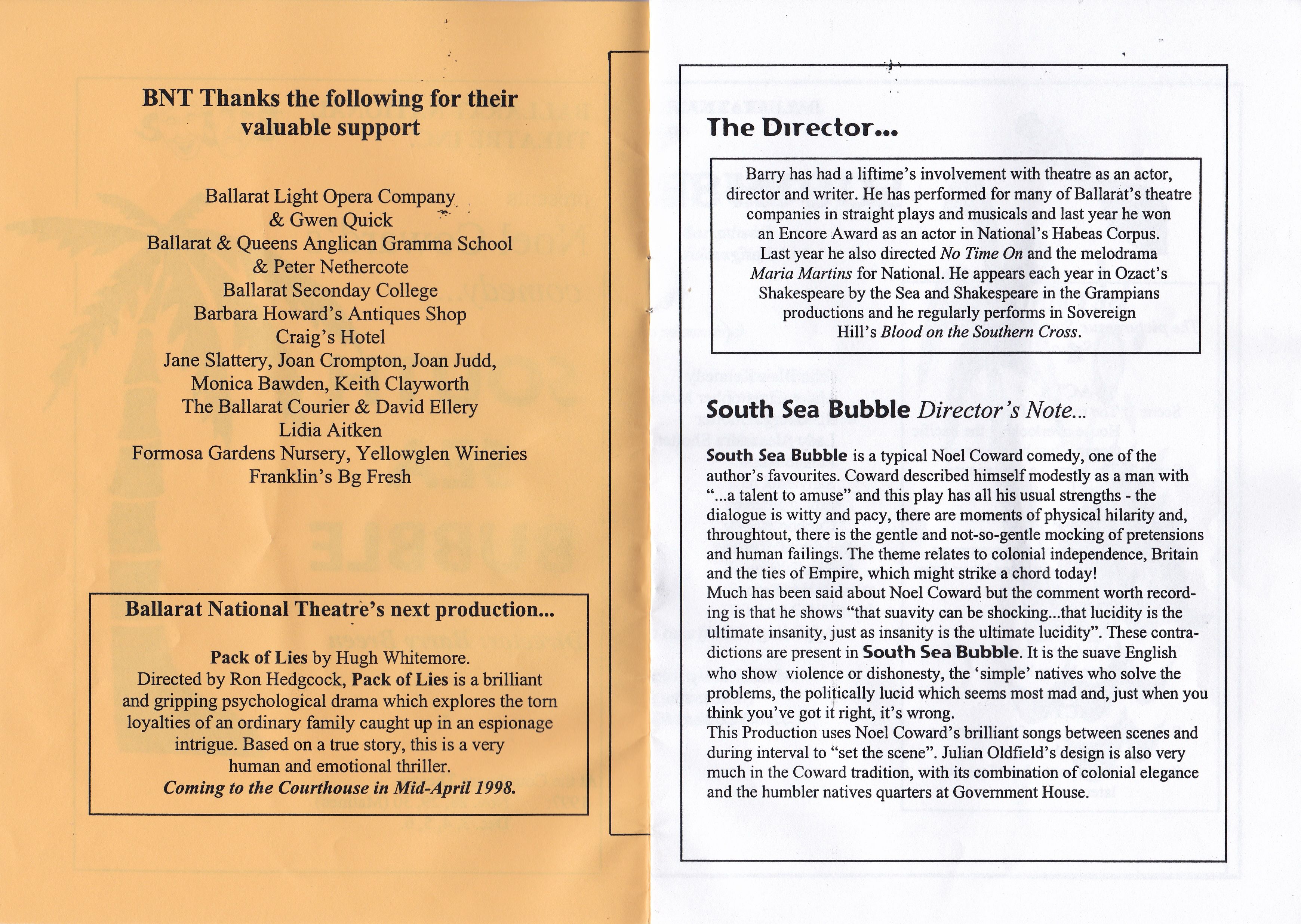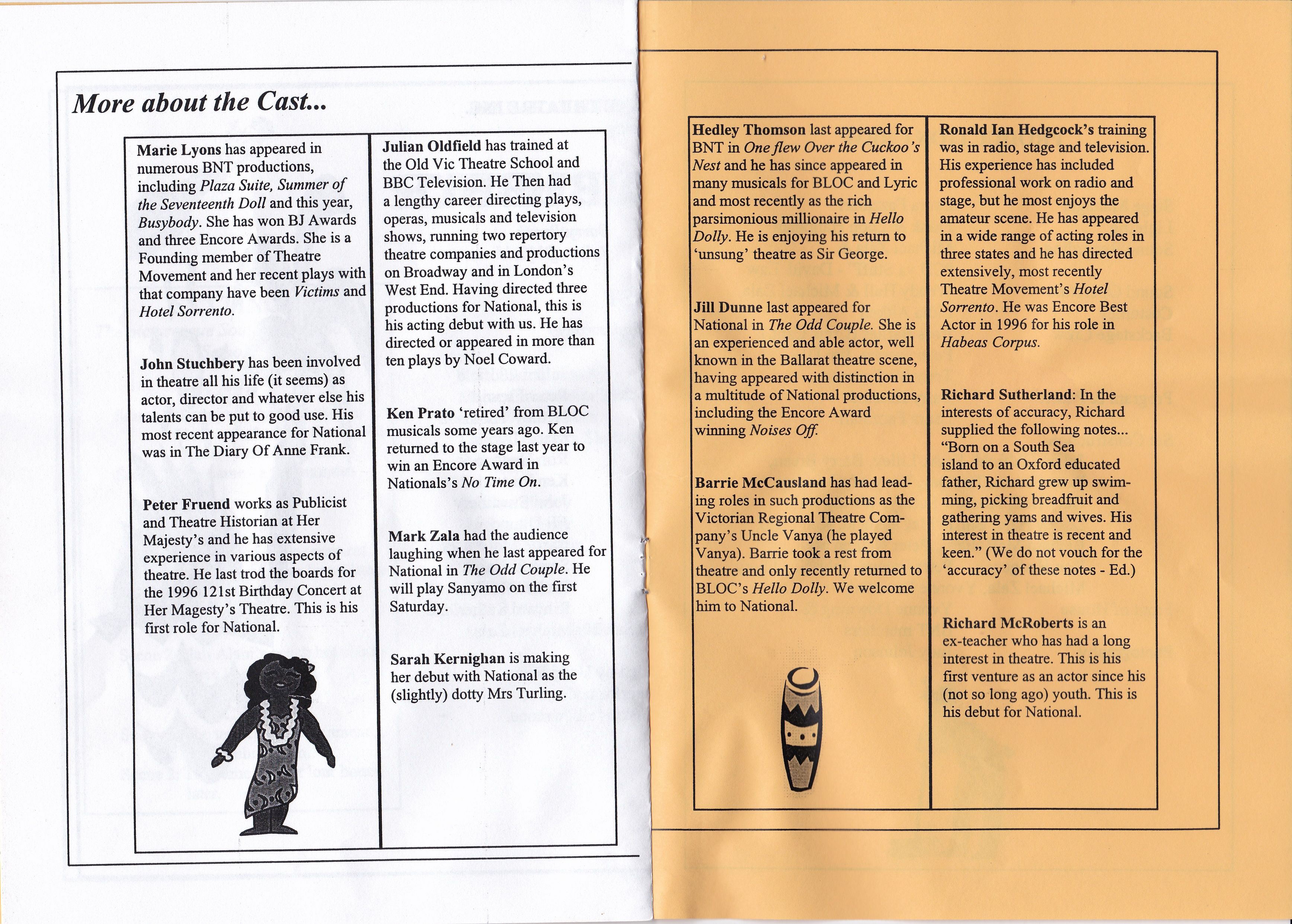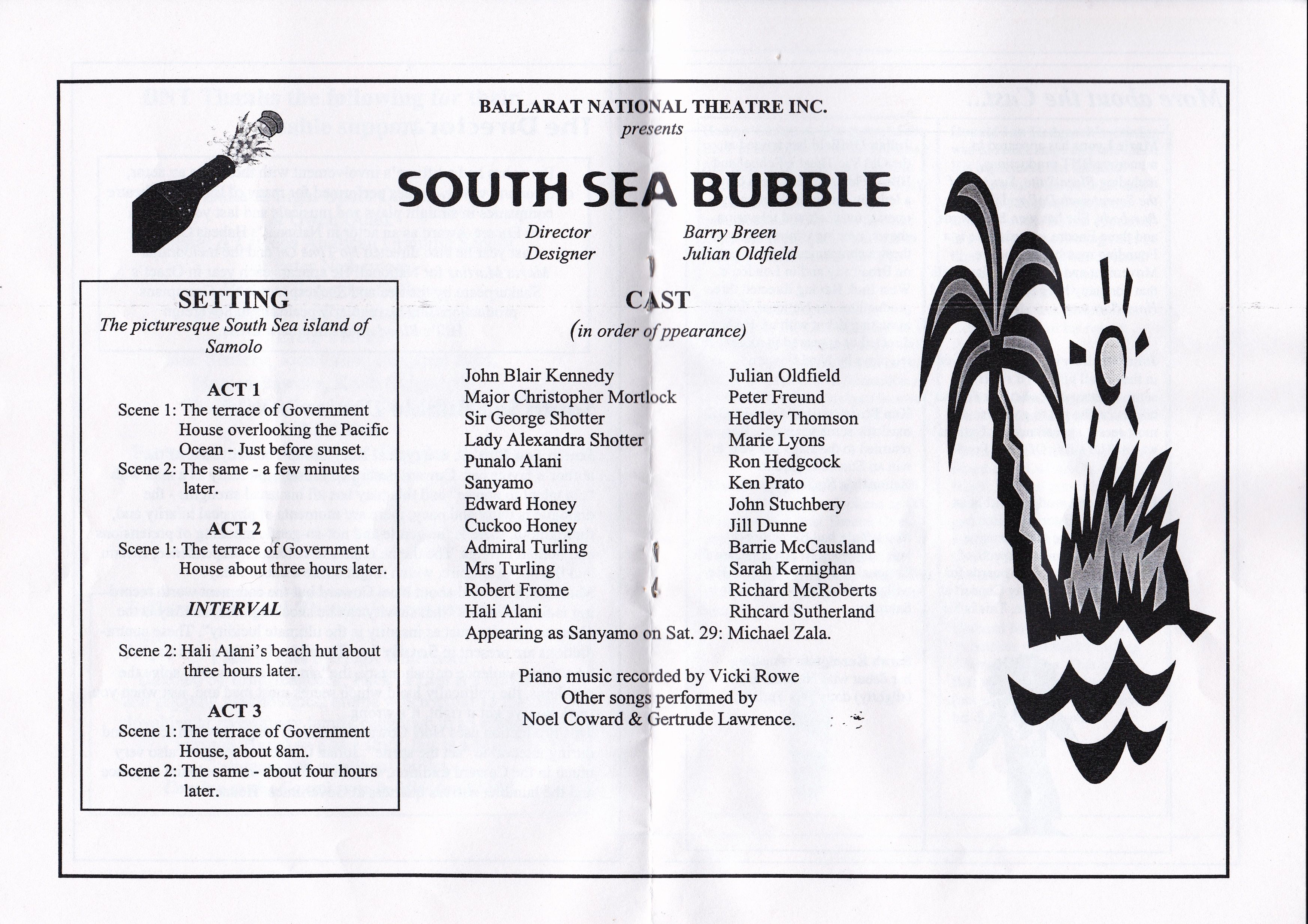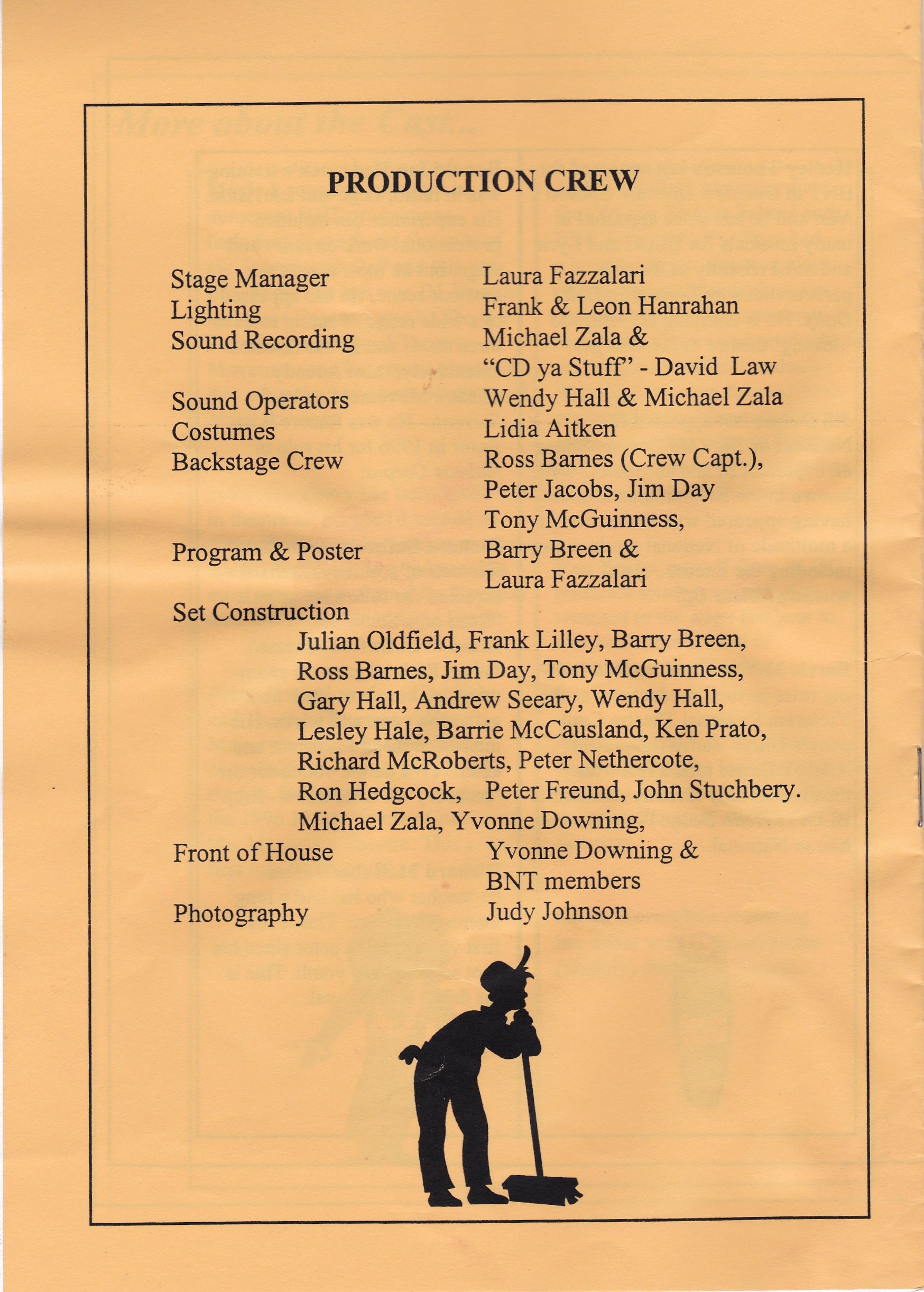Set ConstructionJulian Oldfield, Frank Lilley, Barry Breen, Ross Barnes, Jim Day, Tony McGuinness, Gary Hall, Andrew Seeary, Wendy Hall, Lesley Hale, Barrie McCausland, Ken Prato, Richard McRoberts, Peter Nethercote, Ron Hedgcock, Peter Freund, John Stuchbery, Michael Zala, Yvonne Downing