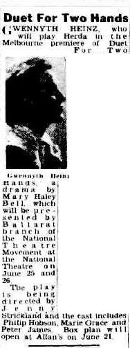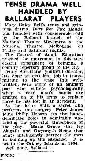 One of four plays by the late English actress, writer and dramatist, Mary Hayley Bell, Duet for Two Hands ran on Broadway in 1947. A classic thriller about a pioneering surgeon and the sinister results of his work.