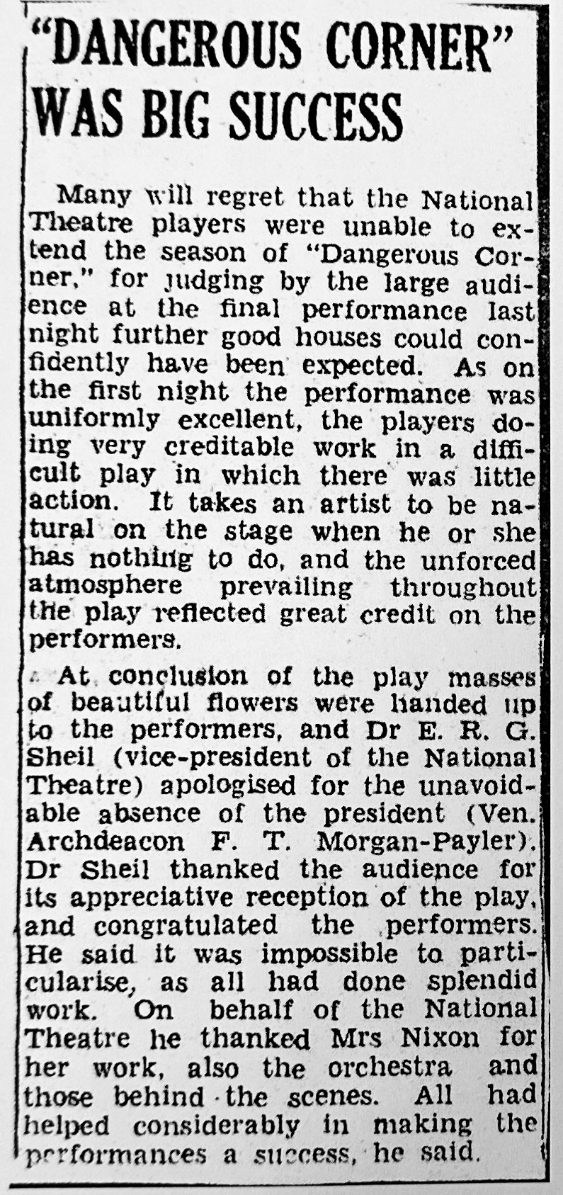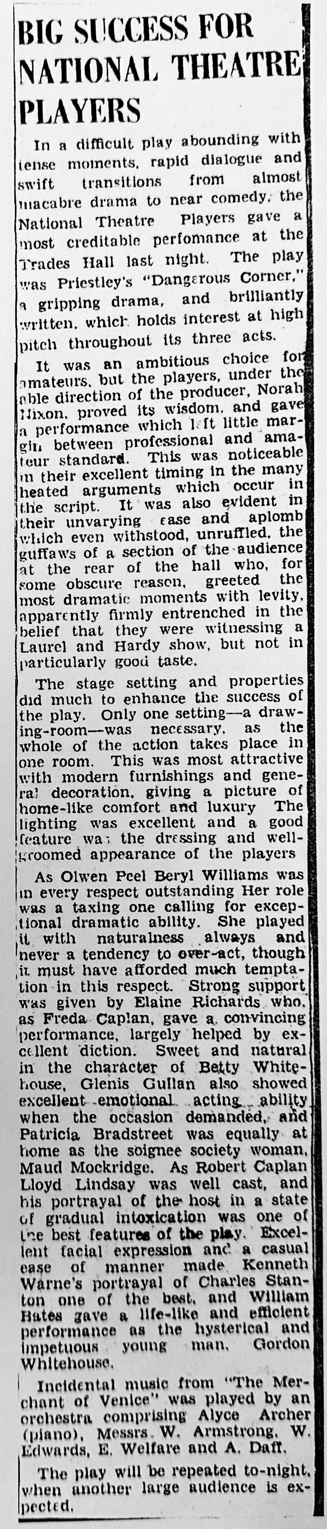 Priestley had recently collaborated with Edward Knoblock on The Good Companions and now wished "to prove that a man might produce long novels and yet be able to write effectively, using the strictest economy, for the stage." While it was praised highly by James Agate, Dangerous Corner received extremely poor reviews and after three days he was told that the play would be taken off, a fate that he averted by buying out the syndicate. It then ran for six months. Priestley's action was further vindicated by the worldwide success the play was to enjoy, although he soon lowered his estimate of this work and as early as 1938 remarked "It is pretty thin stuff when all is said and done."