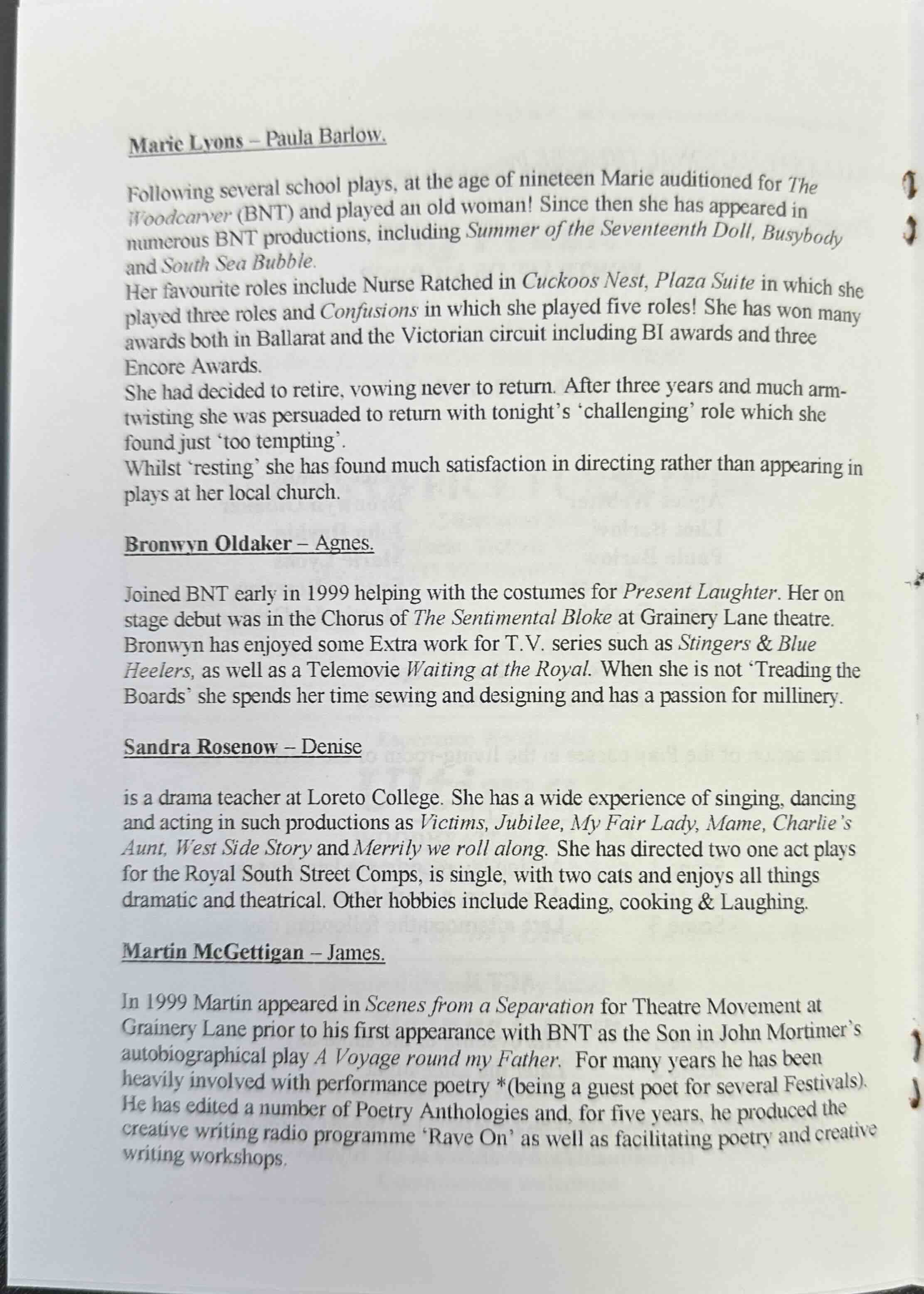 And you will see that virtuoso performance. Marie Lyons plays Mrs Barlow with assurance and grace, with strength and excellent stage presence in all shades of the character. I especially liked her bewildered first entrance and her sharpness and energy as the character in flashback. I read in The Courier that Marie Plans to retire from the stage. Don't do it, Marie! Of the other parts, Peter Freund as the arty neighbour is lively and convincing, Bronwyn Oldaker as the secretary has some nice comic moments, John Daykin is a suitably nasty husband, Sandra Rosenow handles a difficult part well as the lover and Martin McGettigan as the agent is a good foil for the more complex characters. The director, Ron Hedgecock, has developed his diverse cast well, constructing the stage business efficiently (including the flashbacks), building the mystery and moving the play on smoothly to its dramatic and surprising conclusion.