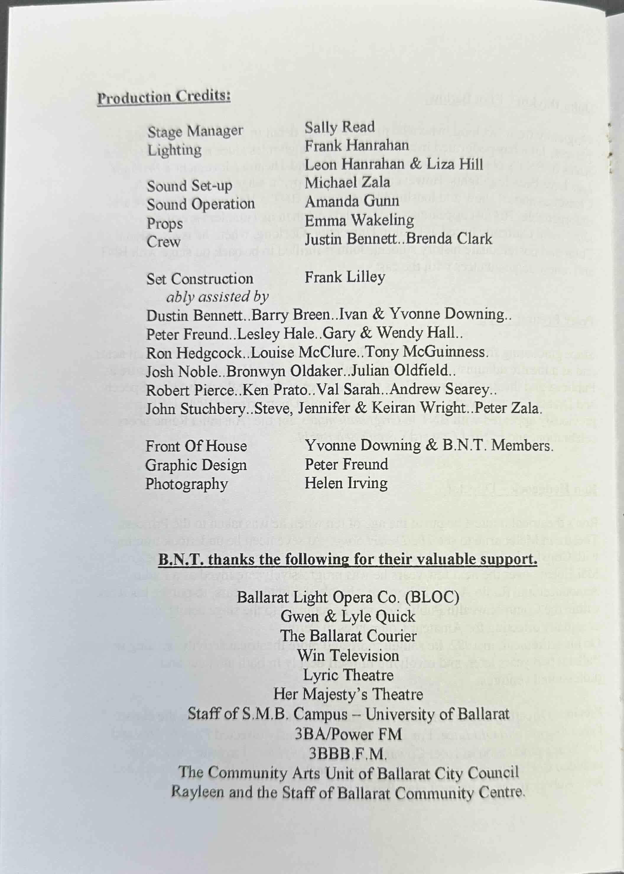 Pre ProductionDustin Bennett, Barry Breen, Ivan & Yvonne Downing, Peter Freund, Lesley Hale, Gary & Wendy Hall, Ron Hedgcock, Louise Mcckure, Tony Mcguinness, Josh Noble, Bronwyn Oldaker, Julian Oldfield, Robert Pierce, Ken Prato, Val Sarah, Andrew Seeary, John Stuchbery, Steve, Jennifer & Keiran Wright, Peter Zala.