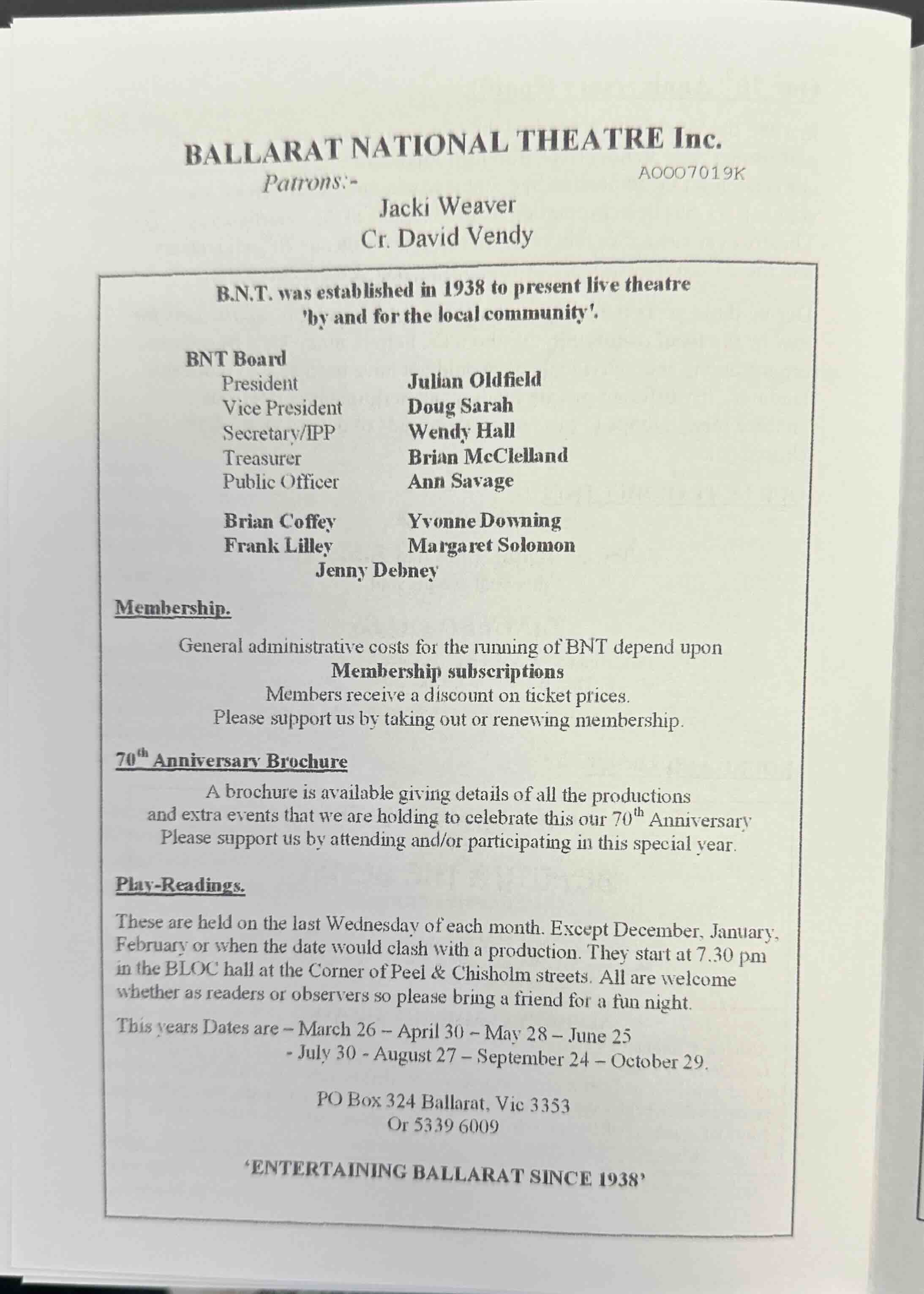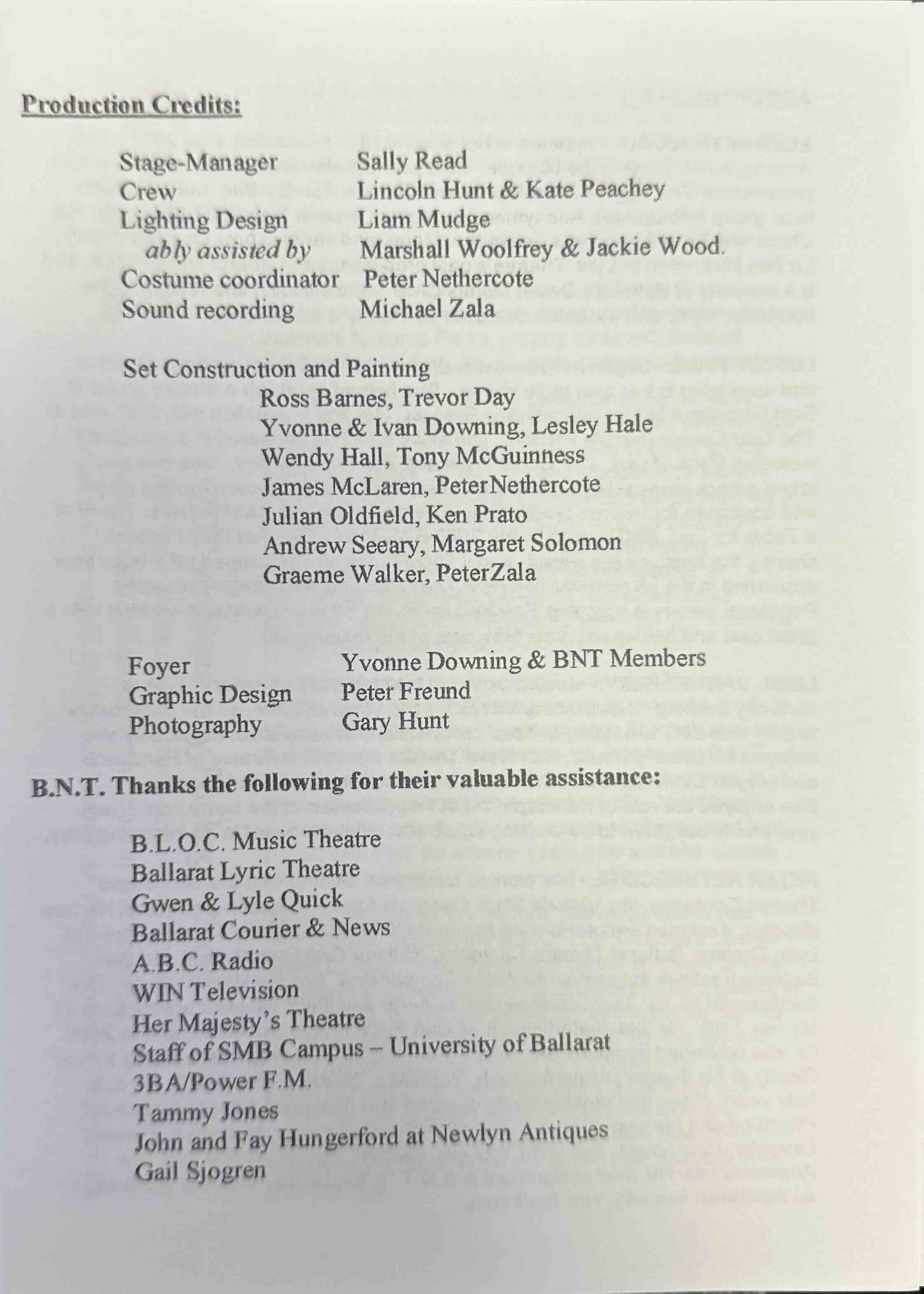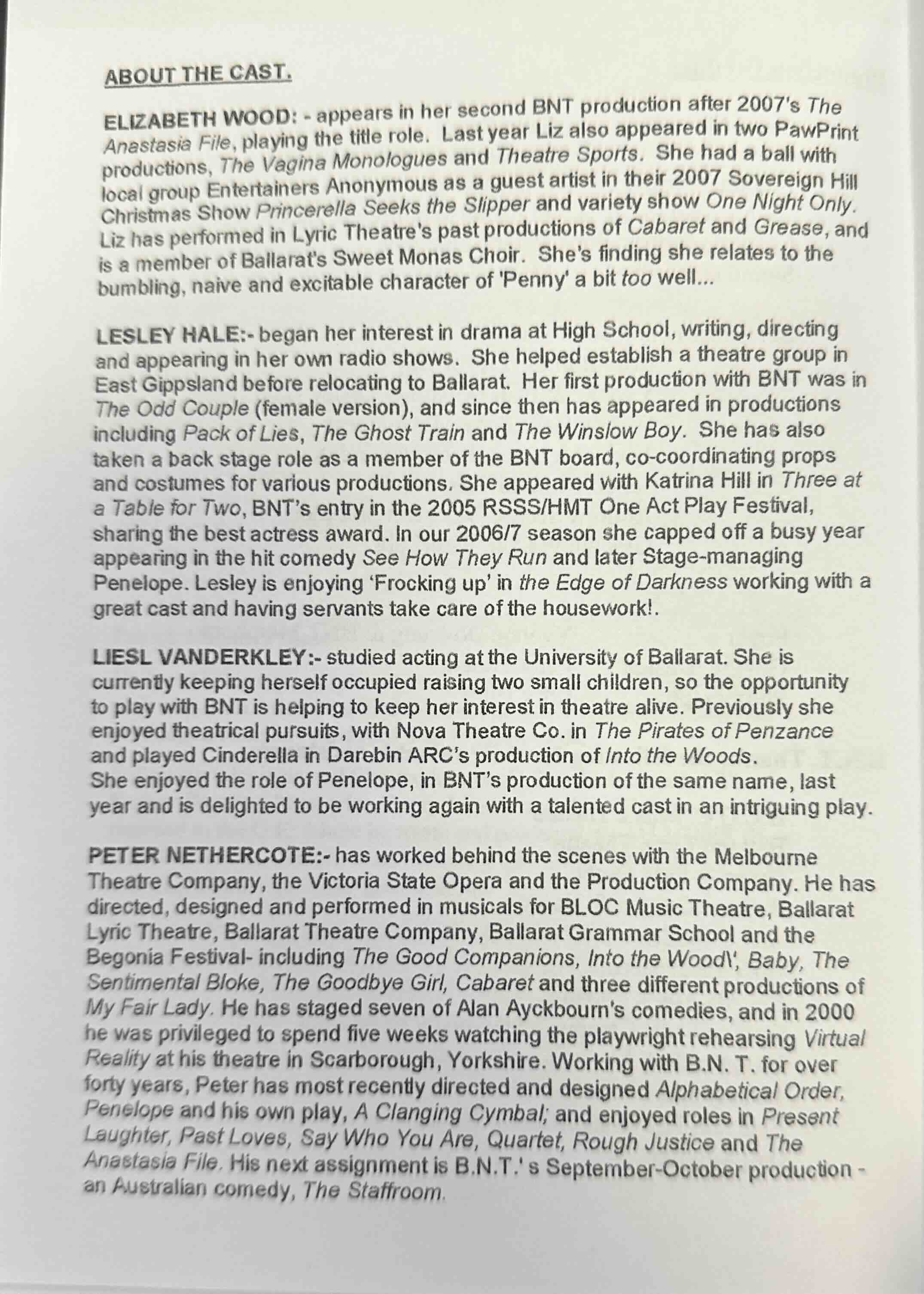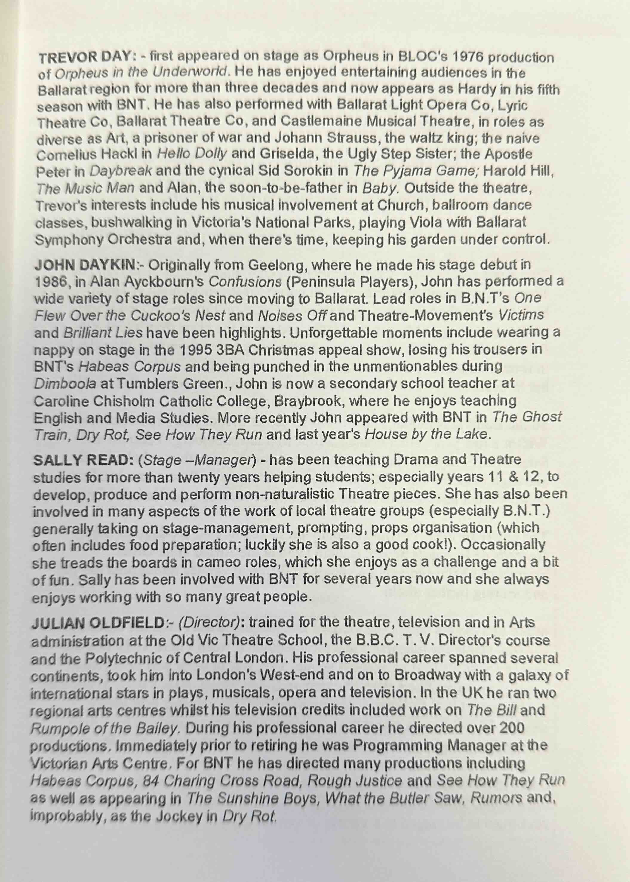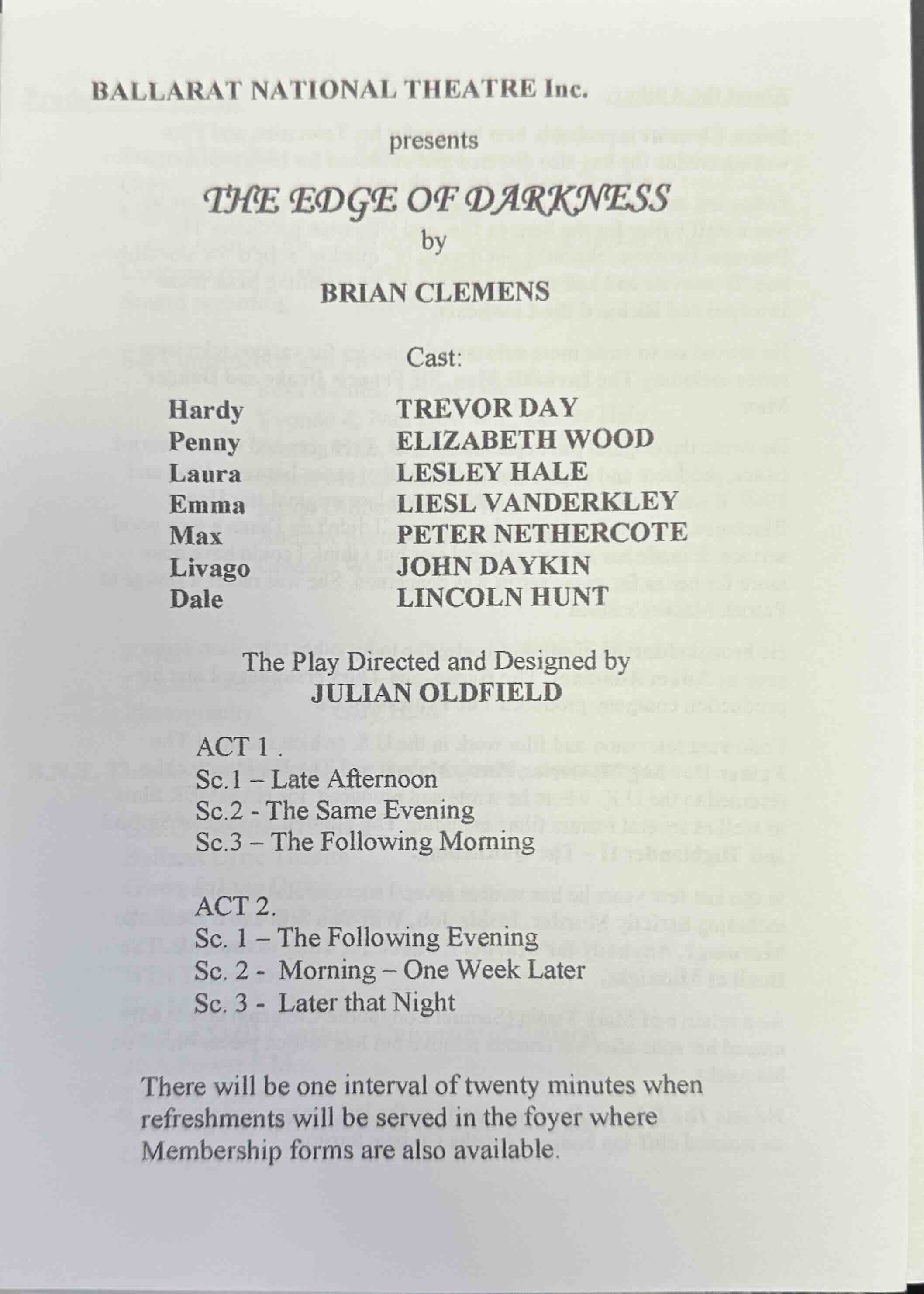 Our cast includes Trevor Day, John Daykin, Lesley Hale, Peter Nethercote, Liesl Vanderkley and Elizabeth Wood.