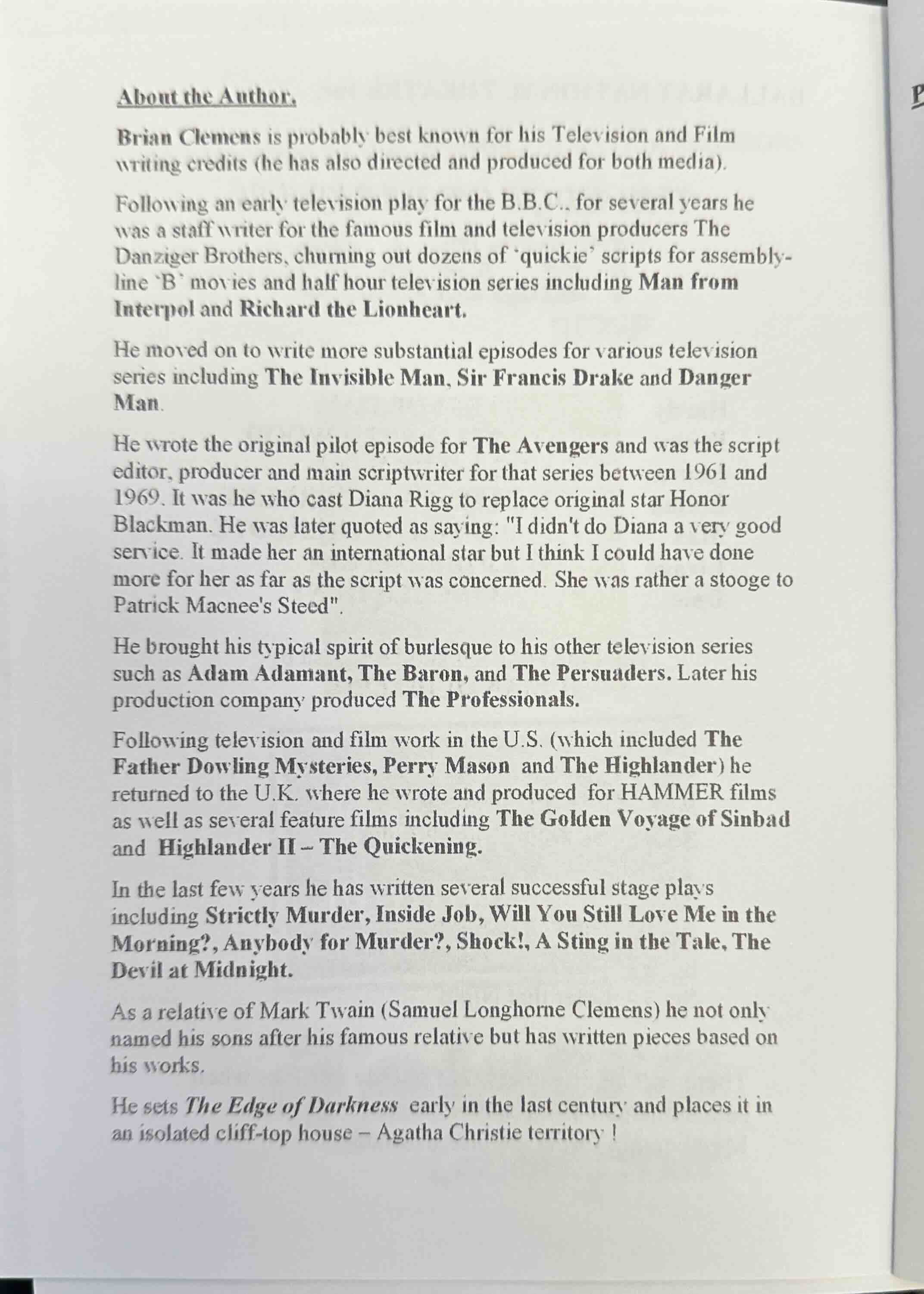 Author Brian Clemens is probably best known for his Television and Film writing credits (he has also directed and produced for both media).