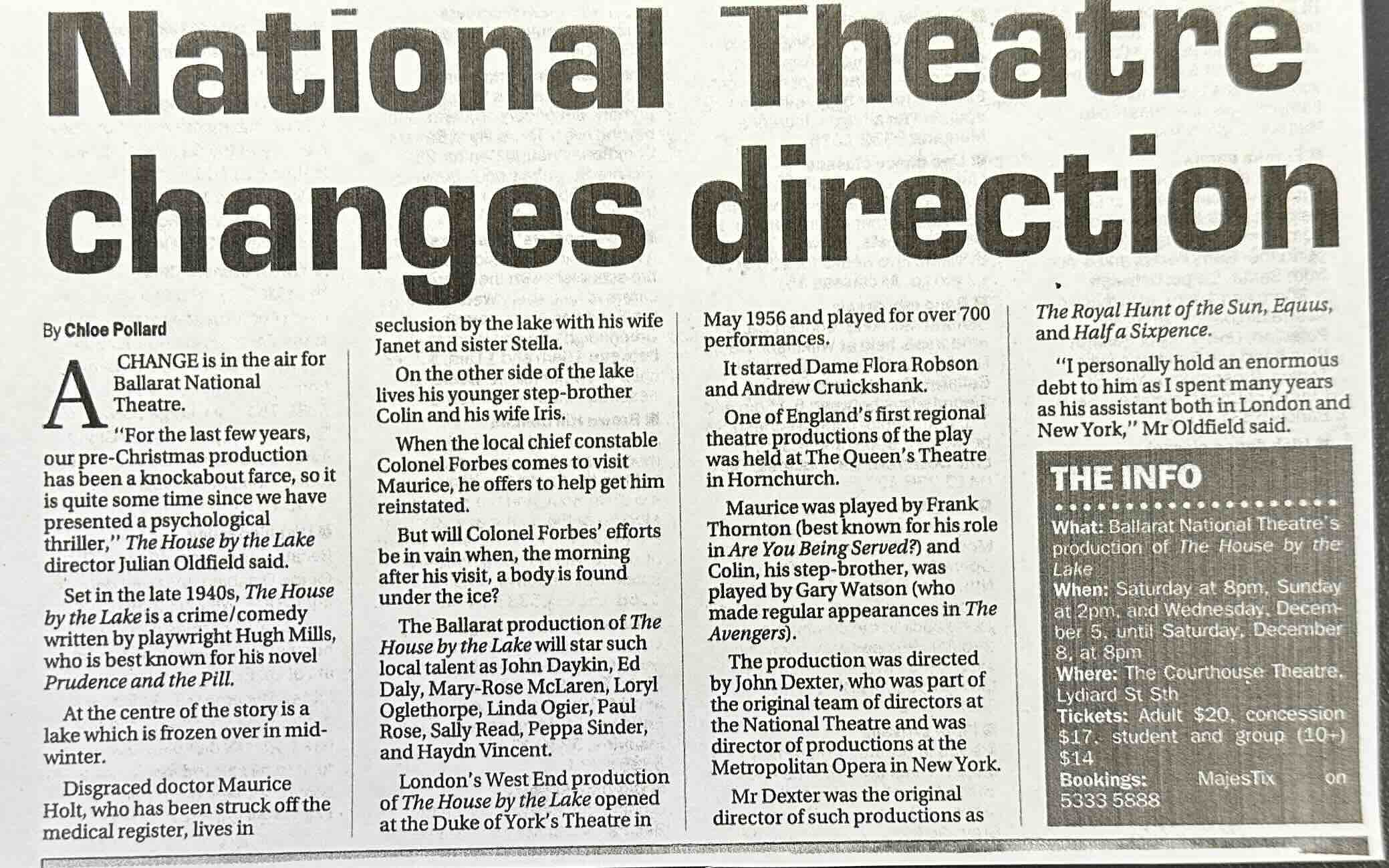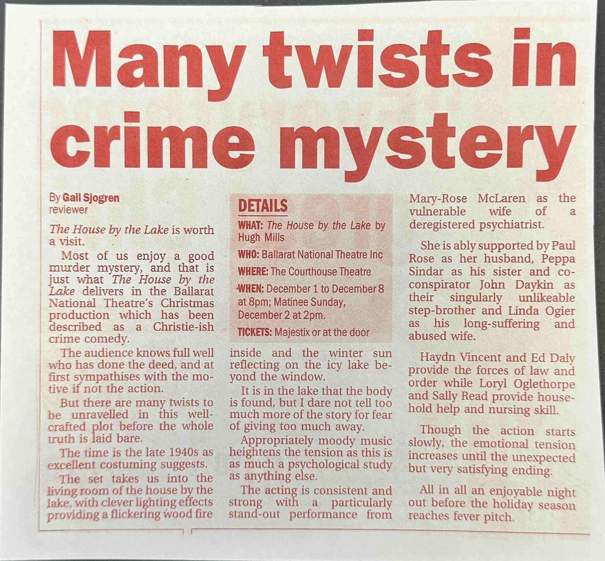 Most of us enjoy a good murder mystery, and that is just what The House by the Lake delivers in the Ballarat National Theatre’s Christmas production which has been described as a “Christie-ish crime comedy”.