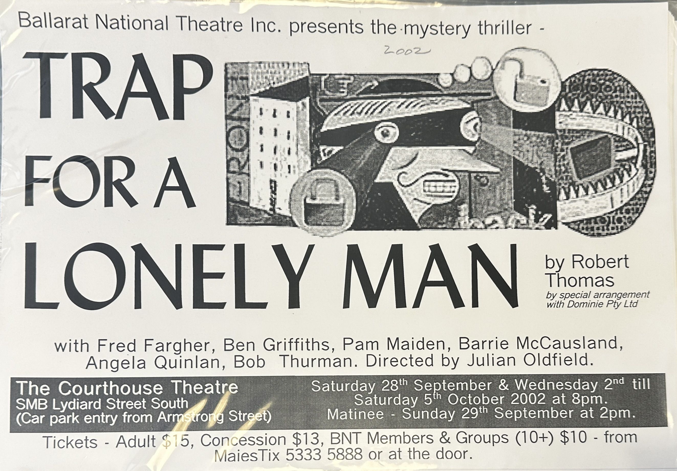 Ballarat National Theatre has found a gem for its production of twentieth century classics well overdue for a Ballarat premiere. Trap For A Lonely Man’ is a milestone in the mystery thriller genre. Its cunning plot and twists of suspense have kept it in continuous production around the world since its 1965 premiere, and it has been adapted for film three times.