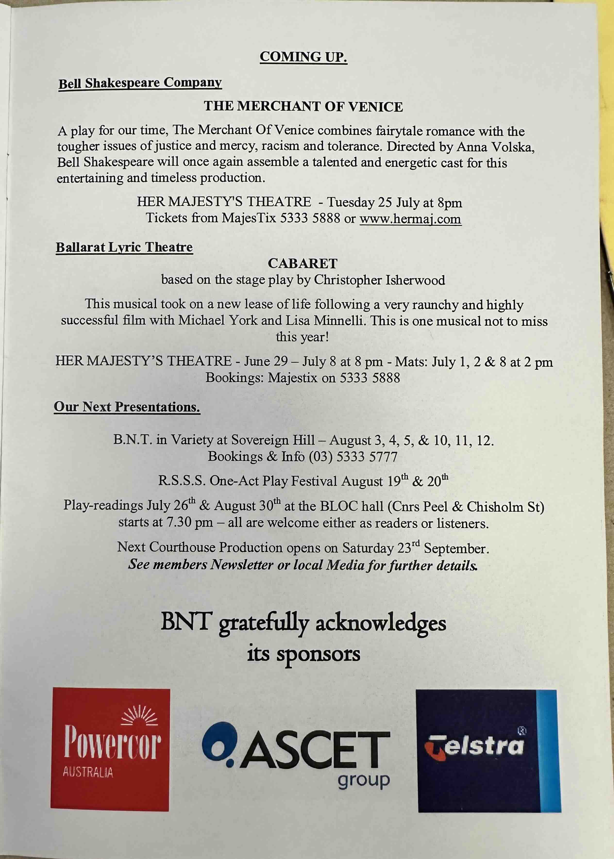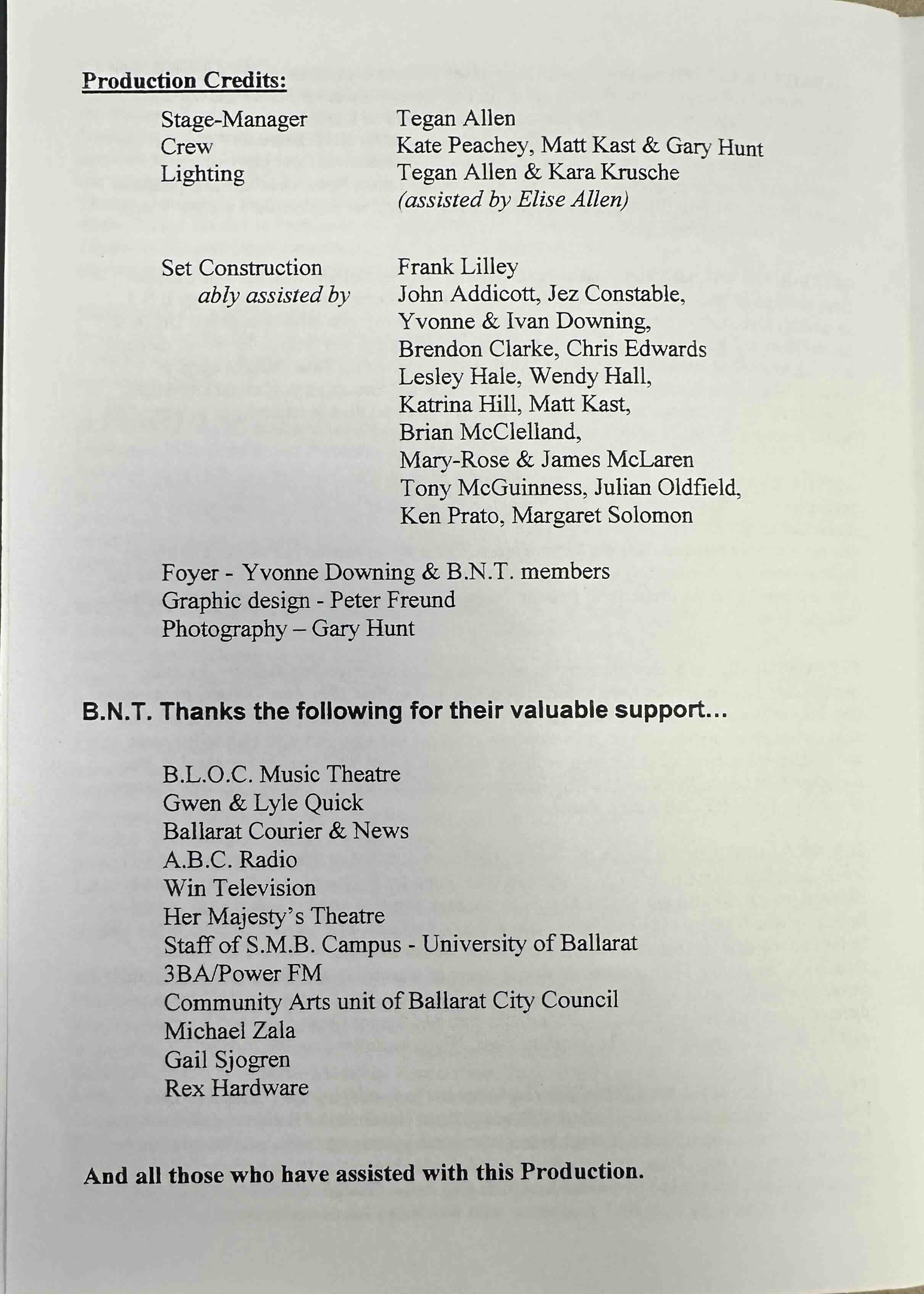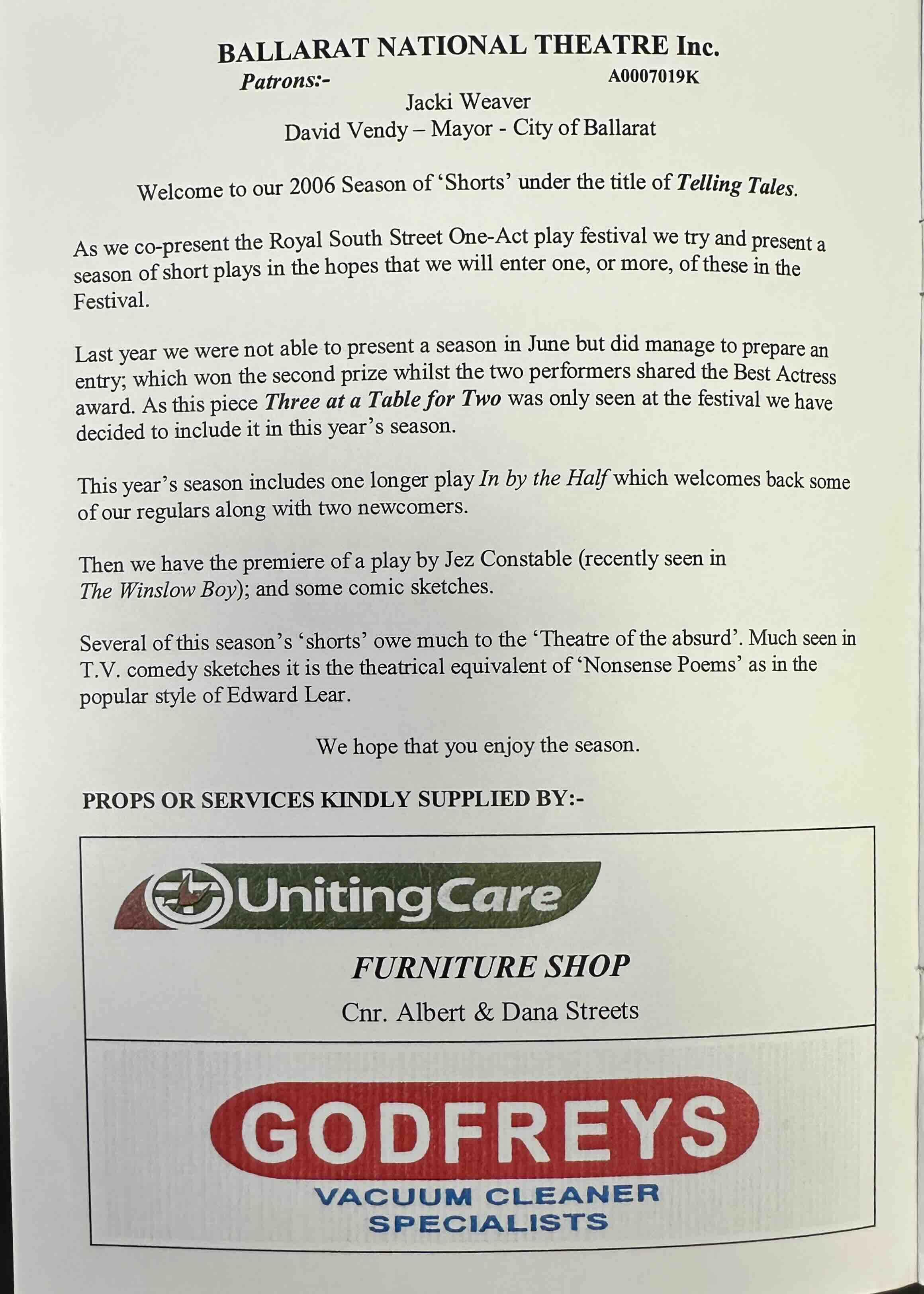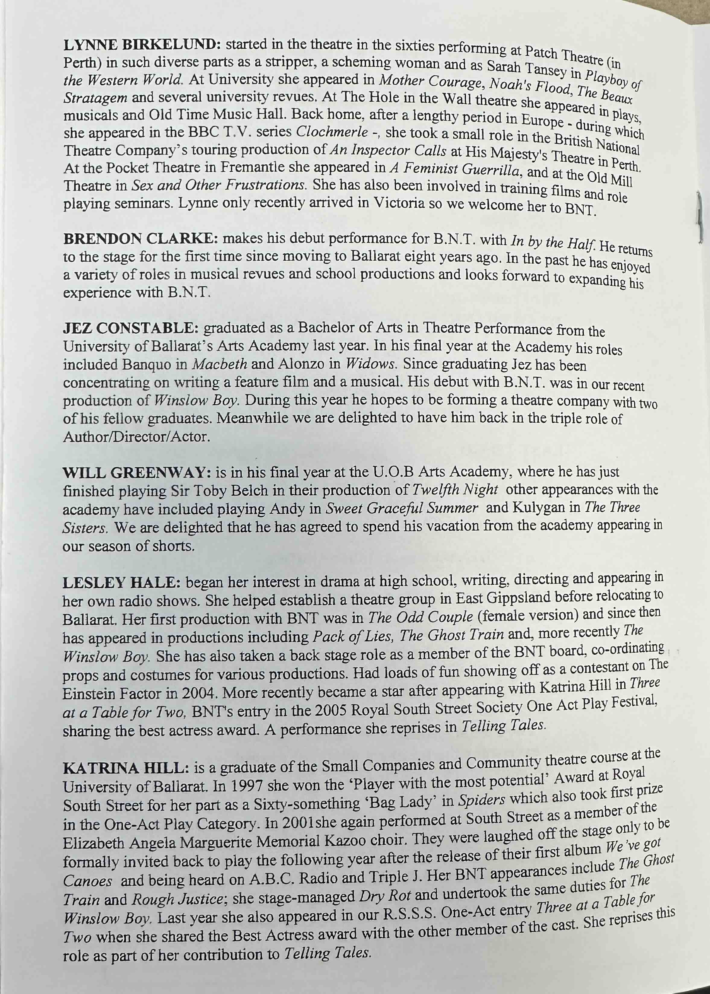 The main character, an elderly actress who refuses to accept retirement gracefully, is played with treat aplomb and touching bravado by Gabrielle Leeds, strongly supported by Lynne Birkelund as her ex-dresser, Peppa Sindar as her daughter, Katrina Hill and Brendon Clarke.