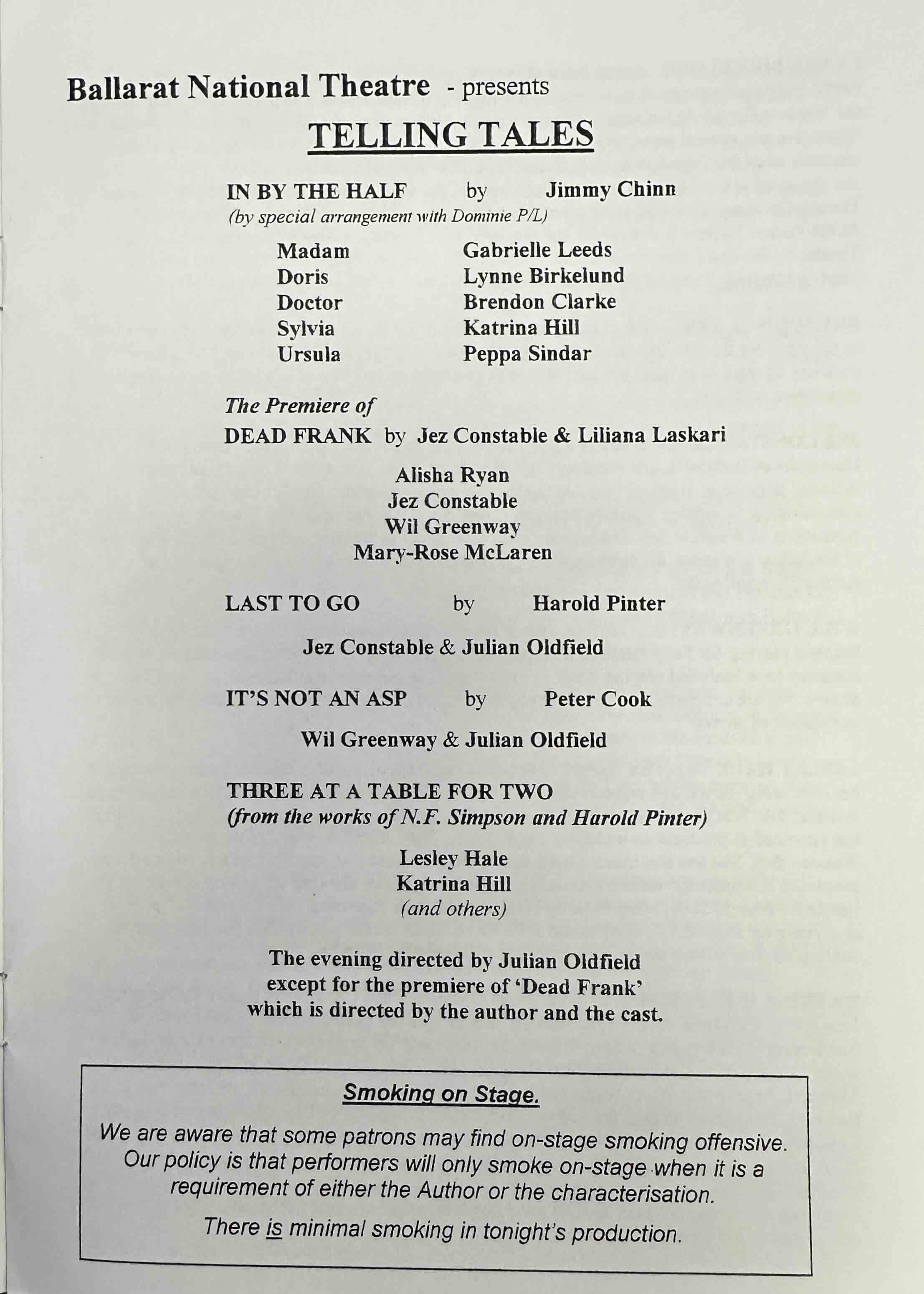 This is truly different, a weird, strange and utterly absorbing piece which gives the actors the opportunity to show their skills, an opportunity they fully embrace. Jez reappears in Last to go by Harold Pinter, with director Julian Oldfield, who follows up with Wil Greenway in lt's not an Asp by Peter Cook. These two pieces are different, highly entertaining and superbly acted.
